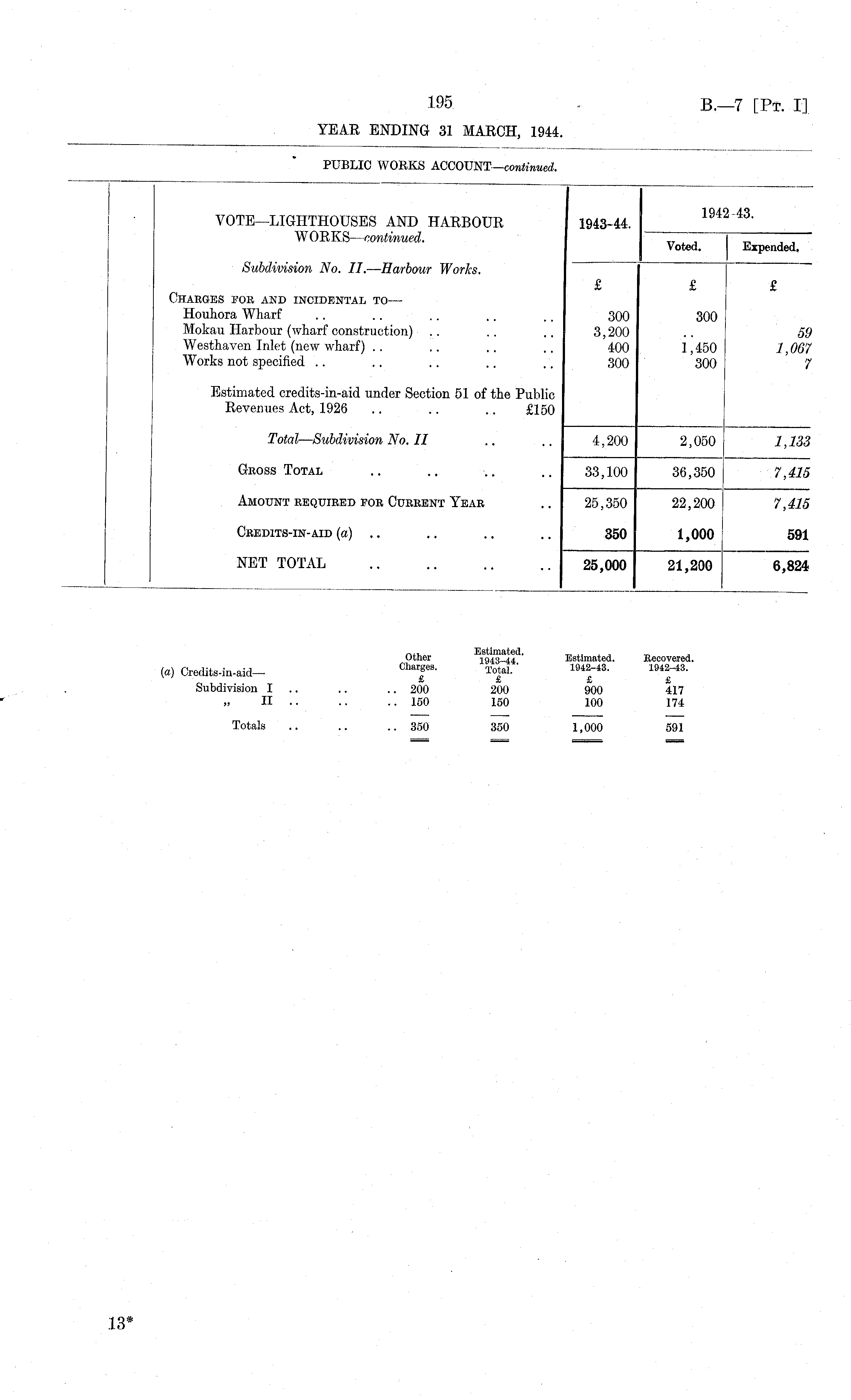 VOTE—LIGHTHOUSES AND HARBOUR 1943-44. 1942-43. WORKS—continued. TT „ Voted. impended. Subdivision No. II. —Harbour Works. £ £ £ Charges foe and incidental to — Houhora Wharf .. .. .. .. .. 300 300 Mokau Harbour (wharf construction) .. .. .. 3,200 .. 59 Westhaven Inlet (new wharf) .. .. .. .. 400 1,450 1,067 Works not specified .. .. .. .. . . 300 300 7 Estimated credits-in-aid under Section 51 of the Public Revenues Act, 1926 .. .. .. £150 Total—SubdivisionNo.il .. .. 4,200 2,050 1,133 GROSS Total .. .. .. .. 33,100 36,350 7,415 Amount required for Current Year .. 25,350 22,200 7,415 Credits-in-aid (a) .. .. .. .. 350 1,000 591 NET TOTAL .. .. .. .. 25,000 21,200 6,824