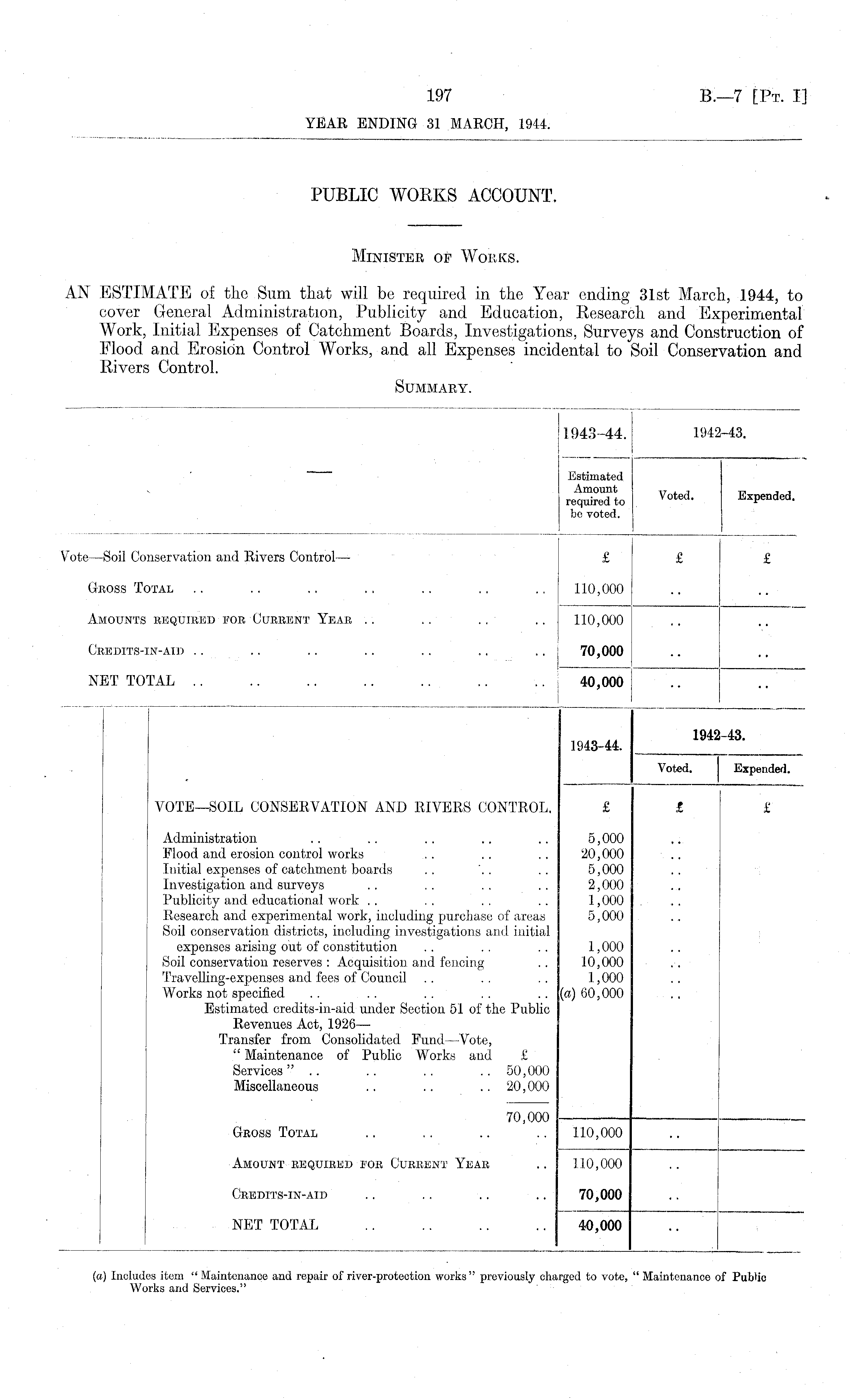 Minister of Works. AN ESTIMATE of the Sum that will be required in the Year ending 31st March, 1944, to cover General Administration, Publicity and Education, Research and Experimental Work, Initial Expenses of Catchment Boards, Investigations, Surveys and Construction of Flood and Erosion Control Works, and all Expenses incidental to Soil Conservation and Rivers Control. Summary.