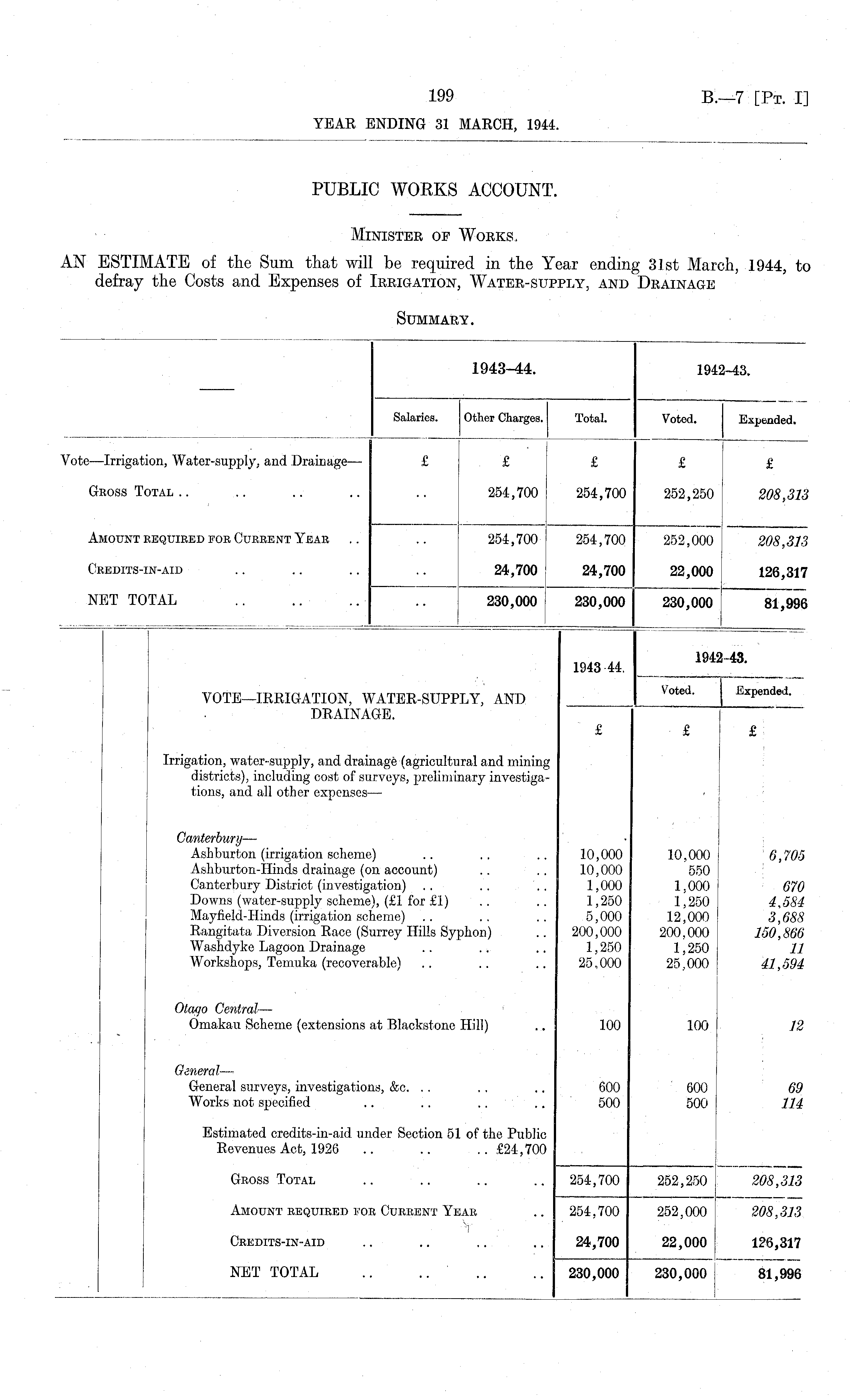 Minister of Works. AN ESTIMATE of the Sum that will be required in the Year ending 31st March, 1944, to defray the Costs and Expenses of Irrigation, Water-supply, and Drainage Summary.