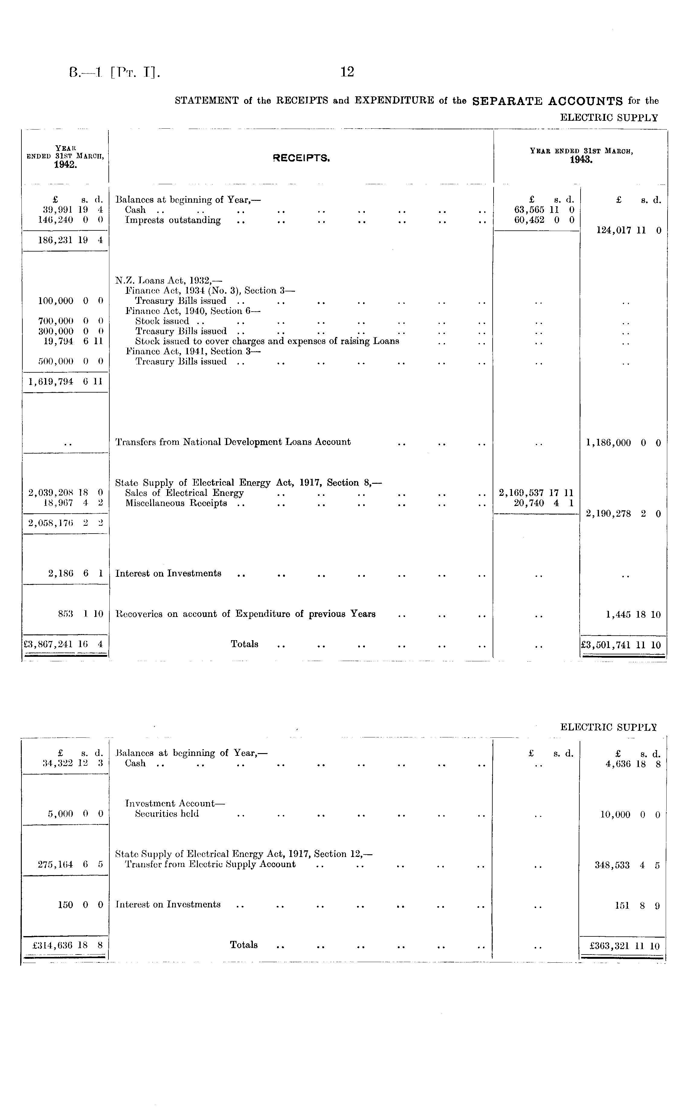 ELECTRIC SUPPLY Y, E *"„. „ Ykak ended 31st Makob, ended 31st March, RECEIPTS. 1943. 1942. £ s. d. Balances at beginning of Year, — £ s. d. £ s. d. 39,99119 4 Cash .. .. .. .. .. .. .. .. .. 63,565 11 0 146,240 0 0 Imprests outstanding .. .. .. .. .. .. 60,452 0 0 124,017 11 0 186,231 19 4 N.Z. Loans Act, 1932, — Finance Act, 1934 (No. 3), Section 3— 100,000 0 0 Treasury Bills issued .. Finance Act, 1940, Section 6— 700,000 0 0 Stock issued .. 300,000 0 0 Treasury Bills issued .. .. .. .. .. .. .. .. . . 19,794 6 11 Stock issued to coyer charges and expenses of raising Loans Finance Act, 1941, Section 3 — 500,000 0 0 Treasury Bills issued .. .. .. .. 1,619,794 6 11 Transfers from National Development Loans Acoount .. .. .. .. 1,186,000 0 0 State Supply of Electrical Energy Aot, 1917, Seotion 8, — 2,039,208 18 0 Sales of Electrical Energy .. .. .. .. .. .. 2,169,537 17 11 18,967 4 2 Miscellaneous Receipts .. .. .. .. .. .. .. 20,740 4 1 2,190,278 2 0 2,058,176 2 2 2,186 6 1 Interest on Investments .. 853 1 10 Recoveries on account of Expenditure of previous Years .. .. .. .. 1,445 18 10 £3,867,241 16 4 Totals .. .. .. .. .. .. .. £3,501,741 11 10 ELECTRIC SUPPLX £ s. d. Balances at beginning of Year, — £ s. d. £ s. d. 34,322 12 3 Cash .. .. .. .. .. .. .. .. .. .. 4,636 18 8 Investment Account— 5,000 0 0 Securities held .. .. .. .. .. .. .. .. 10,000 0 0 State Supply of Electrical Energy Act, 1917, Section 12, — 275,164 6 5 Transfer from Electric Supply Account .. .. .. .. .. .. 348,533 4 5 150 0 0 Interest on Investments .. .. .. .. .. .. .. .. 151 8 9 £314,636 18 8 Totals .. .. .. .. .. .. .. £363,321 11 10