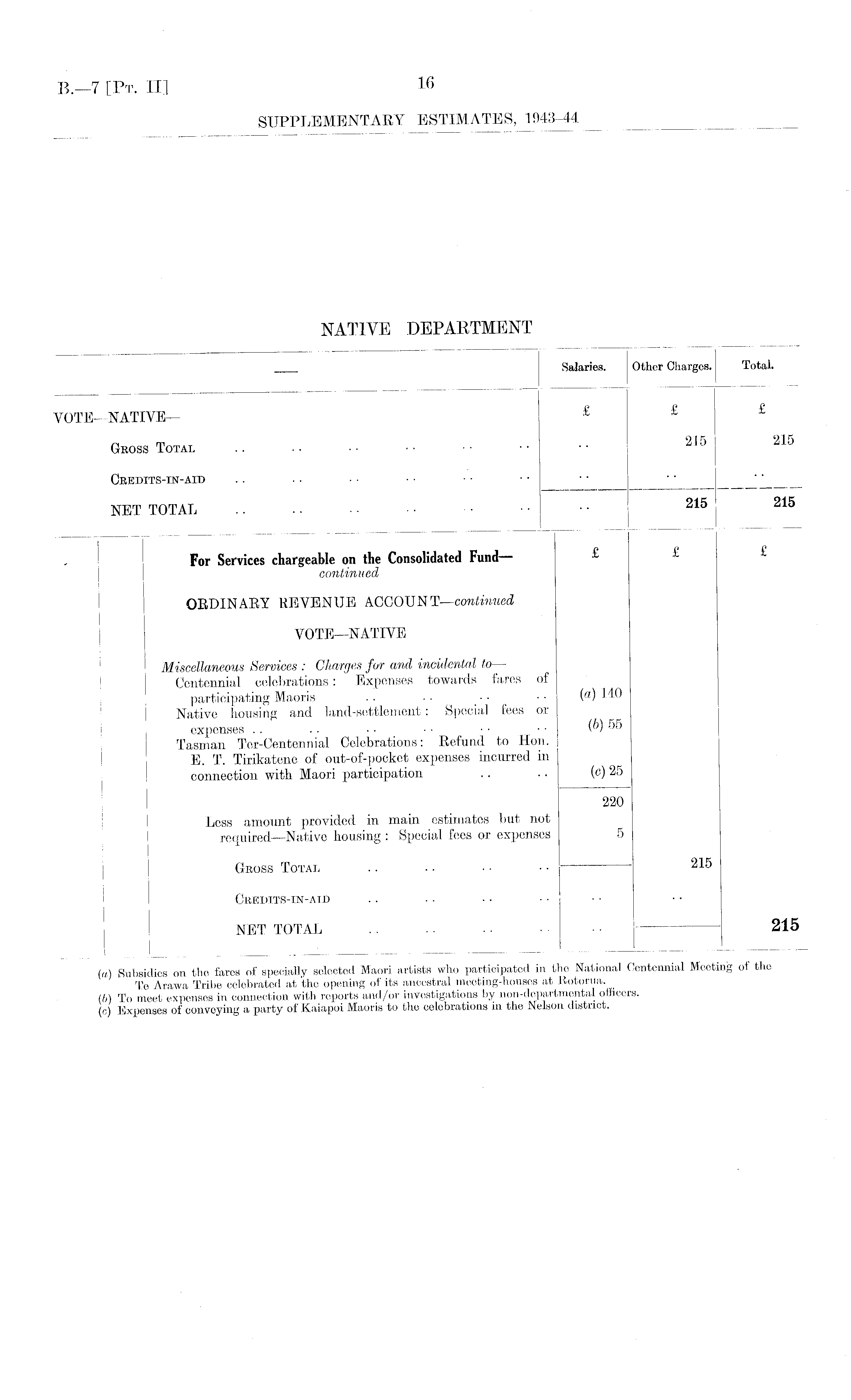 Salaries. Other Charges. Total. VOTE—NATIVE— £ £ £ Gross Total ■ • 215 215 Credits-in-aid NET TOTAL .. • • 215 215 For Services chargeable on the Consolidated Fund continued ORDINARY REVENUE ACCOUNT—continued VOTE—NATIVE Miscellaneous Services : Charges for and incidental to —- Centennial celebrations: Expenses towards fares of participating Maoris .. • ■ • • • • (a) 140 Native housing and land-settlement: Special fees or expenses .. . • • • • • • ■ • • (6) 55 Tasman Ter-Centennial Celebrations: Refund to Hon. E. T. Tirikatene of out-of-pocket expenses incurred in connection with Maori participation .. .. (c) 25 220 Less amount provided in main estimates but not required—Native housing : Special fees or expenses 5 Gross Total .. .. • • ■• 215 . Credits-in-aid NET TOTAL . . .. • • • • • ■ 215