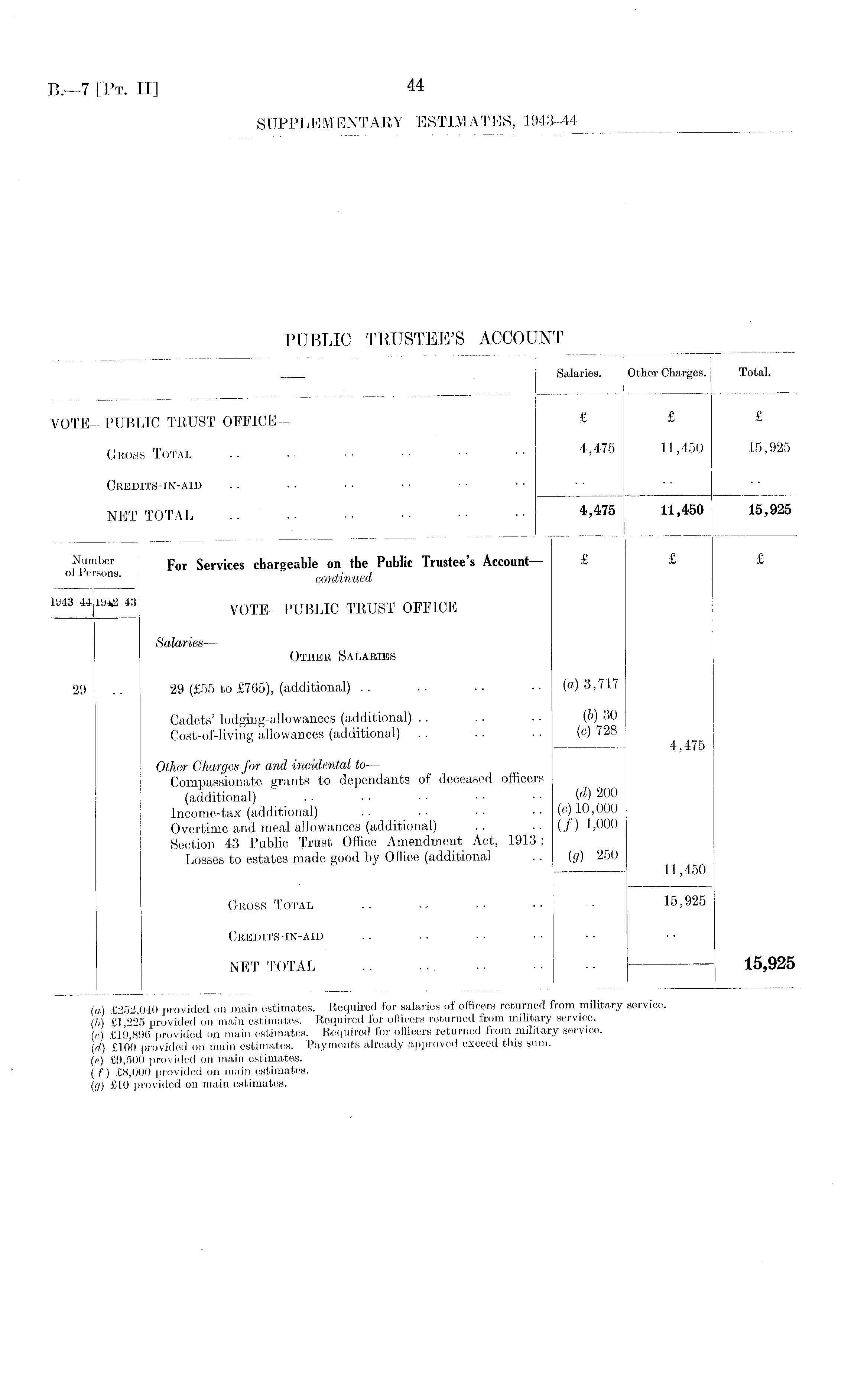 Salaries. Other Charges. Total. I VOTE—PUBLIC TRUST OFFICE- £ £ £ GROSS Total 4.475 11,450 15,925 Ckedits-in-aid NET TOTAL 4,475 11,450 15,925 Number p or Services chargeable on the Public Trustee's Account— £ £ £ oi Per9ons ■ continued I l'J43 43 VOTE—PUBLIC TRUST OFFICE Salaries — Other Salaries 29 .. 29 (£55 to £765), (additional) .. .. •• (a) 3,717 Cadets' lodging-allowances (additional) . . . . • • (b) 30 Cost-of-living allowances (additional) .. .. • • (c) 728 4,475 Other Charges for and incidental to — Compassionate grants to dependants of deceased officers (additional) . . • • • • • • ■ • $) 200 Income-tax (additional) .. •• •• (e) 10,000 Overtime and meal allowances (additional) . . • . (J) 1,000 Section 43 Public Trust Office Amendment Act, 1913 : Losses to estates made good by Office (additional .. (g) 250 11,450 Gross Total .. • • ■ ■ ■ ■ • 15,925 Credits-in-aid NET TOTAL 15,925