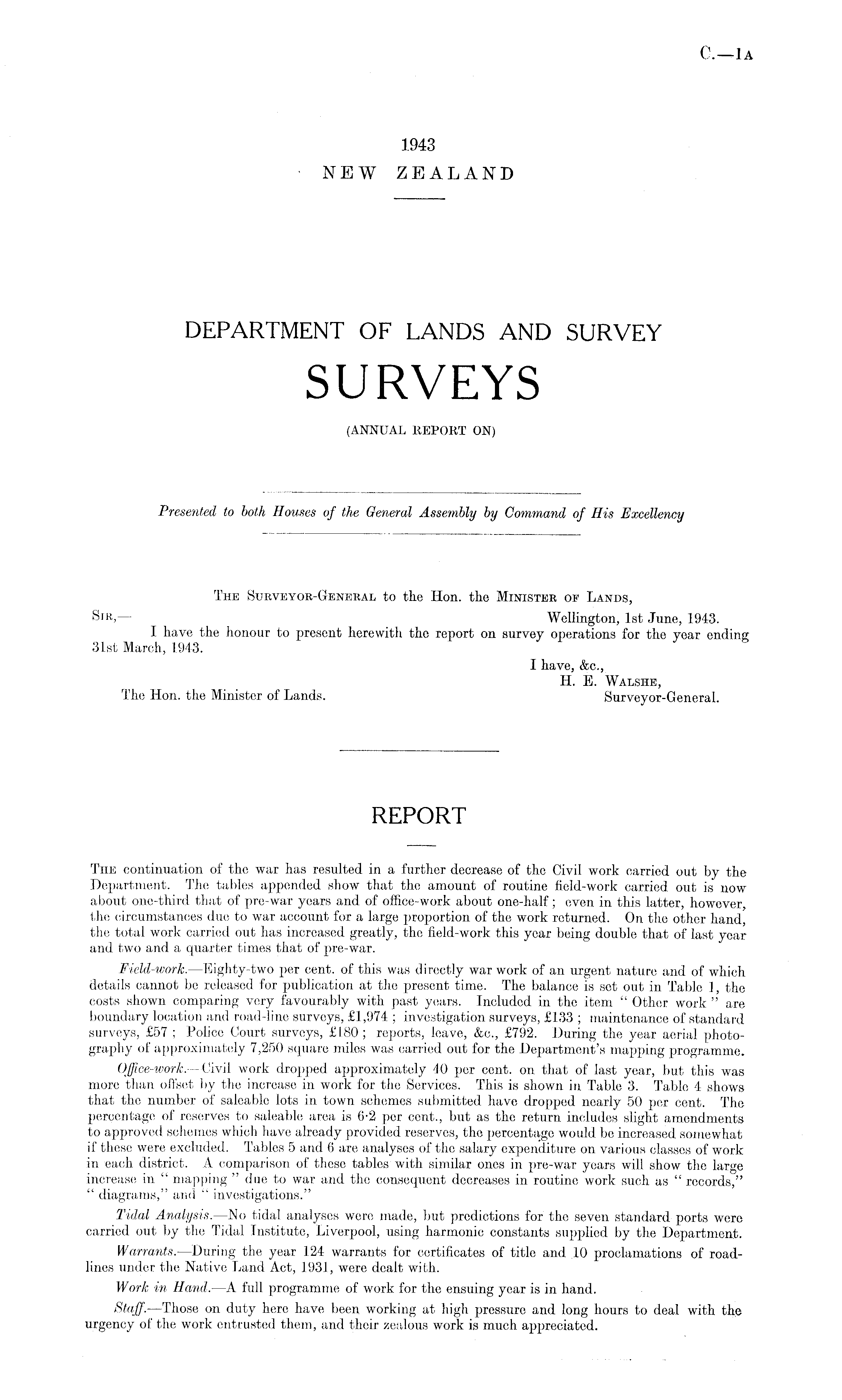 The Surveyor-General to the Hon. the Minister of Lands, Sir, — Wellington, Ist June, 1943. I have the honour to present herewith the report on survey operations for the year ending 31st March, 1943. I have, &c., H. E. Walshe, The Hon. the Minister of Lands. Surveyor-General.