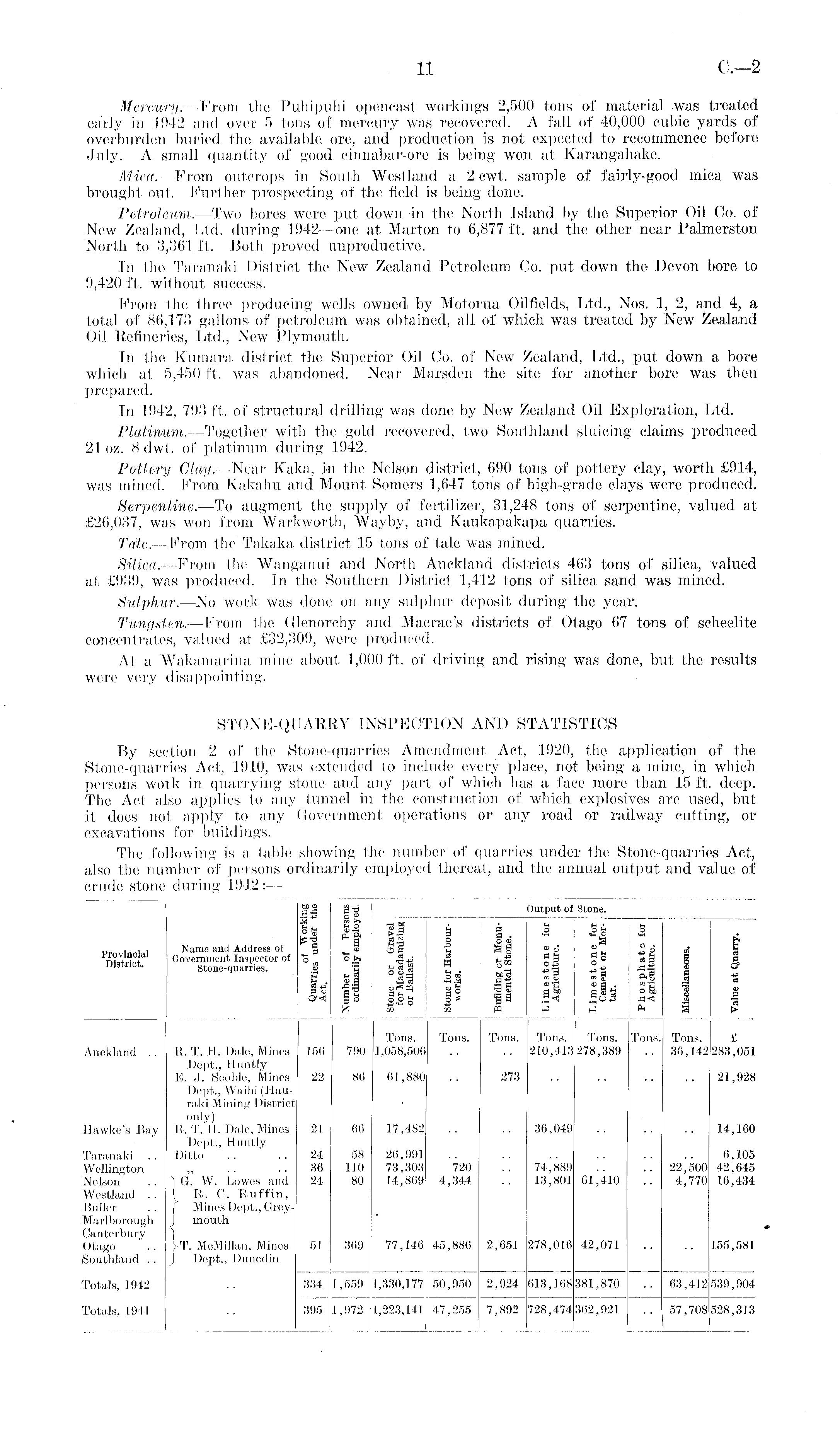 Mercury.- Prom the Puhipuhi opencast workings 2,500 tons of material was treated early in 1942 and over 5 tons of mercury was recovered. A fall of 40,000 cubic yards of overburden buried the available ore, and production is not expected to recommence before July. A small quantity of good cinnabar-ore is being won at Karangahake. Mica,—From outcrops in South Westland a 2 cwt. sample of fairly-good mica was brought out. Further prospecting of the field is being done. Petroleum. —Two bores were put down in the North Island by the Superior Oil Co. of New Zealand, Ltd. during 1942—0ne at Marton to 6,877 ft. and the other near Palmerston North to 3,361 ft. Both proved unproductive. In the Taranaki District the New Zealand Petroleum Co. put down the Devon bore to 9,420 ft. without success. From the three producing wells owned by Motorua Oilfields, Ltd., Nos. 1, 2, and 4, a total of 86,173 gallons of petroleum was obtained, all of which was treated by New Zealand Oil Refineries, Ltd., New Plymouth. In the Kumara district the Superior Oil Co. of New Zealand, Ltd., put down a bore which at 5,450 ft. was abandoned. Near Marsden the site for another bore was then prepared. In 1942, 793 ft. of structural drilling was done by New Zealand Oil Exploration, Ltd. Platinum. —Together with the gold recovered, two Southland sluicing claims produced 21 oz. 8 dwt. of platinum during 1942. Pottery Clay.—Near Kaka, in the Nelson district, 690 tons of pottery clay, worth £914, was mined. From Kakahu and Mount Somers 1,647 tons of high-grade clays were produced. Serpentine.—To augment the supply of fertilizer, 31,248 tons of serpentine, valued at £26,037, was won from Warkworth, Wuyby, and Kaukapakapa quarries. Talc.—From the Takaka district 15 tons of talc was mined. Silica.—From the Wanganui and North Auckland districts 463 tons of silica, valued at £939, was produced. In the Southern District 1,412 tons of silica sand was mined. Sulphur. —No work was done on any sulphur deposit during the year. Tungsten,—From the Cllenorchy and Macrae's districts of Otago 67 tons of scheelite concentrates, valued at £32,309, were produced. At a Wakamarina mine about 1,000 ft. of driving and rising was done, but the results were very disappointing. , STONE-QUARRY INSPECTION AND STATISTICS By section 2 of the Stone-quarries Amendment Act, 1920, the application of the Stone-quarries Act, 1910, was extended, to include every place, not being a mine, in which persons work in quarrying stone and any part of which has a face more than 15 ft. deep. The Act also applies to any tunnel in the construction of which explosives are used, but it does not apply to any Government operations or any road or railway cutting, or excavations for buildings.