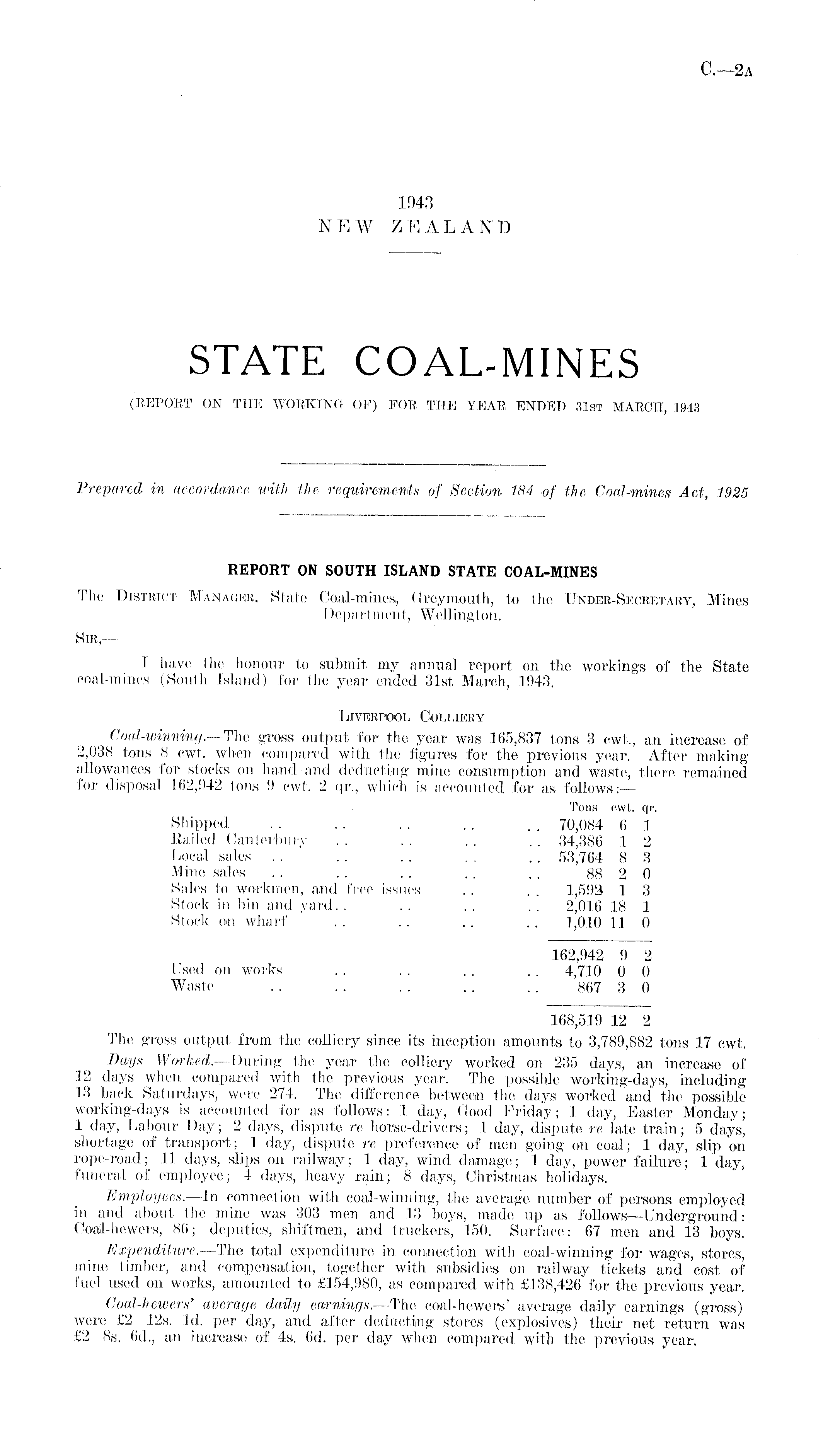 REPORT ON SOUTH ISLAND STATE COAL-MINES The District Manager, State Coal-mines, Greymouth, to the Under-Secretary, Mines I )epartment, Wellington. Sir, — I have the honour to submit my annual report 011 the workings of the State coal-mines (South Island) for the year ended 31st March, 1943. Liverpool Colliery Coal-winning.-—'The gross output for the year was 365,837 tons 3 cwt., an increase of 2,038 tons 8 cwt, when compared with the figures for the previous year. After making allowances for stocks on hand and deducting mine consumption and waste, there remained for disposal 162,942 tons 9 cwt. 2 qr., which is accounted for as follows:— Tons cwt, qr. Shipped . . . . . . . . . . 70,084 6 1 Railed Canterbury . . . . .. .. 34,386 1 2 Local sales .. . . . . . . .. 53,764 8 3 Mine sales .. .. . . .. .. 88 2 0 Sales to workmen, and free issues . . . . 1,592 1 3 Stock in bin and yard. . .. . . . . 2,016 18 1 Stock on wharf .. .. .. .. 1,010 11 0 162,942 9 2 Used on works .. . . .. .. 4,710 0 0 Waste . . .. .. .. . . 867 3 0 168,519 12 2 The gross output from the colliery since its inception amounts to 3,789,882 tons 17 cwt. Days Worked.—During the year the colliery worked on 235 days, an increase of 12 days when compared with, the previous year. The possible working-days, including 13 back Saturdays, were 274. The difference between the days worked and the possible working-days is accounted for as follows: 1 day, Good Friday; 1 day, Easter Monday; 1 day, Labour Day; 2 days, dispute re horse-drivers; 1 day, dispute re late train; 5 days, shortage of transport; 1 day, dispute re preference of men going on coal; 1 day, slip on rope-road; 11 days, slips on railway; 1 day, wind damage; 1 day, power failure; 1 day, funeral of employee; 4 days, heavy rain; 8 days, Christmas holidays, Employees.—ln connection with coal-winning, the average number of persons employed in and about the mine was 303 men and 13 boys, made up as follows—Underground: Coail-hewers, 86; deputies, shiftmen, and truckers, 150. Surface: 67 men and 13 boys. Expenditure.—The total expenditure in connection with coal-winning for wages, stores, mine timber, and compensation, together with, subsidies 011 railway tickets and cost of fuel used on works, amounted to £154,980, as compared with £138,426 for the previous year. Coal-hewers' average daily earnings.—The coal-hewers' average daily earnings (gross) were £2 12s. Id. per day, and after deducting stores (explosives) their net return was £2 Bs. 6d., an increase of 4s. 6d. per day when compared with the previous year.