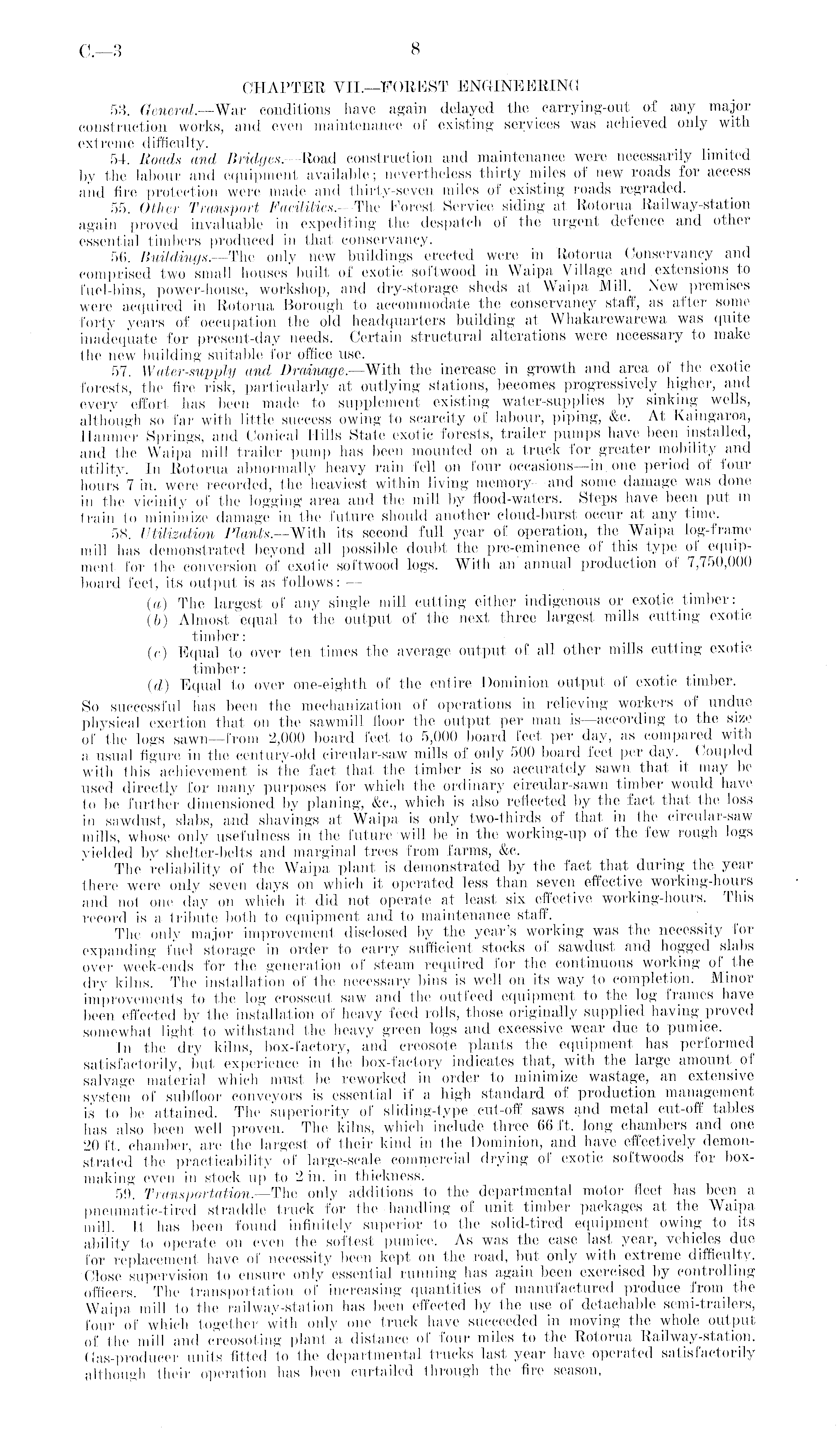 CHAPTER VII.—FOREST ENGINEERING 53. General.—War conditions have . again delayed the carrying-out of any major construction works, and even maintenance of existing services was achieved only with extreme difficulty. 54. Roads and Bridges.—Road construction and maintenance were necessarily limited by the labour and equipment available; nevertheless thirty miles of new roads for access and fire protection were made and thirty-seven miles of existing roads regraded. 55. Other Transport Facilities.— The Forest Service siditfg at Rotorua Railway-station again proved invaluable in expediting the despatch of the urgent defence and other essential timbers produced in that conservancy. 56. Buildings.—The only new buildings erected were in Rotorua Conservancy and comprised two small houses built of exotic softwood in Waipa Village and extensions to fuel-bins, power-house, workshop, and dry-storage sheds at Waipa Mill. New premises were acquired in Rotorua Borough to accommodate the conservancy staff, as after some forty years of occupation the old headquarters building at Whakarewarewa was quite inadequate for present-day needs. Certain structural alterations were necessary to make Ihe new building suitable for office use. 57. Water-supply and Drainage,—With the increase in growth and area of the exotic forests, the fire risk, particularly at outlying stations, becomes progressively higher, and every effort has been made to supplement existing water-supplies by sinking wells, although so far with little success owing to scarcity of labour, piping, &c. At Kaingaroa, Hanmer Springs, and. Conical Hills State exotic forests, trailer pumps have been installed, and the Waipa mill trailer pump has been mounted on a truck for greater mobility and utility. In Rotorua abnormally heavy rain fell on four occasions—in one period of four hours 7 in. were recorded, the heaviest within living memory- and some damage was done in the vicinity of the logging area and. the mill by flood-waters. Steps have been put in train to minimize damage in the future should another cloud-burst occur at any time. 58. Utilization Plants.—With its second full year of operation, the Waipa log-frame mill has demonstrated beyond all possible doubt the pre-eminence of this type of equipment for the conversion of exotic softwood logs. With an annual production of 7,750,000 board feet, its output is as follows: — (a;) The largest of any single mill cutting either indigenous or exotic timber (6) Almost equal to the output of the next three largest mills cutting exotic timber: ... (c) Equal to over ten times the average output of all other mills cutting exotic, timber: (d) Equal to over one-eighth of the entire Dominion output of exotic timber. So successful has been the mechanization of operations in relieving workers of undue physical exertion that on the sawmill floor the output per man is—according to the size of the logs sawn—from 2,000 board feet to 5,000 board lect per day, as compared witn a usual figure in the centurv-old circular-saw mills of only 500 board feet per Coupled with this achievement is the fact that the timber is so accurately sawn that it may be used directly for many purposes for which the ordinary circular-sawn timber would have to be further dimensioned by planing, &e., which is also reflected by the fact that the loss in sawdust, slabs, and shavings at Waipa is only two-thirds of that in the circular-saw mills, whose only usefulness in the future will lie in the working-up of the few rough logs yielded by shelter-belts and marginal trees from farms, &c. The reliability of the Waipa plant is demonstrated by the fact that during the year there were only seven days on which it operated less than seven effective working-hours and no) one day on which it did not operate at least six effective working-hours. This record is a tribute both to equipment and to maintenance staff. The only major improvement disclosed by the year's working was the necessity for expanding fuel storage in order to carry sufficient stocks of sawdust and hogged slabs over week-ends for the generation of steam, required for the continuous working of the dry kilns. The installation of the necessary bins is well on its way to completion. Minor improvements to the log crosscut saw and the outfeed equipment to the log frames have been effected by the installation of heavy feed rolls, those originally supplied having proved somewhat light to withstand the heavy green logs and excessive wear due to pumice. In the dry kilns, box-factory, and creosote plants the equipment has performed satisfactorily, but experience in the box-factory indicates that, with the large amount of salvage material which must be reworked in order to minimize wastage, an extensive system of sub floor conveyors is essential if a high standard of production management is to be attained. The superiority of siiding-type cut-off saws and metal cut-off tables has also been well, proven. The kilns, which include three 66 ft. long chambers and one 20 ft. chamber, are the largest of their kind in the Dominion, and have effectively demonstrated the practicability of large-scale commercial drying of exotic softwoods for boxmaking even in stock up to 2 in. in thickness. 59. Transportation.—The only additions to the departmental motor fleet has been a pneumatic-tired straddle truck for the handling of unit timber packages at the Waipa mill. It has been found infinitely superior to the solid-tired equipment owing to its ability to operate on even the softest pumice. As was the case last year, vehicles due for replacement have of necessity been kept on the road, but only with extreme difficulty. Close supervision to ensure only essential running has again been exercised by controlling officers. The transportation of increasing quantities of manufactured produce from the Waipa mill to the railway-station has been effected by the use of detachable semi-trailers, four of 