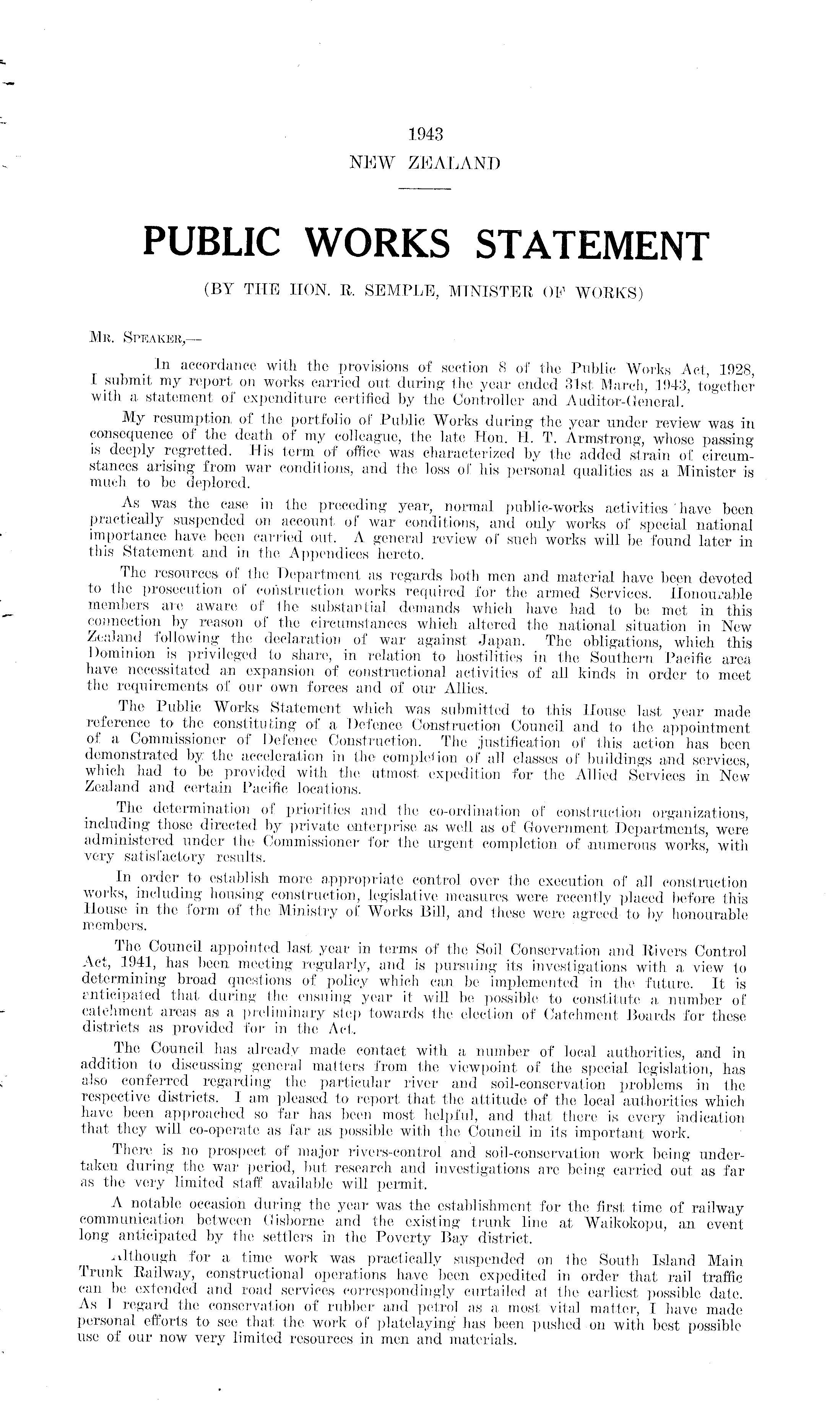 Mr. Speaker,— In accordance with the provisions of section 8 of the Public Works Act, 1928, I submit my report on works carried out during the year ended 31st March, 1943, together with a statement of expenditure certified by the Controller and Auditor-General. My resumption of the portfolio of Public Works during the year under review was in consequence oi the death of my colleague, the late Hon. H. T. Armstrong, whose passing is deeply regretted. His term of office was characterized by the added strain of circumstances arising from war conditions, and the loss of his personal qualities as a Minister is much to be deplored. As was the case in the preceding year, normal public-works activities ' have been practically suspended on account of war conditions, and only works of special national importance have been carried out. A general review of such works will be found later in this Statement and in the Appendices hereto. The resources of the Department as regards both men and material have been devoted to the prosecution of construction works required for the armed Services. Honourable members are aware of the substantial demands which have had to be met in this connection by reason of the circumstances which altered the national situation in New Zealand following the declaration of war against Japan. The obligations, which this Dominion is privileged to share, in relation to hostilities in the Southern Pacific area have necessitated an expansion of constructional activities of all kinds in order to meet the requirements of our own forces and of our Allies. The Public Works Statement which was submitted to this House last year made reference to the constitu ting of a Defence Construction Council and to the appointment of a Commissioner of Defence Construction. The justification of this action has been demonstrated by the acceleration in the completion of all classes of buildings and services, which had to be provided with the utmost expedition for the Allied Services in New Zealand and certain Pacific locations. The determination of priorities and the co-ordination of construction organizations, including those directed by private enterprise as well as of Government Departments, were administered under the Commissioner for the urgent completion of numerous works, with very satisfactory results. In order to establish more appropriate control over the execution of all construction works, including housing construction, legislative measures were recently placed before this House in the form of the Ministry of Works Bill, and these were agreed to by honourable members. The Council appointed last year in terms of the Soil Conservation and Rivers Control Ace, 1941, has been, meeting regularly, and is pursuing its investigations with a. view to determining broad questions of policy which can be implemented in the future. It is anticipated that during the_ ensuing year it will be possible to constitute a number of catchment areas asi a preliminary step towards the election of Catchment Boards for these districts as provided for in the Act. The Council has already made contact with a number of local authorities, and in addition to discussing general matters from the viewpoint of the special legislation, has also conferred _ regarding the particular river and soil-conservation problems in the respective districts. 1 am pleased to report that the attitude of the local authorities which have been approached so far has been most helpful, and that there is every indication that they will co-operate as far as possible with the Council in its important work. There is no prospect of major rivers-control and soil-conservation work being undertaken during the war period, but research and investigations are being carried out as far as the very limited staff available will permit. A notable occasion during the year was the establishment for the first time of railway communication between Gisborne and the existing trunk line at Waikokopu, an event long anticipated by the settlers in the Poverty Bay district. although for a time work was practically suspended on the South Island Main Trunk Railway, constructional operations have been expedited in order that rail traffic can be extended and road services correspondingly curtailed at the earliest possible date. As I regard the conservation of rubber and petrol as a, most vital matter, I have made personal efforts to see that the work of platelaying has been pushed on with best possible use of our now very limited resources in men and materials.
