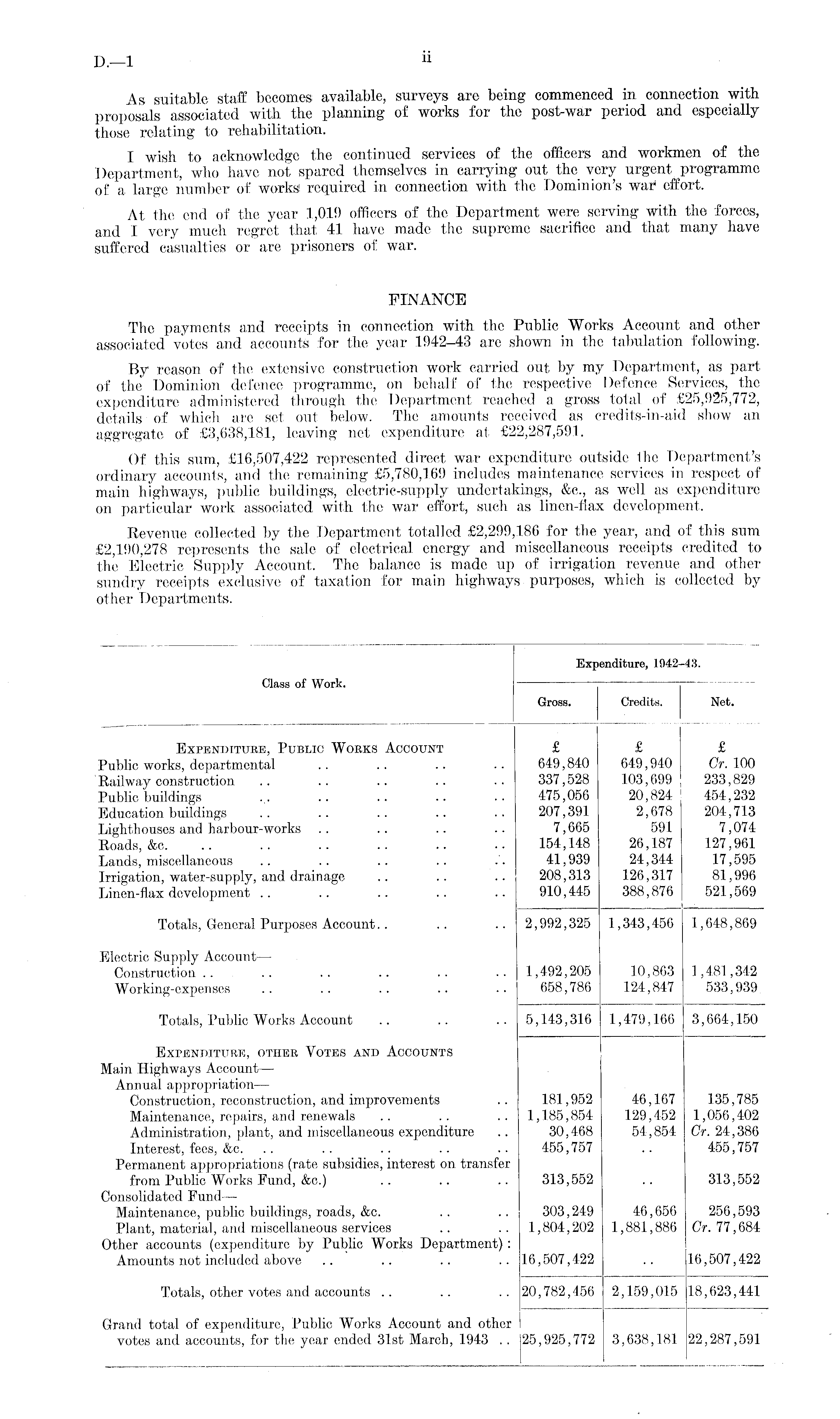 As suitable staff becomes available, surveys are being commenced in connection with proposals associated with the planning of works for the post-war period and especially those relating to rehabilitation. I wish to acknowledge the continued services of the officers and workmen of the Department, who have not spared themselves in carrying out the very urgent programme of a large number of works! required in connection with the Dominion's war 1 effort. At the end of the year 1,019 officers of the Department were serving with the forces, and I very much regret that 41 have made the supreme sacrifice and that many have suffered casualties or are prisoners of war. FINANCE The payments and receipts in connection with the Public Works Account and other associated votes and accounts for the year 1942-43 are shown in the tabulation following. By reason of the extensive construction work carried out, by my Department, as part of the Dominion defence programme, on behalf of the respective Defence Services, the expenditure administered through the Department reached a gross total of £25,925,772, details of which are set out below. The amounts received as credits-in-aid show an aggregate of £3,638,181, leaving net expenditure at £22,287,591. Of this sum, £16,507,422 represented direct war expenditure outside the Department's ordinary accounts, and the remaining £5,780,169 includes maintenance services in respect of main highways, public buildings, electric-supply undertakings, &c., as well as expenditure on particular work associated with the war effort, such as linen-flax development. Revenue collected by the Department totalled £2,299,186 for the year, and of this sum £2,190,278 represents the sale of electrical energy and miscellaneous receipts credited to the Electric Supply Account. The balance is made up of irrigation revenue and other sundry receipts exclusive of taxation for main highways purposes, which is collected by other Departments.