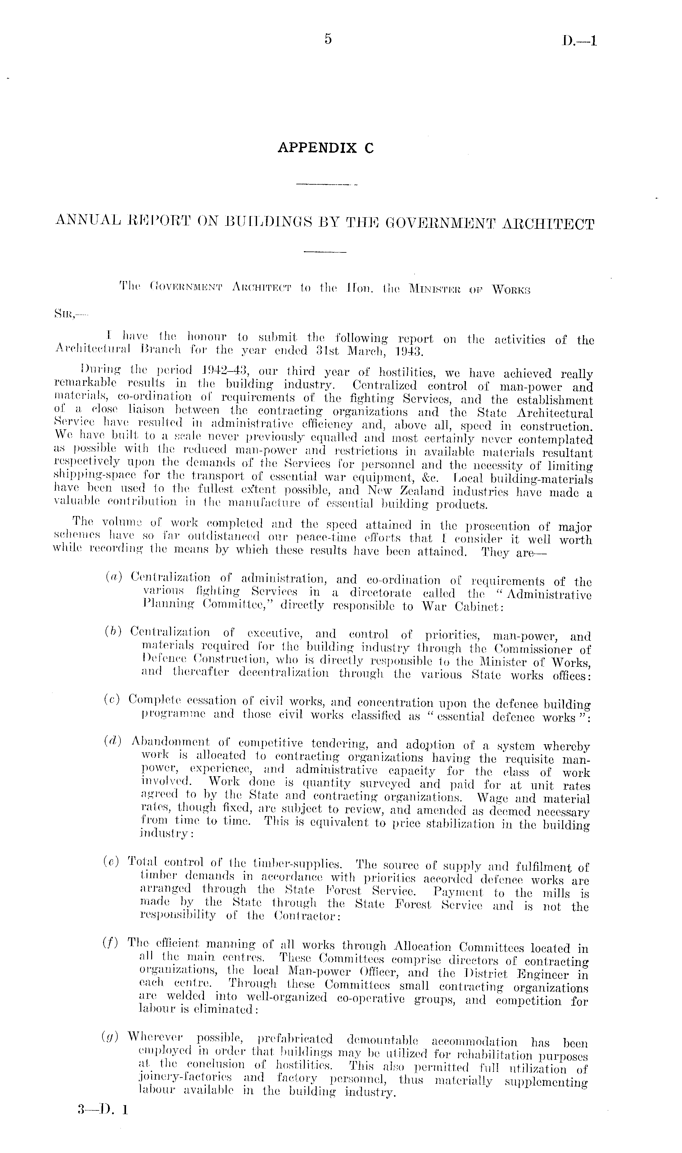 The Government Architect to the Hon. the Minister of Works Sir, — I have the honour to submit the following report on the activities of the Architectural Branch for the year ended 31st March, 1943. Duiing the period 1942—43, our third year of hostilities, we have achieved really remarkable results in the building industry. Centralized control of man-power and materials, co-ordination of requirements of the fighting Services, and the establishment oi a close liaison between contracting organizations and the State Architectural have resulted in administrative efficiency and, above all, speed in construction. We have built to a scale never previously equalled and most certainly never contemplated as possible with the reduced man-power and restrictions in available materials resultant respectively upon the demands of the Services for personnel and the necessity of limiting shipping-space for the transport of essential war equipment, &c. Local building-materials have been used to the fullest extent possible, and New Zealand industries have made a valuable contribution in the manufacture of essential building products. The volume of work completed and the speed attained in the prosecution of major schemes have so far outdistanced our peace-time efforts that I consider it well worth while recording the means by which these results have been attained. They are (a) Centralization of administration, and co-ordination of requirements of the various fighting Services in a directorate called the "Administrative Planning Committee," directly responsible to War Cabinet: (b) Centralization of executive, and control of priorities, man-power, and materials required for the building industry through the Commissioner of Defence Construction, who is directly responsible to the Minister of Works, and thereafter decentralization through the various State works offices: (c) Complete cessation of civil works, and concentration upon the defence building piogramme and those civil works classified as "essential defence works": (d) Abandonment of competitive tendering, and adoption of a system whereby work is allocated to contracting organizations having the 'requisite manpower, experience, and_ administrative capacity for the class of work involved. Work done is quantity surveyed and paid for at unit rates agreed to by the State and contracting organizations. Wage and material rates, though fixed, are subject to review, and amended as deemed necessary from time to time. This is equivalent to price stabilization in the building industry: (e) Total control of the timber-supplies. The source of supply and fulfilment of timber demands in accordance with priorities accorded defence works are arranged through the State Forest Service. Payment to the mills is made by the State through the State Forest Service and is not the responsibility of the Contractor: (/) The efficient manning of all works through Allocation Committees located in all the main centres. These Committees comprise directors of contracting organizations, the local Man-power Officer, and the District Engineer in each centre. Through these Committees small contracting organizations are welded into well-organized co-operative groups, and competition for labour is eliminated : (g) Wherever possible, prefabricated demountable accommodation has been employed m order that buildings may be utilized for rehabilitation purposes at the conclusion of hostilities. This also permitted full utilization of joinery-factories and factory personnel, thus materially supplementing labour available m the building industry