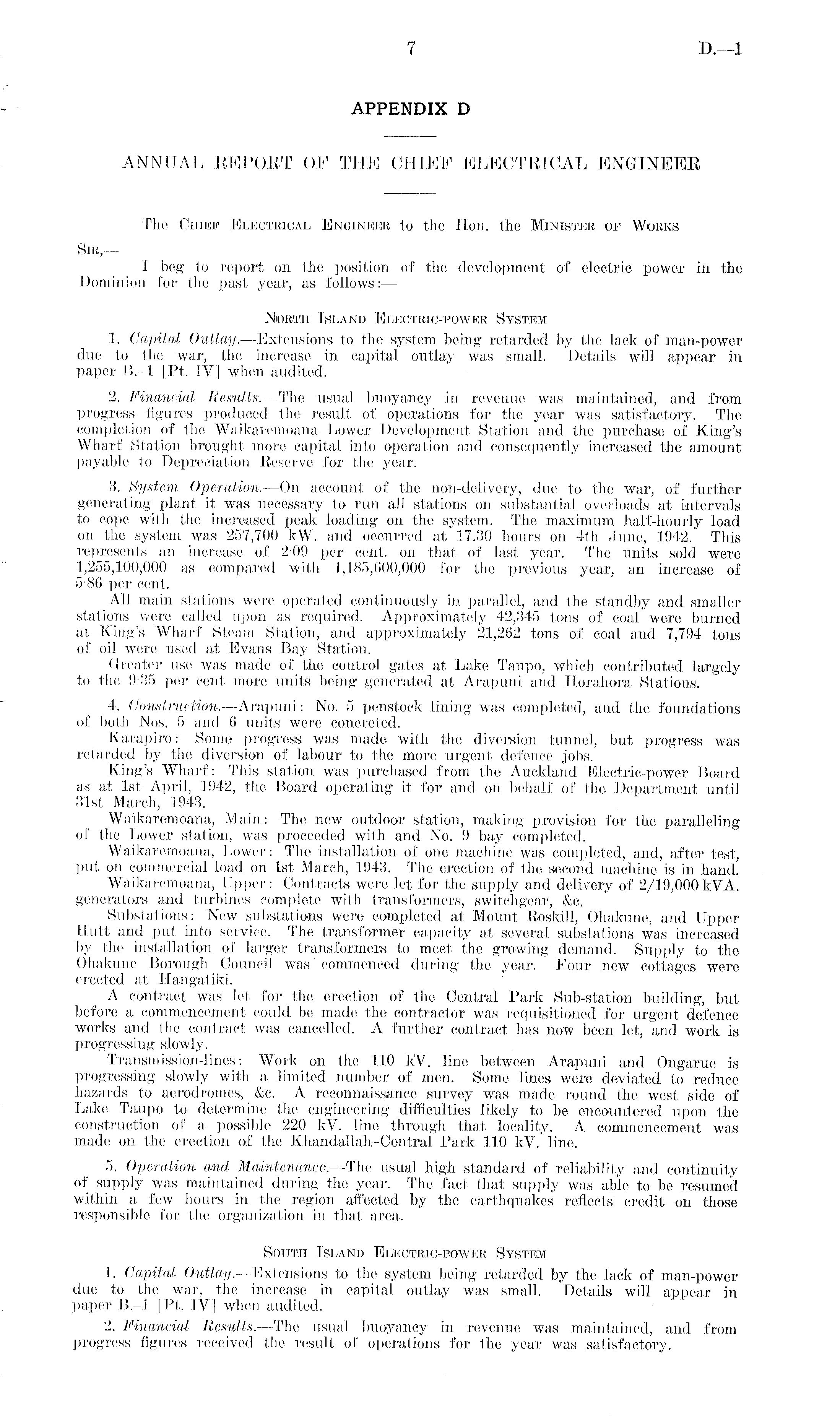 The Chief Electrical Engineer to the Hon. the Minister op Works Sir, — I beg to report on the position of the development of electric power in the Dominion for the past year, as follows:— North Island Electric-power System 1. Capital Outlay.—Extensions to the system being retarded by the lack of man-power due to the war, the increase in capital outlay was small. Details will appear in paper 8.-l [Pt. IV] when audited. 2. Financial Result's.—The usual buoyancy in revenue was maintained, and from progress figures produced the result of operations for the year was satisfactory. The completion of the Waikaremoana Lower Development Station and the purchase of King's Wharf Station brought more capital into operation and consequently increased the amount payable to Depreciation Reserve for the year. 3. System Operation.—On account of the non-delivery, due to the war, of further generating plant it was necessary to run all stations on substantial overloads at intervals to cope with the increased peak loading on the system. The maximum half-hourly load on the system was 257,700 kW. and occurred at 17.30 hours on 4th June, 1942. This represents an increase of 209 per cent, on that of last year. The units sold were 1,255,100,000 as compared with 1,185,600,000 for the previous year, an increase of 5 86 per cent. All main stations were operated continuously in parallel, and the standby and smaller stations were called upon as required. Approximately 42,345 tons of coal were burned at King's Wharf Steam Station, and approximately 21,262 tons of coal and 7,794 tons of oil were used at Evans Bay Station. Greater use was made of the control gates at Lake Taupo, which contributed largely to the 9-35 per 1 cent more units being generated at Arapuni and Horahora Stations. 4. Construction.—Arapuni: No. 5 penstock lining was completed, and the foundations of both Nos. 5 and 6 units were concreted. Karapiro: Some progress was made with the diversion tunnel, but progress was retarded by the diversion of labour to the more urgent defence jobs. King's Wharf: This station was purchased from, the Auckland Electric-power Board as at Ist April, 1942, the Board operating it for and on behalf of the Department until 31st March, 1943. Waikaremoana, Main: The new outdoor station, making provision for the paralleling of the Lower station, was proceeded with and No. 9 bay completed. Waikaremoana, Lower: The installation of one machine was completed, and, after test, put on commercial load on Ist March, 1943. The erection of the second machine is in hand. Waikaremoana, Upper: Contracts were let for the supply and delivery of 2/19,000kVA. generators and turbines complete with transformers, switchgear, &c. Substations: New substations were completed at Mount Roskill, Ohakune, and Upper Hutt and put into service. The transformer capacity at several substations was increased by the installation of larger transformers to meet the growing demand. Supply to the Ohakune Borough Council was commenced during the year. Four new cottages were erected at Hangatiki. A contract was let for the erection of the Central Park Sub-station building, but before a commencement could be made the contractor was requisitioned for urgent defence works and the contract was cancelled. A further contract has now been let, and work is progressing slowly. Transmission-lines: Work on the 110 k'V. line between Arapuni and Ongarue is progressing slowly with a limited number of men. Some lines were deviated to reduce hazards to aerodromes, &c. A reconnaissance survey was made round the west side of Lake Taupo to determine the engineering difficulties likely to be encountered upon the construction of a possible 220 kV. line through that locality. A commencement was made on the erection of the Khanda.il ah-Central Park 110 kV. line. 5. Operation and Maintenance.—The usual high standard of reliability and continuity of supply was maintained during the year. The fact that supply was able to be resumed within a few hours in the region affected by the earthquakes reflects credit on those responsible for the organization in that area. South Island Electric-bower System 1. Capital Outlay.—Extensions to the system being retarded by the lack of man-power due to the war, the increase in capital outlay was small. Details will appear in paper 8.-l [Pt. IV] when audited. 2. Financial Results.—The usual buoyancy in revenue was maintained, and from progress figures received the result of operations for the year was satisfactory.