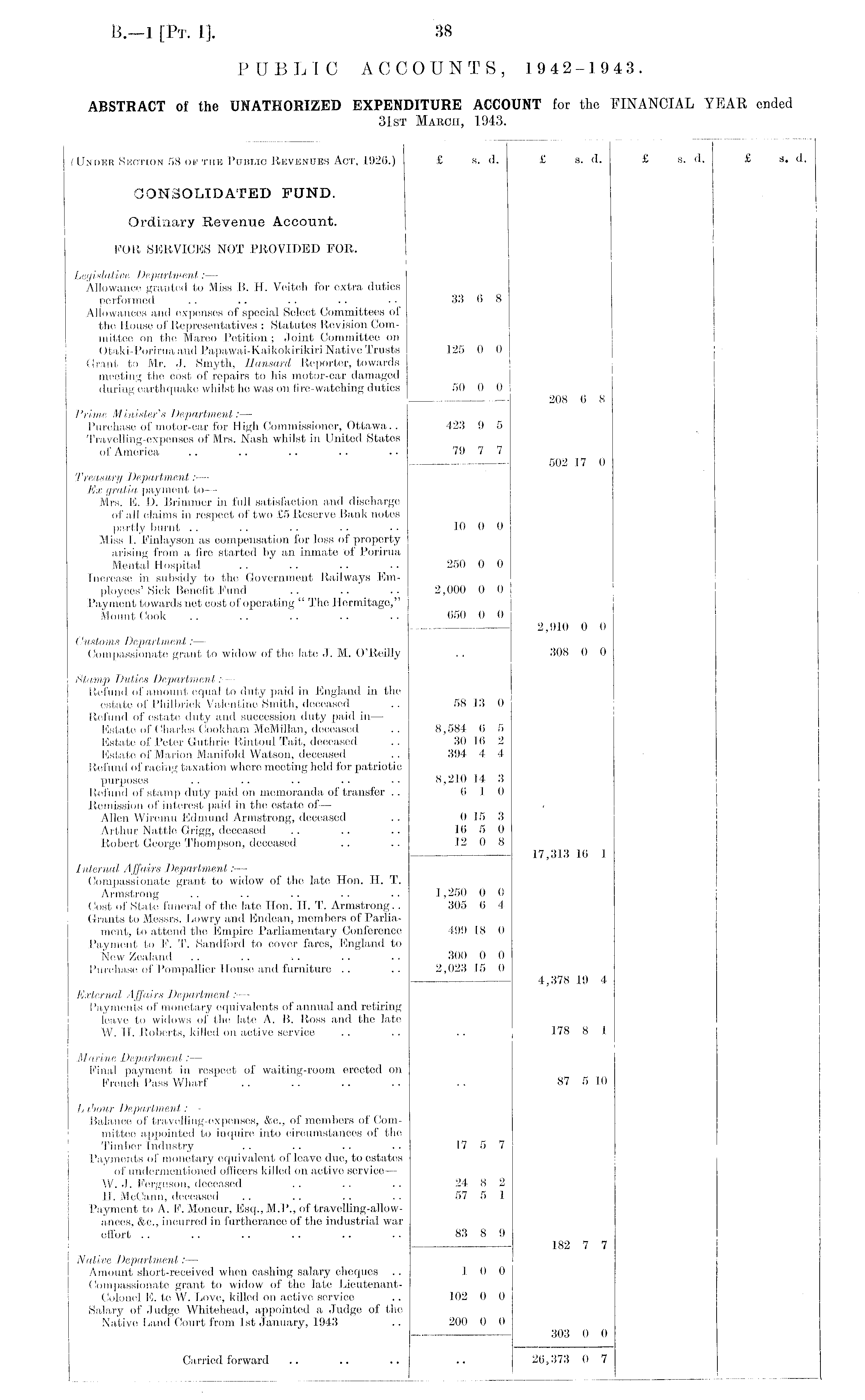 ( Under Section 58 of the Public Revenues Act, 1926.) £ a. d. £ a. d. £ s. d. £ a. d. CONSOLIDATED FUND. Ordinary Revenue Account. FOR SERVICES NOT PROVIDED FOR. Legislative Department:— Allowance granted to Miss B. H. Veitch for extra duties performed .. .. .. .. • • 33 6 8 Allowances and expenses of special Select Committees of the House of Repreaentativea : Statutes Revision Committee on the Mareo Petition; Joint Committee on Otaki-Porirua and Papawai-KLaikokirikiri Native Trusts 125 0 0 Grant to Mr. J. Smyth, Hansard Reporter, towards meeting the coat of repairs to his motor-car damaged during earthquake whilat he waa on fire-watching duties 50 0 0 208 6 8 Prime Minister's Department: — Purchase of motor-car for High Commiaaioner, Ottawa.. 423 9 5 Travelling-expenaea of Mra. Nash whilst in United States of America .. .. .. .. .. 79 7 7 502 17 0 Treasury Department:— Ex gratia payment to— Mrs. E. D. Brimmer in full satisfaction and discharge of all claima in reapect of two £5 Reserve Bank notea partly burnt .. .. .. . • .. 10 0 0 Miss I. Finlayson as compenaation for loss of property arising from a fire started by an inmate of Porirua Mental Hospital .. .. .. .. 250 0 0 Increase in subsidy to the Government Railways Employees'Sick Benefit Fund .. .. .. 2,000 0 0 Payment towards net cost of operating " The Hermitage," Mount Cook .. .. .. .. .. 650 0 0 2,910 0 0 Customs Department:— Compassionate grant to widow of the late J. M. O'Reilly .. 308 0 0 Stamp Duties Department:— Refund of amount equal to duty paid in England in the estate of Philbriek Valentine Smith, deceased .. 58 13 0 Refund of estate duty and succession duty paid in— Estate of Charles Cookham McMillan, deceased ,. 8,584 6 5 Estate of Peter Guthrie Rintoul Tait, deceased .. 30 16 2 Estate of Marion Manifold Watson, deceased .. 394 4 4 Refund of racing taxation where meeting held for patriotic purposes .. .. .. .. .. 8,210 14 3 Refund of stamp duty paid on memoranda of transfer .. 6 10 Remisaion of interest paid in the estate of — Allen Wiremu Edmund Armatrong, deceased .. 0 15 3 Arthur Nattle Grigg, deceased .. . . .. 16 5 0 Robert George Thompson, deceased .. .. 12 0 8 — 17,313 16 1 Internal Affairs Department:— Compassionate grant to widow of the late Hon. H. T. Armstrong .. .. .. • . • • 1,250 0 0 Cost of State funeral of the late Hon. H. T. Armstrong.. 305 6 4 Grants to Messrs. Lowry and Endean, members of Parliament, to attend the Empire Parliamentary Conference 499 18 0 Payment to F. T. Sandford to cover fares, England to New Zealand .. .. .. .. .. 300 0 0 Purchase of Pompallier House and furniture .. .. 2,023 15 0 — 4,378 19 4 External Affairs Department :■ — Payments of monetary equivalents of annual and retiring leave to widows of the late A. B. Ross and the late W. H. Roberts, killed on active service .. .. .. , 178 8 1 M arine Department Final payment in respect of waiting-room erected on French Pass Wharf .. .. .. . • • . 87 5 10 Labour Department:— Balance of travelling-expenses, &c., of members of Committee appointed to inquire into circumstances of the Timber Industry . . .. .. .. 17 5 7 Payments of monetary equivalent of leave due, to estates of undermentioned officers killed on active service— W. J. Ferguson, deceased .. .. .. 24 8 2 H. McCann, deceased .. .. .. .. 57 5 1 Payment to A. F. Moncur, Esq., M.P., of travelling-allow-ances, &c., incurred in furtherance of the industrial war effort .. .. .. .. .. . • 83 8 9 — 182 7 7 Native Department:— Amount short-received when cashing salary cheques .. 10 0 Compassionate grant to widow of the late LieutenantColonel E. te W. Love, killed on active service .. 102 0 0 Salary of Judge Whitehead, appointed a Judge of the Native Land Court from 1st January, 1943 .. 200 0 0 303 0 0 Carried forward .. .. .. .. 26,373 0 7