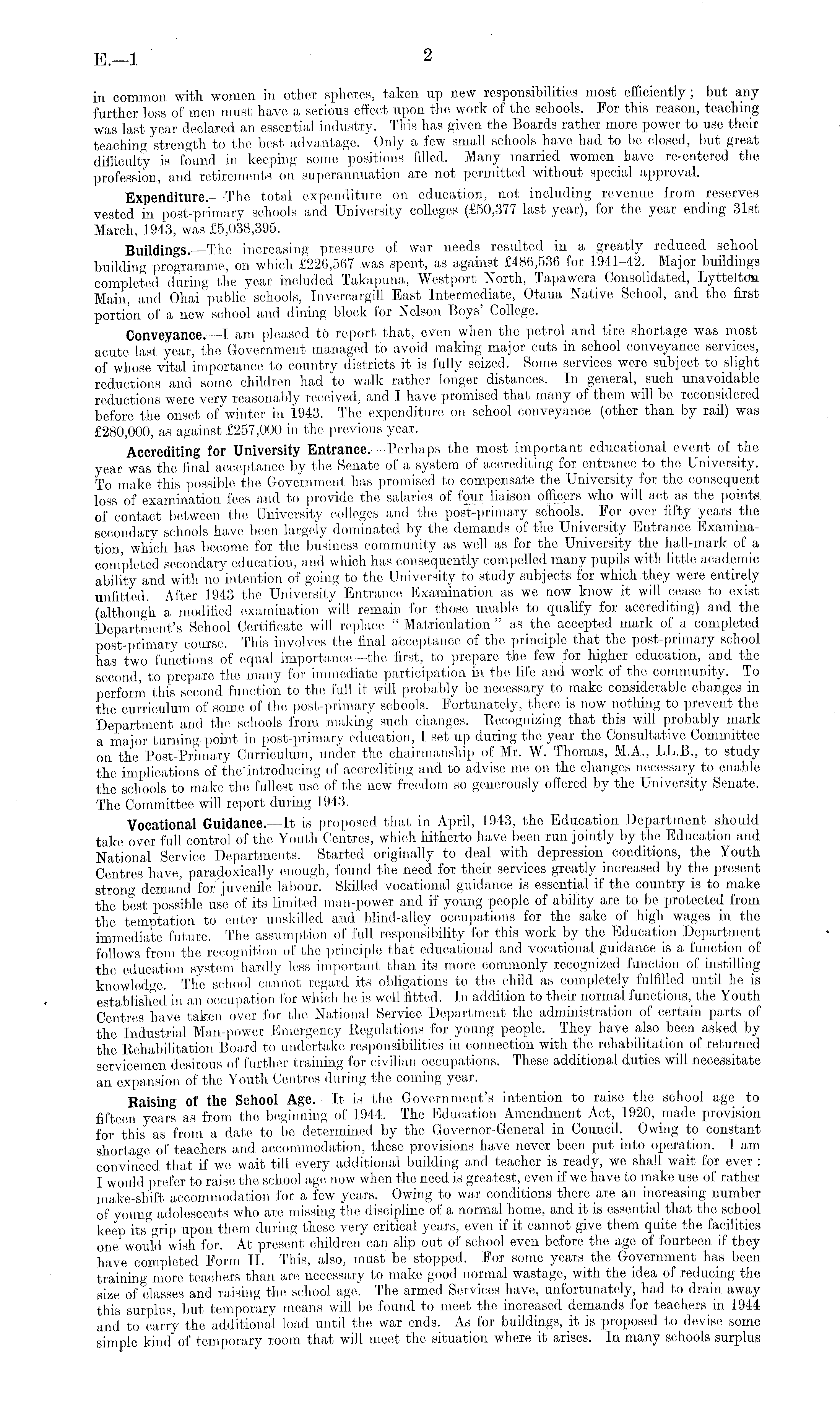 in common with women in other spheres, taken up new responsibilities most efficiently; but any further loss of men must have a serious effect upon the work of the schools. For this reason, teaching was last year declared an essential industry. This has given the Boards rather more power to use their teaching strength to the best advantage. Only a few small schools have had to be closed, but great difficulty is found, in keeping some "positions filled. Many married women have re-entered the profession, and retirements on superannuation are not permitted without special approval. Expenditure.- The total expenditure on education, not including revenue from reserves vested in post-primary schools and University colleges (£50,377 last year), for the year ending 31st March, 1943, was £5,038,395. Buildings.—The increasing pressure of war needs resulted in a greatly reduced school building programme, on which £226,567 was spent, as against £4-86,536 for 1941-42. Major buildings completed during the year included Takapuna, Westport North, Tapawera Consolidated, Lytteitcm Main, and Ohai public schools, Invercargill East Intermediate, Otaua Native School, and the first portion of a new school and dining block for Nelson Boys' College. Conveyance. —I am pleased tft report that, even when the petrol and tire shortage was most acute last year, the Government managed to avoid making major cuts in school conveyance services, of whose vital importance to country districts it is fully seized. Some services were subject to slight reductions and some children had to. walk rather longer distances. In general, such unavoidable reductions were very reasonably received, and I have promised that many of them will be reconsidered before the onset of winter in 1943. The expenditure on school conveyance (other than by rail) was £280,000, as against £257,000 in the previous year. Accrediting for University Entrance. —Perhaps the most important educational event of the year was the final acceptance by the Senate of a system of accrediting for entrance to the University. To make this possible the Government has promised to compensate the University for the consequent loss of examination fees and to provide the salaries of four liaison officers who will act as the points, of contact between the University colleges and the post-primary schools. For over fifty years the secondary schools have been largely dominated by the demands of the University Entrance Examination, which has become for the business community as well as for the University the hall-mark of a completed secondary education, and which has consequently compelled many pupils with little academic ability and with no intention of going to the University to study subjects for which they were entirely unfitted. After 1943 the University Entrance Examination as we now know it will cease to exist (although a modified examination will remain for those unable to qualify for accrediting) and the Department's School Certificate will replace " Matriculation " as the accepted mark of a completed post-primary course. This involves the final acceptance of the principle that the post-primary school has two functions of equal importance —the first, to prepare the few for higher education, and the second, to prepare the many for immediate participation in the life and work of the community. To perform this second function to the full it will probably be necessary to make considerable changes in the curriculum of some of the post-primary schools. Fortunately, there is now nothing to prevent the Department and the schools from making such changes. Recognizing that this will probably mark a major turning-point in post-primary education, I set up during the year the Consultative Committee on the Post-Primary Curriculum, under the chairmanship of Mr. W. Thomas, M.A., LL.B., to study the implications of the"introducing of accrediting and to advise me on the changes necessary to enable the schools to make the fullest use of the new freedom so generously offered by the University Senate. The Committee will report during 1943. Vocational Guidance.—lt is proposed that in April, 1943, the Education Department should take over full control of the Youth Centres, which hitherto have been run jointly by the Education and National Service Departments. Started originally to deal with depression conditions, the Youth Centres have, paradoxically enough, found the need for their services greatly increased by the present strong demand, for juvenile labour. Skilled vocational guidance is essential if the country is to make the best possible use of its limited man-power and if young people of ability are to be protected from the temptation to enter unskilled and blind-alley occupations for the sake of high wages in the immediate future. The assumption of full responsibility for this work by the Education Department follows from the recognition of the principle that educational and vocational guidance is a function of the education system hardly less important than its more commonly recognized function of instilling knowledge. The school cannot regard its obligations to the child as completely fulfilled until he is established in an occupation for which he is well fitted. In addition to their normal functions, the Youth Centres have taken over for the National Service Department the administration of certain parts of the Industrial Man-power Emergency Regulations for young people. _ They have also been asked by the Rehabilitation Board to undertake responsibilities in connection with the rehabilitation of returned servicemen desirous of further training for civilian occupations. These additional duties will necessitate an expansion of the Youth Centres during the coming year. Raising of the School Age.—lt is the Government's intention to raise the school age to fifteen years as from the beginning of 1944. The Education Amendment Act, 1920, made provision for this as from a date t