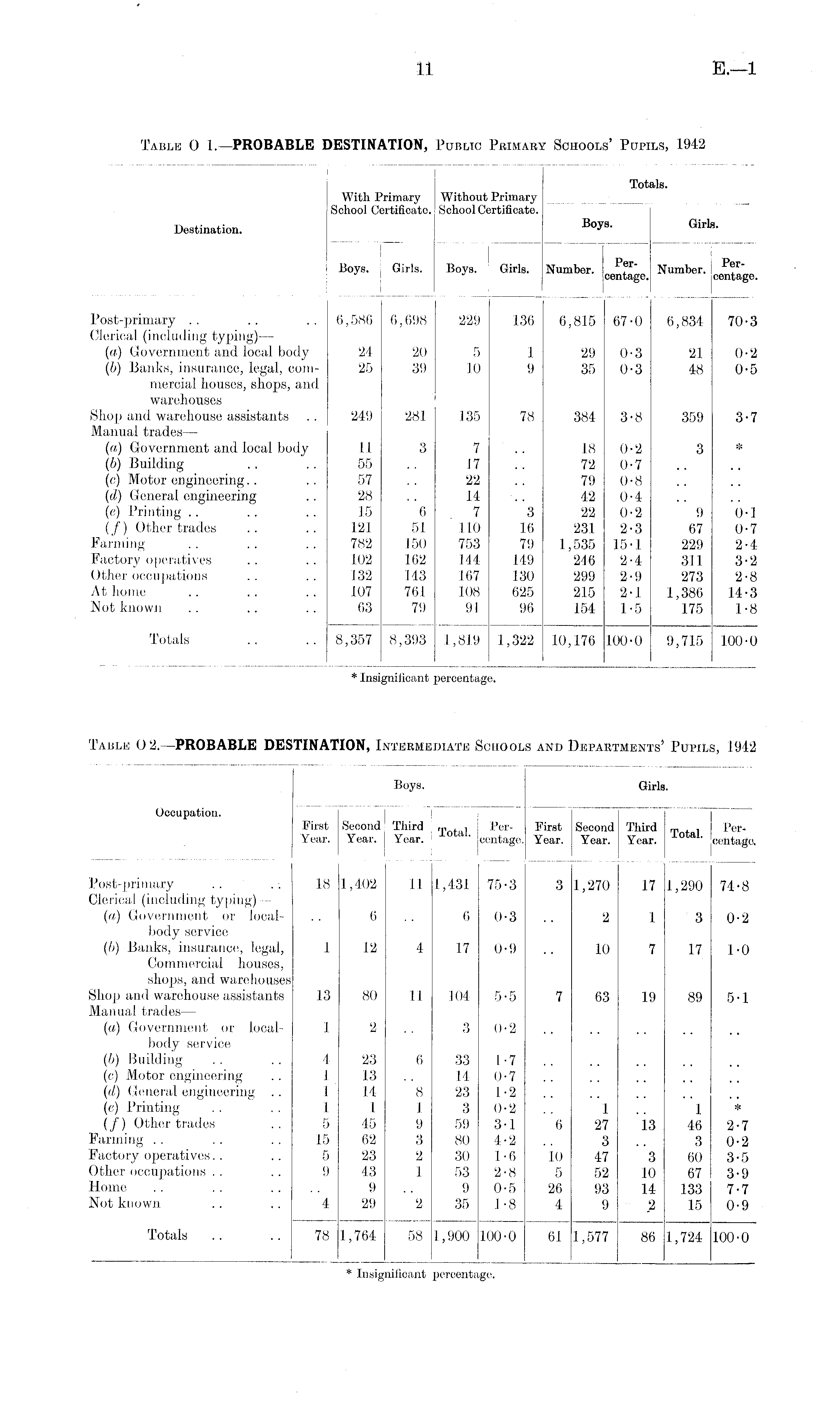 Table 0 1.—PROBABLE DESTINATION, Public Primary Schools' Pupils, 1942 Totals. With Primary Without Primary School Certificate. School Certificate. Destination. Boys ' Girk " j ~ : ! | | Boys. Girls. Boys. Girls. Number. P f r " Number, i P ° r " : * centage. centage. Post-primary .. .. .. 6,586 6,698 229 136 6,815 67-0 6,834 70-3 Clerical (including typing)— (а) Government and local body 24 20 5 1 29 0-3 21 0-2 (б) Banks, insurance, legal, com- 25 39 10 9 35 0-3 48 0-5 mercial liouses, shops, and warehouses Shop and warehouse assistants .. 249 281 135 78 384 3-8 359 3-7 Manual trades— (a) Government and local body 11 3 7 .. 18 0-2 3 * (b) Building .. .. 55 .. 17 .. 72 0-7 (c) Motor engineering.. .. 57 .. 22 .. 79 0-8 (d) General engineering .. 28 .. 14 .. 42 0-4 (e) Printing.. .. .. 15 6 7 3 22 0-2 9 0-1 (/) Other trades .. .. 121 51 110 16 231 2-3 67 0-7 Farming .. .. .. 782 150 753 79 1,535 15-1 229 2-4 Factory operatives .. .. 102 162 144 149 246 2-4 311 3-2 Other occupations .. .. 132 143 167 130 299 2-9 273 2-8 At home .. .. .. 107 761 108 625 215 2-1 1,386 14-3 Not known .. .. .. 63 79 91 96 154 1-5 175 1-8 Totals .. .. 8,357 8,393 1,819 1,322 10,176 100-0 9,715 100-0 * Insignificant percentage. Table 0 2.—PROBABLE DESTINATION, Intermediate Schools and Departments' Pupils, 1942 Boys. Girls. Occupation. First Second Third , Per- First Second Third T . PerYear. Year. | Year. ' ' centage. Year. Year. Year. Aotal - eentago. Post-primary .. .. 18 1,402 11 1,431 75-3 3 1,270 17 1,290 74-8 Clerical (including typing) — (а) Government or local- .. 6 .. 60-3 .. 2 1 30-2 body service (б) Banks, insurance, legal, 1 12 4 17 0-9 10 7 17 1-0 Commercial houses, shops, and warehouses Shop and warehouse assistants 13 80 II 104 5-5 7 63 19 89 5-1 Manual trades— (a) Government or local- I 2 .. 3 0-2 body service (b) Building .. .. 4 23 6 33 1-7 (c) Motor engineering .. 1 13 .. 14 0-7 (d) General engineering .. 1 14 8 23 1-2 (e) Printing .. .. 1 I 1 3 0-2.. I 1 * (/) Other trades .. 5 45 9 59 3-1 6 27 13 46 2-7 Farming .. .. .. 15 62 3 80 4-2 .. 3 .. 3 0-2 Factory operatives.. .. 5 23 2 30 1-6 10 47 3 60 3-5 Other occupations .. .. 9 43 1 53 2-8 5 52 10 67 3-9 Home .. .. .... 9 9 0-5 26 93 14- 133 7-7 Not known .. .. 4 29 2 35 1-8 4 9 ,2 15 0-9 Totals .. .. 78 1,764 58 1,900 100-0 61 1,577 86 1,724 100-0 * Insignificant percentage.