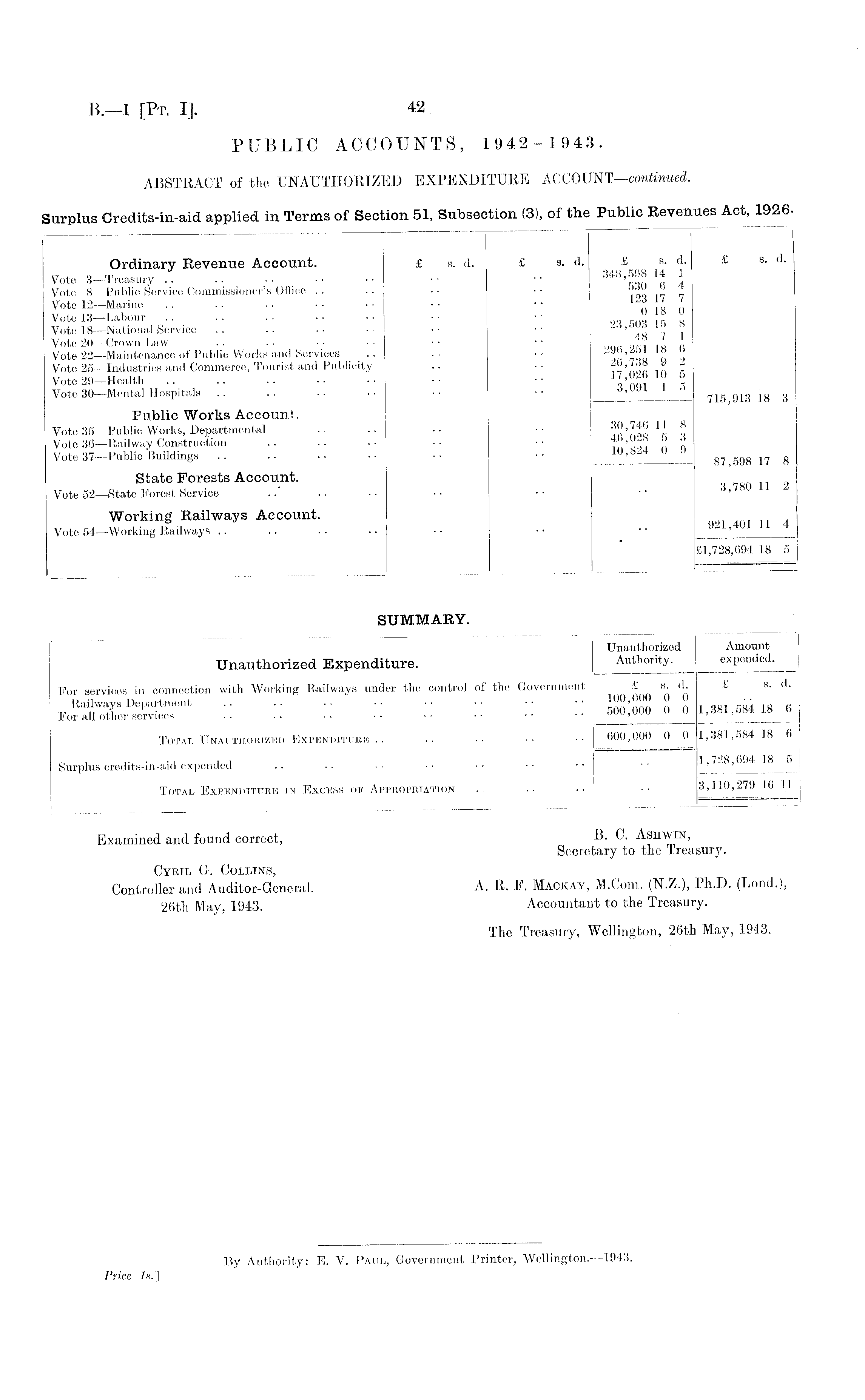 Examined and found correct, B- C. Ashwin, Secretary to the Treasury. Cykil G. Collins, Controller and Auditor-General. A. R. F. Mackay, M.Com. (N.Z.), Ph.D. (Lond.), 26th May, 1943. Accountant to the Treasury. The Treasury, Wellington, 26th May, 1943.