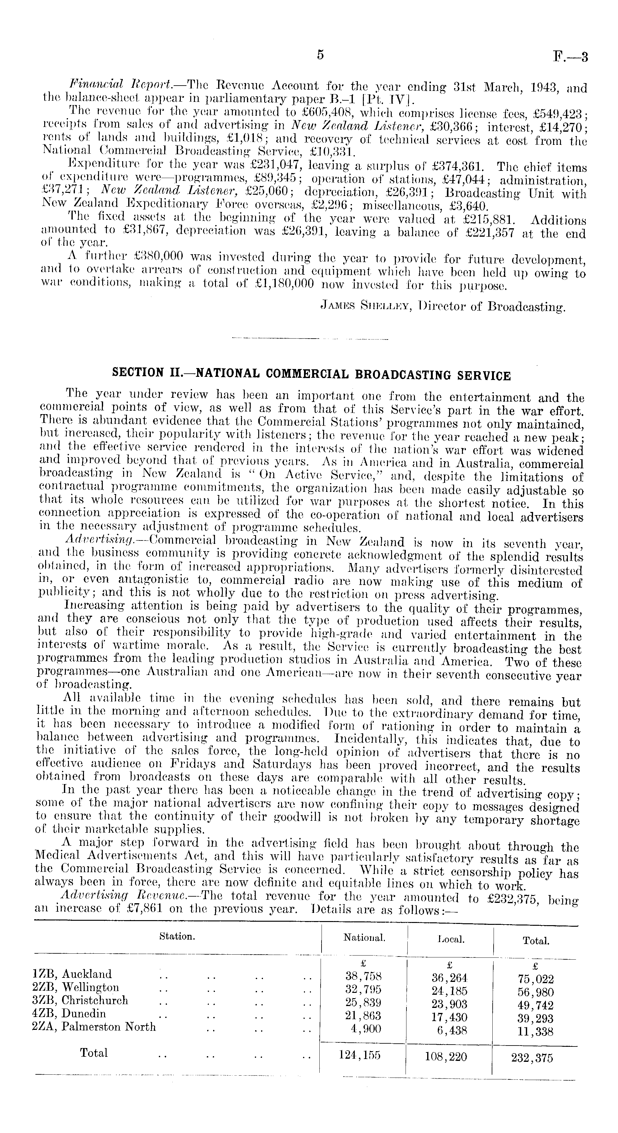 Financial Report.—The Revenue Account for the year ending 31st March, 1943, and the balance-sheet appear in parliamentary paper 8.-l [Pt. IV]. The revenue for the year amounted to £605,408, which comprises license fees, £549,423; receipts from sales of and advertising in New Zealand Listener, £30,366; interest, £14,270; rents of lands and buildings, £1,018; and recovery of technical services at cost from the National Commercial Broadcasting Service, £10,331. Expenditure for the year was £231,047, leaving a surplus of £374,361. The chief items of expenditure were—programmes, £89,345; operation of stations, £47,044; administration, £37,271; New Zealand Listener, £25,060; depreciation, £26,391; Broadcasting Unit with New Zealand Expeditionary Force overseas, £2,296; miscellaneous, £3,640. The fixed assets at the beginning of the year were valued at £215,881. Additions amounted to £31,867, depreciation was £26,391, leaving a balance of £221,357 at the end of the year. A further £380,000 was invested during the year to provide for future development, and to overtake arrears of construction and equipment which have been held up owing to war conditions, making a total of £1,180,000 now invested for this purpose. James Shelley, Director of Broadcasting.