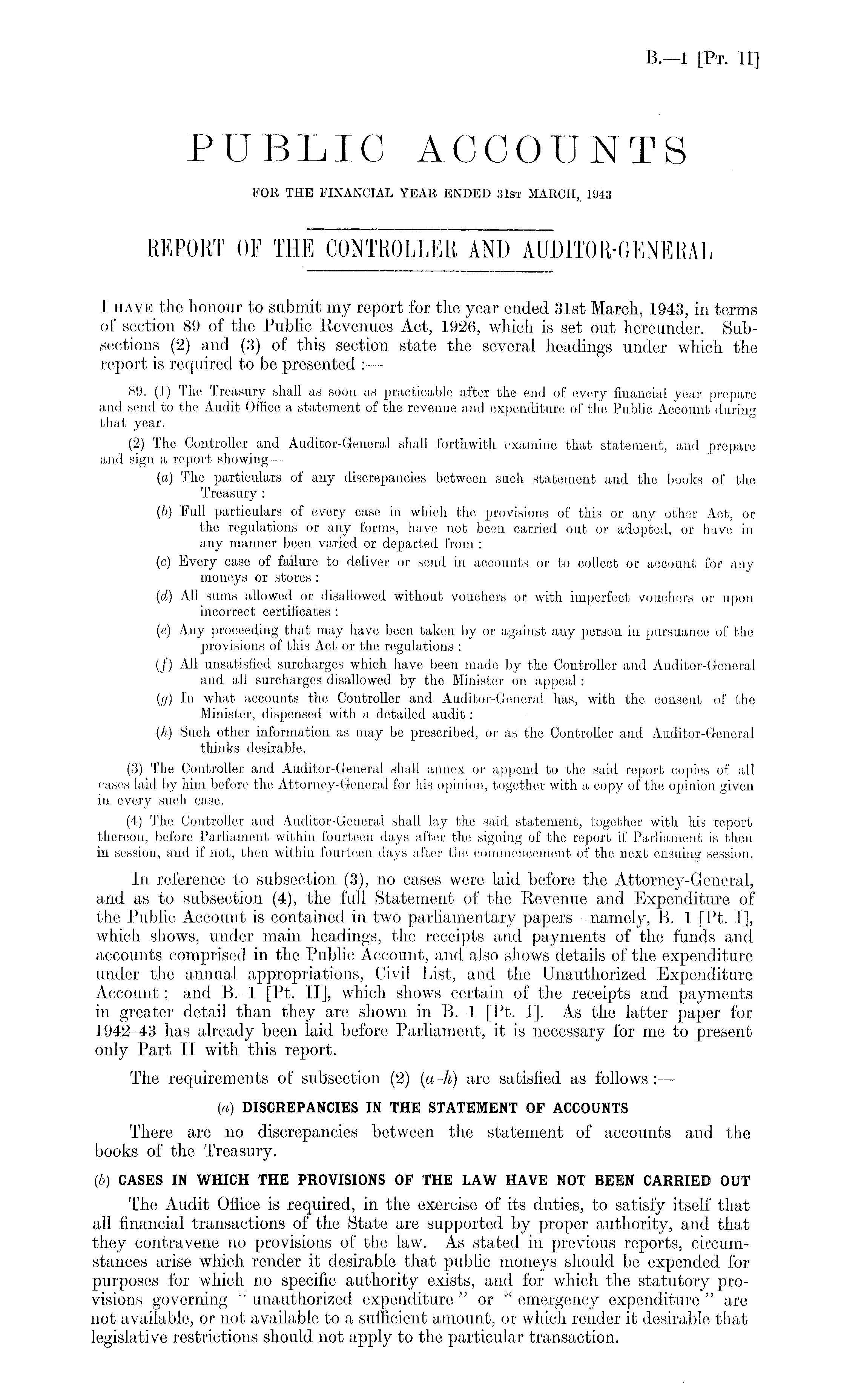 I have the honour to submit my report for the year ended 31st March, 1943, in terms of section 89 of the Public Revenues Act, 1926, which is set out hereunder. Subsections (2) and (3) of this section state the several headings under which the report is required to be presented : — 89. (1) The Treasury shall as soon as practicable after the end of every financial year prepare and send to the Audit Office a statement of the revenue and expenditure of the Public Account during that year. (2) The Controller and Auditor-General shall forthwith examine that statement, and prepare and sign a report showing— {a) The particulars of any discrepancies between such statement and the books of the Treasury : (6) Full particulars of every case in which the provisions of this or any other Act, or the regulations or any forms, have not been carried out or adopted, or have in any manner been varied or departed from : (c) Every case of failure to deliver or send in accounts or to collect or account for any moneys or stores : (at) All sums allowed or disallowed without vouchers or with imperfect vouchers or upon incorrect certificates : (e) Any proceeding that may have been taken by or against any person in pursuance of the provisions of this Act or the regulations : (/) All unsatisfied surcharges which have been made by the Controller and Auditor-General and all surcharges disallowed by the Minister on appeal: (</) In what accounts the Controller and Auditor-General has, with the consent of the Minister, dispensed with a detailed audit: (,h) Such other information as may be prescribed, or as the Controller and Auditor-General thinks desirable. (3) The Controller and Auditor-General shall annex or append to the said report copies of all cases laid by him before the Attorney-General for his opinion, together with a copy of the opinion given in every such case. (4) The Controller and Auditor-General shall lay the said statement, together with his report thereon, before Parliament within fourteen days after the signing of the report if Parliament is then in session, and if not, then within fourteen days after the commencement of the next ensuing session. In reference to subsection (3), no cases were laid before the Attorney-General, and as to subsection (4), the full Statement of the Revenue and Expenditure of the Public Account is contained in two parliamentary papers —namely, 111 [Pt. I], which shows, under main headings, the receipts and payments of the funds and accounts comprised in the Public Account, and also shows details of the expenditure under the annual appropriations, Civil List, and the Unauthorized Expenditure Account; and 8.-l [Pt. ll], which shows certain of the receipts and payments in greater detail than they are shown in 8.-l [Pt. I]. As the latter paper for 1942-43 has already been laid before Parliament, it is necessary for me to present only Part II with this report. The requirements of subsection (2) (a-h) are satisfied as follows : — (a) DISCREPANCIES IN THE STATEMENT OF ACCOUNTS There are no discrepancies between the statement of accounts and the books of the Treasury. (b) CASES IN WHICH THE PROVISIONS OF THE LAW HAVE NOT BEEN CARRIED OUT The Audit Office is required, in the exercise of its duties, to satisfy itself that all financial transactions of the State are supported by proper authority, and that they contravene no provisions of the law. As stated in previous reports, circumstances arise which render it desirable that public moneys should be expended for purposes for which no specific authority exists, and for which the statutory provisions governing " unauthorized expenditure " or " emergency expenditure " are not available, or not available to a sufficient amount, or which render it desirable that legislative restrictions should not apply to the particular transaction.