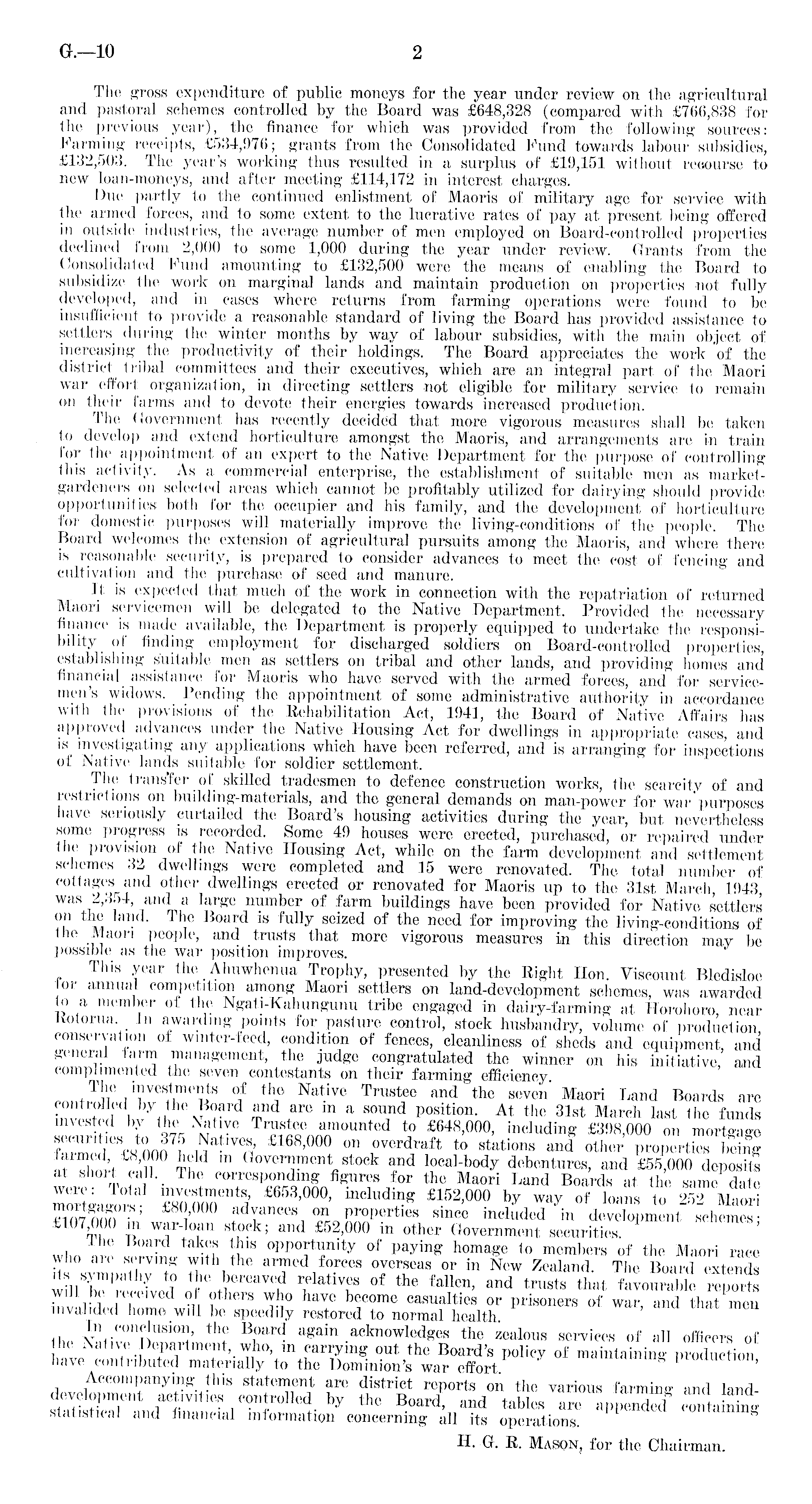The gross expenditure of public moneys for the year under review on the agricultural and pastoral schemes controlled by the Board was £648,328 (compared with £766,838 for the previous year), the finance for which was provided from the following sources: Farming receipts, £534,976; grants from the Consolidated Fund towards labour subsidies, £132,503. The year's working thus resulted in a surplus of £19,151 without recourse to new loan-moneys, and after meeting £114,172 in interest charges. Due partly to the continued enlistment of Maoris of military age for service with the armed forces, and to some extent to the lucrative rates of pay at present being offered in outside industries, the average number of men employed on Board-controlled properties declined from 2,000 to some 1,000 during the year under review. Grants from the Consolidated Fund amounting to £132,500 were the means of enabling the Board to subsidize the work on marginal lands and maintain production on properties not fully developed, and in cases where returns from farming operations were found to be insufficient to provide a reasonable standard of living the Board has provided assistance to settlers during the winter months by way of labour subsidies, with the main object of increasing the productivity of their holdings. The Board appreciates the work 'of the district tribal committees and their executives, which are an integral part of the Maori war effort organization, in directing settlers not eligible for military service to remain on their farms and to devote their energies towards increased production. The Government has recently decided that more vigorous measures shall be taken to develop and extend horticulture amongst the Maoris, and arrangements are in train for the appointment of an expert to the Native Department for the purpose of controlling this activity. As a commercial enterprise, the establishment of suitable men as marketgardeners on selected areas which cannot be profitably utilized for dairying should provide opportunities: both for the occupier and his family,'and the development of horticulture for domestic purposes will materially improve the living-conditions of the people. The Board welcomes the extension of agricultural pursuits among the Maoris, and where there is reasonable security, is prepared to consider advances to meet the cost of fencing and cultivation and the purchase of seed and manure. It is expected that much of the work in connection with the repatriation of returned Maori servicemen will be delegated to the Native Department. Provided the necessary finance is made available, the Department is properly equipped to undertake the responsibility of finding employment for discharged soldiers on Board-controlled properties, establishing suitable men as settlers on tribal and other lands, and providing homes and financial assistance for Maoris who have served with the armed forces, and for servicemen's widows. Pending the appointment of some administrative authority in accordance with the provisions of the Rehabilitation Act, 1941, the Board of Native Affairs has approved advances under the Native Housing Act for dwellings in appropriate cases, and ls , investigating any applications which have been referred, and is arranging for inspections of Native lands suitable for soldier settlement. The trans'fer of skilled tradesmen to defence construction works, the scarcity of and restrictions on building-materials, and the general demands on man-power for war purposes have seriously curtailed the Board's housing activities during the year, but nevertheless some progress is recorded. Some 49 houses were erected, purchased, or repaired under the provision of the Native Housing Act, while on the farm development, and settlement schemes 32 dwellings were completed and 15 were renovated. The total number of cottages and other dwellings erected or renovated for Maoris up to the 31st March 1943 was 2,354, and a large number of farm buildings have been provided for Native settlers on the land. The Board is fully seized of the need for improving the living-conditions of the Maori people, and trusts that more vigorous measures in this direction may be possible as trie war position improves. This year the Ahuwhenua Trophy, presented by the Right Hon. Viscount Bledisloe tor annual competition among Maori settlers on land-development schemes, was awarded to a member o± the Ngati-Kahungunu tribe engaged in dairy-farming at Horohoro near kotorua In awarding points for pasture control, stock husbandry, volume of production conservation of winter-feed, condition of fences, cleanliness of sheds and equipment, and general farm management, the judge congratulated the winner on his initiative, and complimented the seven contestants on their farming efficiency. The investments of the Native Trustee and the seven Maori Land Boards are ! and are m a sound position. At the 31st March last the funds invested by the Native Trustee amounted to £648,000, including £398,000 on mortgage farmed'£B 000 h £168 '° 0 ° + °" i to Btations and otW being nfX* ™ m Gove ™P ent /tock and local-body debentures, and £55,000 deposits at short call. The corresponding figures for the Maori Land Boards at the same date 3 '° o0 ' inCl " dinS £152 '° 00 by Way of loans 10 252 Maori Tinvrinn • ' advances on properties since included in development schemes- £{? in war-loan stock; and £52,000 in other Government securities. Ie hoard takes this opportunity of paying homage to members of the Maori race who are serving with the armed forces overseas or in New Zealand. The Board extends w llT^ceLd 0 of r eaVC h d ° f the fallen ' and tnists tha t favourable report will be received of others who have become casualties or prisoners of war, and that men invalided home will be speedily restored to normal health. th P th ? B r d again . acknowledges the zealous services of all officers of the Native Department, who, in carryin