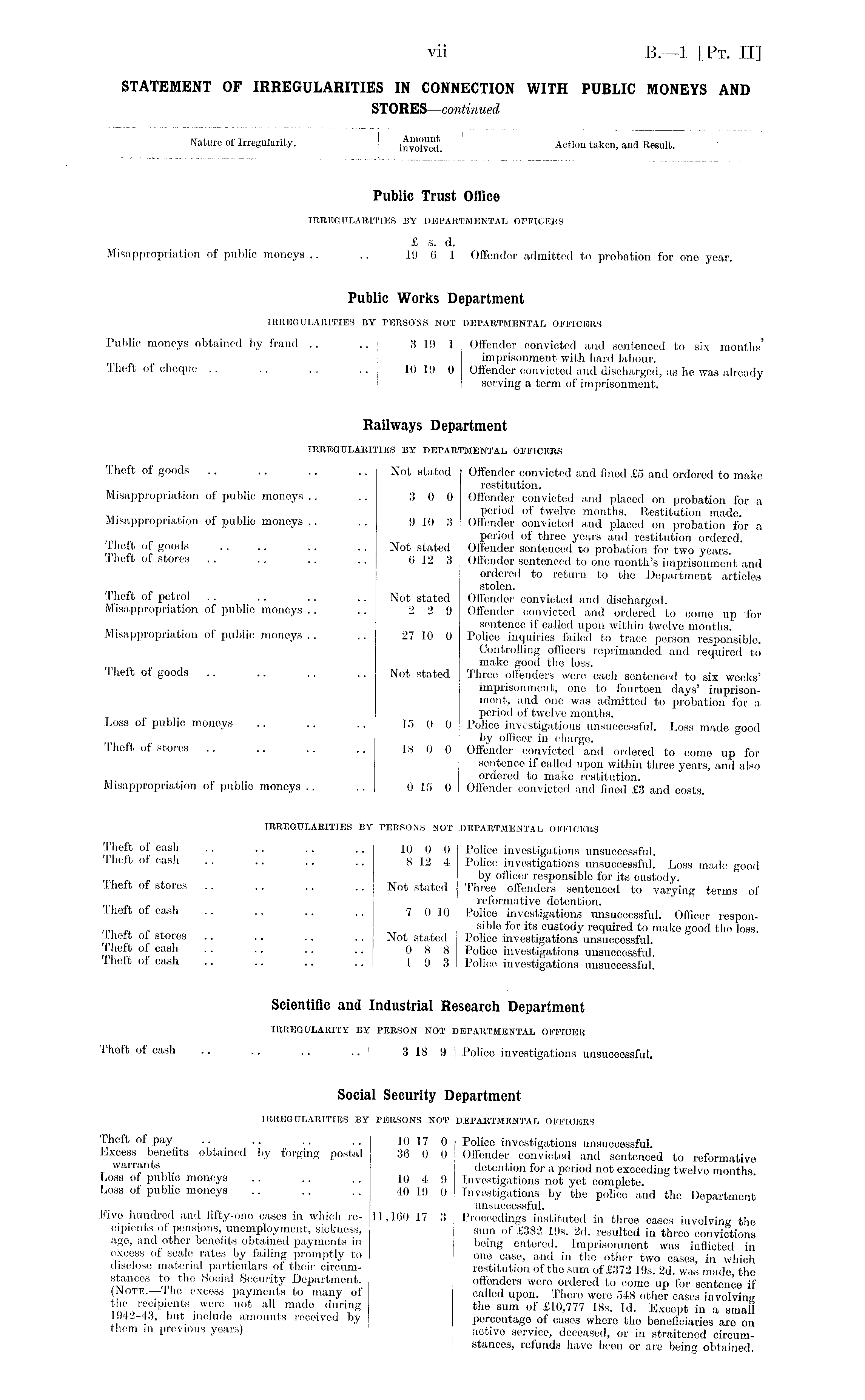 Nature of Irregularity. in™lv"d. Action taken - and Result. Public Trust Office IRREGULARITIES BY DEPARTMENTAL OFFICERS £ a. d. Misappropriation of public moneys .. .. I 19 6 1 Offender admitted to probation for one year. Public Works Department IRREGULARITIES BY PERSONS NOT DEPARTMENTAL OFFICERS Public moneys obtained by fraud .. .. j 3 19 1 Offender convicted and sentenced to six months' imprisonment with hard labour. Theft of cheque .. .. .. .. 10 19 0 Offender convicted and discharged, as he was already serving a term of imprisonment. Railways Department IRREGULARITIES BY DEPARTMENTAL OFFICERS Theft of goods .. .. .. .. Not stated Olfender convicted and fined £5 and ordered to make restitution. Misappropriation of public moneys .. .. 3 0 0 Offender convicted and placed on probation for a . . period of twelve months. Restitution made. Misappropriation of public moneys .. .. 9 10 3 Olfender convicted and placed on probation for a period of three years and restitution ordered, ihett ol goods .. .. .. .. Not stated Offender sentenced to probation for two years. J.heft of stores .. .. .. .. 6 12 3 Offender sentenced to one month's imprisonment and ordered to return to the Department articles stolen. Theft of petrol .. .. ,. .. Not stated Offender convicted and discharged. Misappropriation of public moneys .. .. 2 2 9 Offender convicted and ordered to come up for . . , sentence if called upon within twelve months. Misappropriation of public moneys .. .. 27 10 0 Police inquiries failed to trace person responsible. Controlling officers reprimanded and required to make good the loss. Theft of goods .. .. .. .. Not stated Three offenders were each sentenced to six weeks' imprisonment, one to fourteen days' imprisonment, and one was admitted to probation for a period of twelve months. Loss of public moneys .. .. .. 15 0 0 Police investigations unsuccessful. Loss made good by officer in charge. Theft of stores .. .. .. ., 1800 Offender convioted and ordered to come up for sentence if called upon within three years, and also ordered to make restitution. Misappropriation of public moneys .. .. 0 15 0 Offender convicted and fined £3 and costs. IRREGULARITIES BY PERSONS NOT DEPARTMENTAL OFFICERS Thrft °f cas h .. .. .. .. 10 0 0 Police investigations unsuccessful. J.heft of cash .. .. .. .. 8124 Police investigations unsuccessful. Loss made good ™ „ .by officer responsible for its custody. iheit ol stores .. .. .. .. Not stated Three offenders sentenced to varying terms of reformative detention. lheft of cash .. .. .. .. 7 0 10 Police investigations unsuccessful. Officer responsible for its custody required to make good the loss, inett ot stores .. .. .. .. Not stated Police investigations unsuccessful. >rwt * ° u " " " " 08 8 Police investigations unsuccessful. lheft of cash .. .. .. .. 19 3 Police investigations unsuccessful. Scientific and Industrial Research Department IRREGULARITY BY PERSON NOT DEPARTMENTAL OFFICER lheft of cash .. .. .. j 3 18 9 | Police investigations unsuccessful. Social Security Department IRREGULARITIES BY PERSONS NOT DEPARTMENTAL OFFICERS Theft of pay .. .. .. .. 10170 Police investigations unsuccessful. Lxcess benefits obtained by forging postal 36 0 0 Offender convicted and sentenced to reformative warrants _ detention for a period not exceeding twelve months. Loss of pubhc moneys .. .. .. 10 4 9 Investigations not yet complete. Loss of -public moneys 40 19 0 Investigations by the police and the Department unsuccessful. Five hundred and fifty-one oases in which re- 11,100 17 3 Proceedings instituted in three cases involving the cipients of pensions, unemployment, sickness, sum of £382 19s. 2d. resulted in three convictions age, and other benefits obtained payments in being entered. Imprisonment was inflicted in excess of scale rates by failing promptly to one case, and in the other two cases, in which disclose material particulars of their circum- restitution of the sum of £372 19s. 2d. was made the stances to the Social Security Department. offenders were ordered to come up for sentence if (Note.—The excess payments to many of called upon. There were 548 other eases involving • W ? re , not a11 made during the sum of £10,777 18s. Id. Except in a small 1942-43, but include amounts received by percentage of cases where the beneficiaries are on them m previous years) active service, deceased, or in straitened ciroumI stances, refunds have been or are being obtained.