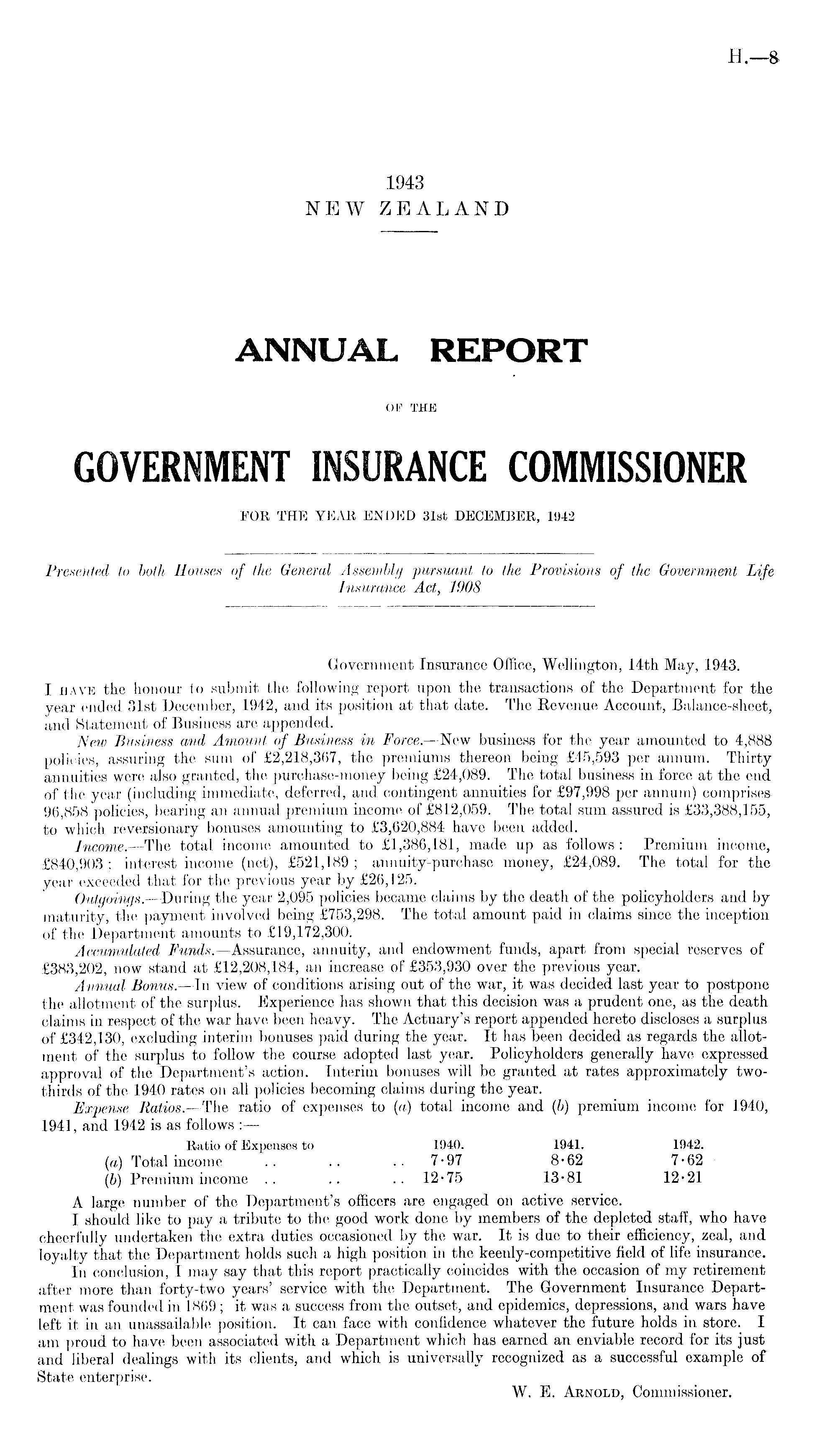 Government Insurance Office, Wellington, 14th May, 1943. I have the honour to submit the following report upon the transactions of the Department for the year ended 31st December, 1942, and its position at that date. The Revenue Account, Balance-sheet, and Statement of Business are appended. New Business and Amount of Business in Force.—New business for the year amounted to 4,888 policies, assuring the sum of £2,218,367, the premiums thereon being £45,593 per annum. Thirty annuities were also granted, the purchase-money being £24,089. The total business in force at the end of the year (including immediate, deferred, and contingent annuities for £97,998 per annum) comprises 96,858 policies, bearing an annual premium income of £812,059. The total sum assured is £33,388,155, to which reversionary bonuses amounting to £3,620,884 have been added. Income. —The total income amounted to £1,386,181, made up as follows : Premium income, £840,903 ; interest income (net), £521,189 ; annuity-purchase money, £24,089. The total for the year exceeded that for the previous year by £26,125. Outgoings.—During the year 2,095 policies became claims by the death of the policyholders and by maturity, the payment involved being £753,298. The total amount paid in claims since the inception of the Department amounts to £19,172,300. Accumulated Funds. —Assurance, annuity, and endowment funds, apart from special reserves of £383,202, now stand at £12,208,184, an increase of £353,930 over the previous year. Annual Bonus. —In view of conditions arising out of the war, it was decided last year to postpone the allotment of the surplus. Experience has shown that this decision was a prudent one, as the death claims in respect of the war have been heavy. The Actuary's report appended hereto discloses a surplus of £342,130, excluding interim bonuses paid during the year. It has been decided as regards the allotment of the surplus to follow the course adopted last year. Policyholders generally have expressed approval of the Department's action. Interim bonuses will be granted at rates approximately twothirds of the 1940 rates on all policies becoming claims during the year. Expense Ratios. —The ratio of expenses to (a) total income and (b) premium income for 1940,. 1941, and 1942 is as follows : — Ratio of Expenses to 1940. 1941. 1942. (a) Total income .. .. .. 7-97 8-62 7-62 (b) Premium income .. .. .. 12-75 13-81 12-21 A large number of the Department's officers are engaged on active service. I should like to pay a tribute to the good work done by members of the depleted staff, who have cheerfully undertaken the extra duties occasioned by the war. It is due to their efficiency, zeal, and loyalty that the Department holds such a high position in the keenly-competitive field of life insurance. In conclusion, I may say that this report practically coincides with the occasion of my retirement after more than forty-two years' service with the Department. The Government Insurance Department was founded in 1869; it was a success from the outset, and epidemics, depressions, and wars have left it in an unassailable position. It can face with confidence whatever the future holds in. store. I am proud to have been associated with a Department which has earned an enviable record for its just and liberal dealings with its clients, and which is universally recognized as a successful example of State enterprise. W. E. Arnold, Commissioner.