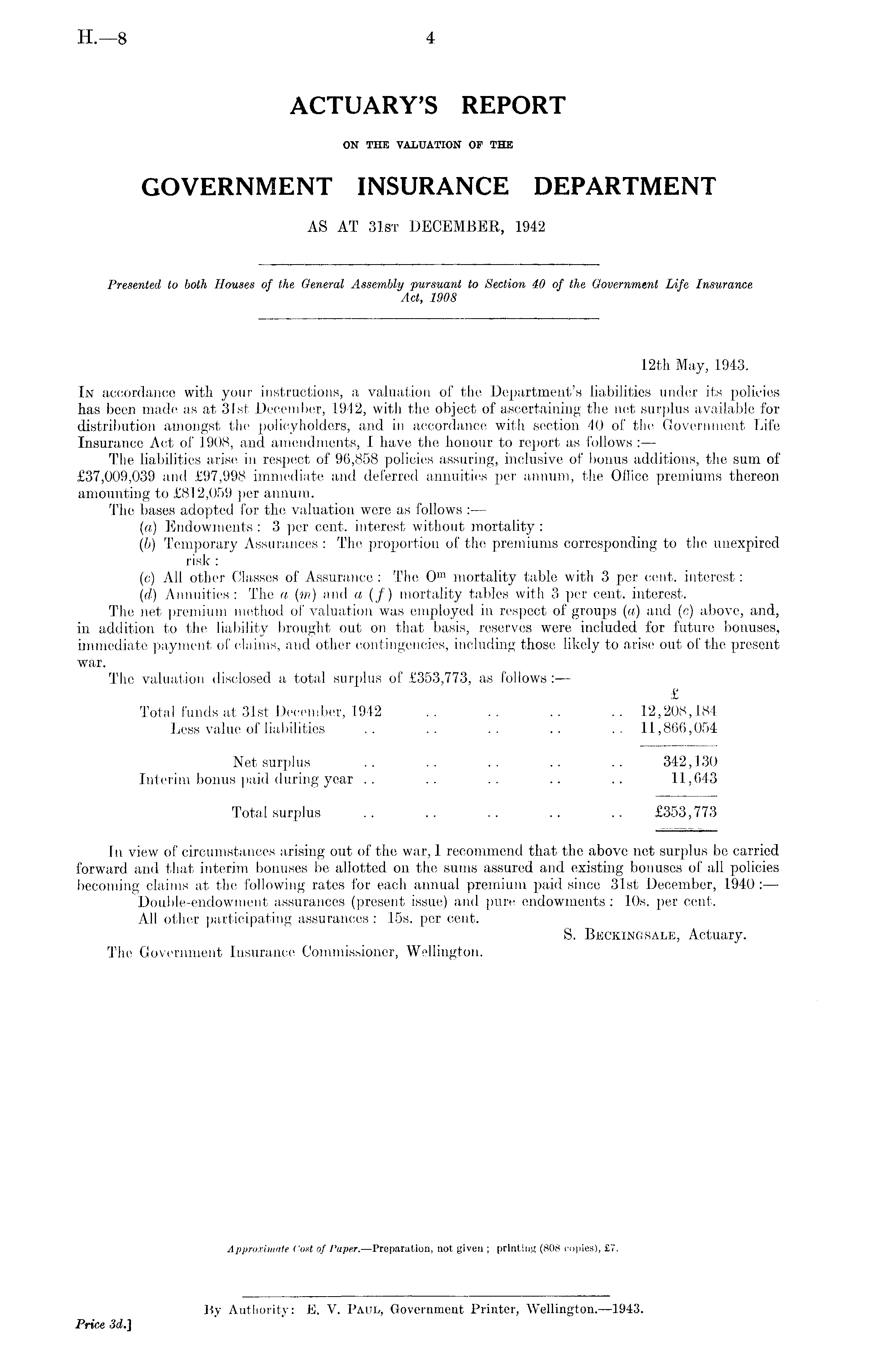 12th May, 1943. In accordance with your instructions, a valuation of the Department's liabilities under its policies has been made as at 31st December, 1942, with the object of ascertaining the net surplus available for distribution amongst the policyholders, and in accordance with section 40 of the Government Life Insurance Act of 1908, and amendments, I have the honour to report as follows:— The liabilities arise in respect of 96,858 policies assuring, inclusive of bonus additions, the sum of £37,009,039 and £97,998 immediate and deferred annuities per annum, the Office premiums thereon amounting to £812,059 per annum. The bases adopted for the valuation were as follows : — (а) Endowments : 3 per cent, interest without mortality : (б) Temporary Assurances : The proportion of the premiums corresponding to the unexpired risk: (c) All other Classes of Assurance : The O m mortality table with 3 per cent, interest: (d) Annuities : The a (m) and a (/) mortality tables with 3 per cent, interest. The net premium method of valuation was employed in respect of groups (a) and (c) above, and, in addition to the liability brought out on that basis, reserves were included for future bonuses, immediate payment of claims, and other contingencies, including those likely to arise out of the present war. The valuation disclosed a total surplus of £353,773, as follows : — £ Total funds at 31st December, 1942 .. .. .. .. 12,208,184 Less value of liabilities .. .. .. .. .. 11,866,054 Net surplus .. .. .. .. .. 342,130 Interim bonus paid during year .. .. .. .. .. 11,643 Total surplus .. .. .. .. .. £353,773 In view of circumstances arising out of the war, I recommend that the above net surplus be carried forward and that interim bonuses be allotted on the sums assured and existing bonuses of all policies becoming claims at the following rates for each annual premium paid since 31st December, 1940 : — Double-endowment assurances (present issue) and pure endowments : 10s. per cent. All other participating assurances: 15s. per cent. S. Becking,sale, Actuary. The Government Insurance Commissioner, Wellington.