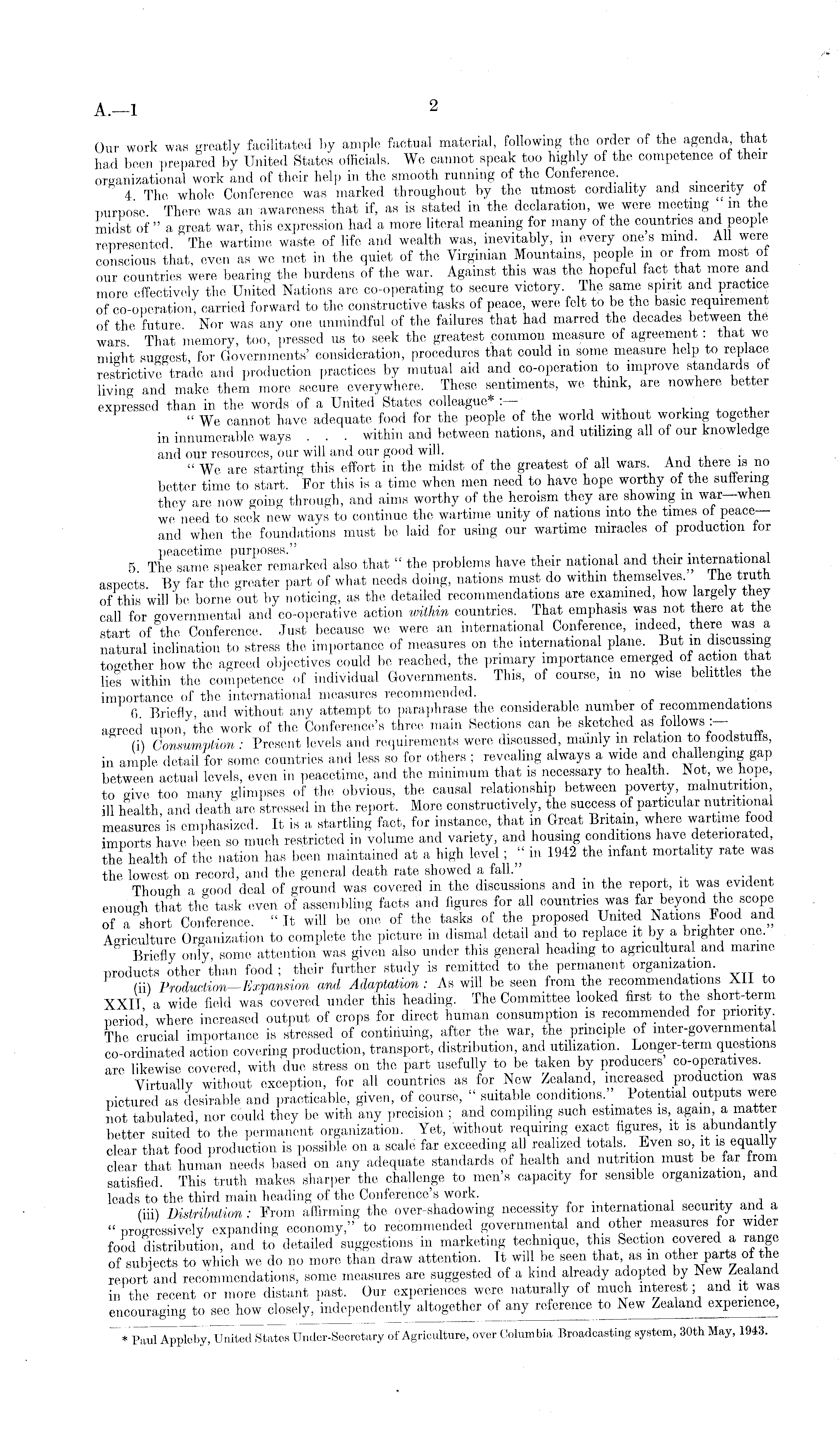 Our work was greatly facilitated by ample factual material, following the order of the agenda that had been prepared by United States officials. Wo cannot speak too highly of the competence of their organizational work and of their help in the smooth running of the Conference. 4 The whole Conference was marked throughout by the utmost cordiality and sincerity of ■purpose There was an awareness that if, as is stated in the declaration, we were meeting m the midst of " a great war, this expression had a more literal meaning for many of the countries and people represented The wartime waste of life and wealth was, inevitably, in every one s mind. All were conscious that, even as we met in the quiet of the Virginian Mountains people m or from most of our countries were bearing the burdens of the war. Against this was the hopeful fact that more and more effectively the United Nations are co-operating to secure victory. The same spirit and practice of co-operation, carried forward to the constructive tasks of peace, were felt to be the basic requirement of the future Nor was any one unmindful of the failures that had marred the decades between the wars That memory, too, pressed us to seek the greatest common measure of agreement : that we might suggest, for Governments' consideration, procedures that could in some measure help to replace restrictive trade and production practices by mutual aid and_ co-operation to improve standards of living and make them more secure everywhere. These sentiments, we think, are nowhere better expressed than in the words of a United States colleague* : 1 ; " We cannot have adequate food for the people of the world without working together in innumerable ways . . . within and between nations, and utilizing all of our knowledge and our resources, our will and our good will. , , "We are starting this effort in the midst of the greatest of all wars. And there is no better time to start. ' For this is a time when men need to have hope worthy of the suffering they are now going through, and aims worthy of the heroism they are showing m war when we need to seek new ways to continue the wartime unity of nations into the times of peace— and when the foundations must be laid for using our wartime miracles of production tor 5. The same speaker remarked also that " the problems have their national and their international aspects By far the greater part of what needs doing, nations must do within themselves. The truth of this will be borne out by noticing, as the detailed recommendations are examined, how largely they call for governmental and co-operative action within countries. That emphasis was not there at the start of the Conference. Just because we were an international Conference, indeed, there was a natural inclination to stress the importance of measures on the international plane. But in discussing together how the agreed objectives could be reached, the primary importance emerged of action that lies within the competence of individual Governments. This, of course, m no wise belittles the importance of the international measures recommended. 6 Briefly and without any attempt to paraphrase the considerable number of recommendations agreed upon, the work of the Conference's three main Sections can be sketched as follows (i) Consumption : Present levels and requirements were discussed, mainly m relation to foodstuffs, in ample detail for some countries and less so for others ; revealing always a wide and challenging gap between actual levels, even in peacetime, and the minimum that is necessary to health. Not we hope, to give too many glimpses of the obvious, the causal relationship between poverty, malnutrition ill health and death are stressed in the report. More constructively, the success of particular nutritional measures'is emphasized. It is a startling fact, for instance, that in Great Britain, where wartime food imports have been so much restricted in volume and variety, and housing conditions have deteriorated, the health of the nation has been maintained at a high level ; " m 1942 the infant mortality rate was the lowest on record, and the general death rate showed a fall." Though a good deal of ground was covered in the discussions and m the report, it was evident enough that the task even of assembling facts and figures for all countries was far beyond the scope of a short Conference. "It will be one of the tasks of the proposed United Nations Food and Agriculture Organization to complete the picture in dismal detail and to replace it by a brighter one. Briefly only some attention was given also under this general heading to agricultural and marine products other' than food ; their further study is remitted to the permanent organization. (ii) Production —Expansion and Adaptation: As will be seen from the recommendations XII to XXII a wide field was covered under this heading. The Committee looked first to the short-term period' where increased output of crops for direct human consumption is recommended for priority. The crucial importance is stressed of continuing, after the war, the principle of mter-governmental co-ordinated action covering production, transport, distribution, and utilization. Longer-term questions are likewise covered, with due stress on the part usefully to be taken by producers co-operatives. Virtually without exception, for all countries as for New Zealand, increased production was pictured as desirable and practicable, given, of course, " suitable conditions.'' Potential outputs were not tabulated, nor could they be with any precision ; and compiling such estimates is, again a matter better suited to the permanent organization. Yet, without requiring exact figures, it is abundantly clear that food production is possible on a scale far exceeding all realized totals._ Fven so it is equally clear that human needs based on any adequate standards of health and nutrition must be far from satisfied. This truth makes sharper the chal