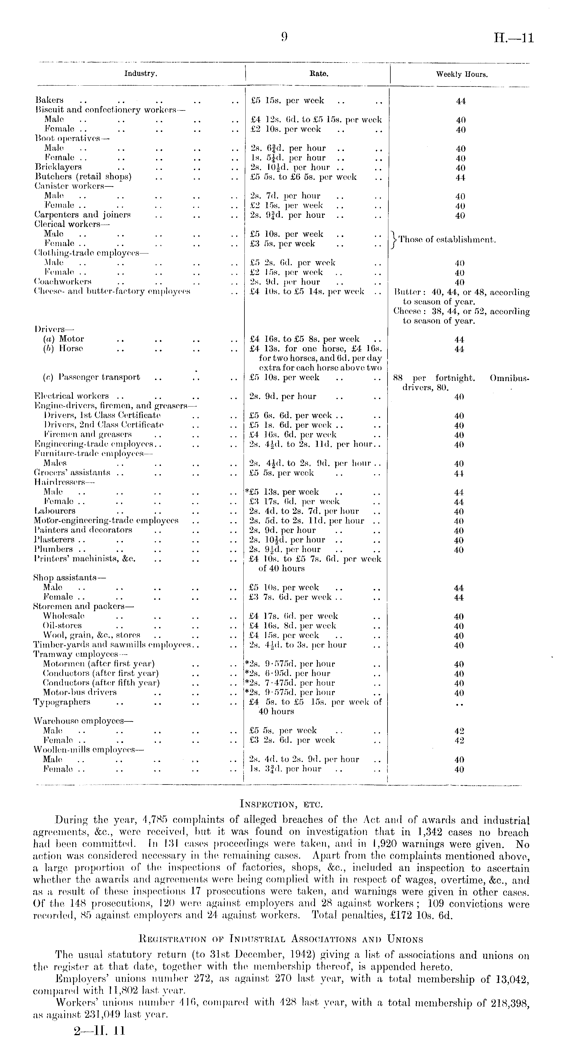 Industry. Hate. Weekly Hours. Bakers .. .. .. .. £5 15s. per week .. .. 44 Biscuit and confectionery workers— Male .. .. .. .. £4 12s. 6d. to £5 15s. per week 40 Female .. .. .. .. £2 10s. per week .. .. 40 Boot operatives— Male .. .. .. .. 2s. 0|d. per hour .. .. 40 Female . . .. .. .. Is. 5Jd. per hour .. .. 40 Bricklayers .. .. .. 2s. 10Jd. per hour .. .. 40 Butchers (retail shops) .. .. £5 5s. to £6 5s. per week .. 44 Canister workers — Male .. .. .. .. 2s. 7d. per hour .. .. 40 Female .. .. .. .. £2 15s. per week .. .. 40 Carpenters and joiners .. .. 2s. 9fd. per hour .. .. 40 Clerical workers — Male .. .. .. .. £5 10s. per week .. .. "I m , . . ,, Female £3 5s. per week .. .. jThose of establishment. Clothing-trade employees — Male .. .. .. .. £5 2s. 6d. per week .. 40 Female .. .. .. .. £2 15s. per week .. .. 40 Coachworkers .. .. .. 2s. 9d. per hour .. .. 40 Cheese-and butter-factory employees .. £4 10s. to £5 14s. per week .. Butter: 40, 44, or 48, according to season of year. Cheese : 38, 44, or 52, according to season of year. Drivers — (a) Motor .. .. .. £4 16s. to £5 8s. per week .. 44 (ft) Horse .. .. .. £4 13s. for one horse, £4 16s. 44 for two horses, and 6d. per day extra for each horse above two (c) Passenger transport .. .. .. £5 10s. per week .. .. 88 per fortnight. Omnibusdrivers, 80. Electrical workers .. .. .. 2s. 9d. per hour .. .. 40 Engine-drivers, firemen, and greasers — Drivers, 1st Class Certificate .. .. £5 6s. 6d. per week .. .. 40 Drivers, 2nd Class Certificate .. £5 Is. 6d. per week .. .. 40 Firemen and greasers .. .. £4 16s. 6d. per week .. 40 Engineering-trade employees.. .. .. 2s. 4Jd. to 2s. lid, per hour.. 40 Furniture-trade employees — Males .. .. .. 2s. 4£d. to 2s. 9d. per hour.. 40 Grocers' assistants .. .. .. £5 5s. per week .. .. 44 Hairdressers — Male .. .. .. .. .. *£5 13s. per week .. .. 44 Female .. .. .. .. £3 17s. 6d. per week .. 44 Labourers .. .. .. .. 2s. 4d. to 2s. 7d. per hour 40 Motor-engineering-trade employees .. 2s. 5d. to 2s. lid. per hour .. 40 Painters and decorators .. .. 2s. 9d. per hour .. .. 40 Plasterers .. .. .. .. 2s. 10Jd. per hour .. .. 40 Plumbers .. .. .. .. 2s. 9|d. per hour .. .. 40 Printers' machinists, &c. .. .. £4 10s. to £5 7s. 6>d. per week of 40 hours Shop assistants— Male .. ., .. .. £5 10s. per week .. .. 44 Female .. .. .. .. £3 7s. 6d. per week .. .. 44 Storemcn and packers— Wholesale .. .. .. .. £4 17s. 6d. per week .. 40 Oil-stores .. .. .. £4 16s. 8d. per week .. 40 Wool, grain, &c., stores .. .. £4 15s. per week .. .. 40 Timber-yards and sawmills employees.. .. 2s. 4|d. to 3s. per hour .. 40 Tramway employees— Motormen (after first year) .. .. *2s. 9 ■ 575d. per hour .. 40 Conductors (after first year) .. .. *2s. 6• 95d. per hour .. 40 Conductors (after fifth year) .. .. *2s. 7-475d. per hour 40 Motor-bus drivers .. .. .. *2s. 9-575d. per hour .. 40 Typographers .. .. .. £4 5s. to £5 15s. per week of 40 hours Warehouse employeesMale .. .. .. .. £5 5s. per week .. .. 42 Female .. .. .. .. £3 2s. 6d. per week .. 42 Woollen-mills employeesMale .. .. .. .. 2s. 4d. to 2s. 9d. per hour .. 40 Female .. .. .. .. ..Is. 3$-d. per hour .. .. 40 I