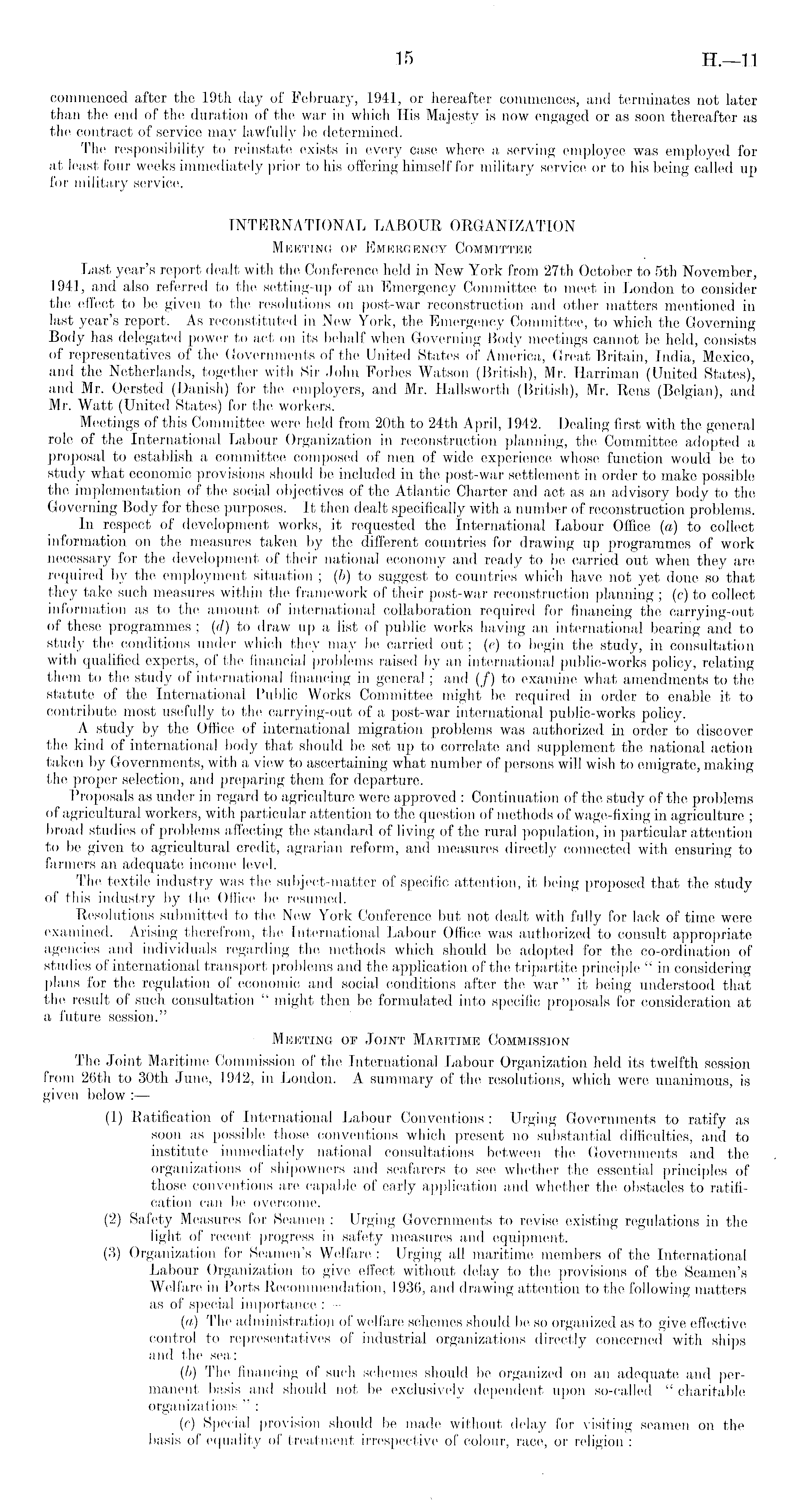 commenced after the 19tli day of February, 1941, or hereafter commences, and terminates not later than the end of the duration of the war in which His Majesty is now engaged or as soon thereafter as the contract of service may lawfully bo determined. The responsibility to reinstate exists in every case whore a serving employee was employed for at least four weeks immediately prior to his offering himself for military service or to his being called up for military service. INTERNATIONAL LABOUR ORGANIZATION Meeting of Emergency Committee Last year's report dealt with the Conference held in New York from 27th October to sth November, 1941,. and also referred to the setting-up of an Emergency. Committee to meet in London to consider the effect to be given to the resolutions on post-war reconstruction and other matters mentioned in last year's report. As reconstituted in New York, the Emergency Committee, to which the Governing Body has delegated power to act on its behalf when Governing Body meetings cannot be held, consists of representatives of the Governments of the United States of America, Great Britain, India, Mexico, and the Netherlands, together with Sir John Forbes Watson (British), Mr. Harriman (United States), and Mr. Oersted (Danish) for the employers, and Mr. Hallsworth (British), Mr. Reus (Belgian), and Mr. Watt (United States) for the workers. Meetings of this Committee were held from 20th to 24th April, 1942. Dealing first with the general role of the International Labour Organization in reconstruction planning, the Committee adopted a proposal to establish a committee composed of men of wide experience whose function would be to study what economic provisions should lie included in the post-war settlement in order to make possible the implementation of the social objectives of the Atlantic Charter and act as an advisory body to the Governing Body for these purposes. It then dealt specifically with a number of reconstruction problems. In respect of development works, it requested the International Labour Office (a) to collect information on the measures taken by the different countries for drawing up programmes of work necessary for the development of their national economy and ready to be carried out when they are required by the employment situation ; (/)) to suggest to countries which have not yet done so that they take such measures within the framework of their post-war reconstruction planning ; (c) to collect information as to the amount of international collaboration required for financing the carrying-out of these programmes ; (d) to draw up a list of public works having an international bearing and to study the conditions under which they may be carried out; (e) to begin the study, in consultation with qualified experts, of the financial problems raised by an international public-works policy, relating them to the study of international financing in general; and (/) to examine what amendments to the statute of the International Public Works Committee might be required iu order to enable it to contribute most usefully to the carrying-out of a post-war international public-works policy. A study by the Office of international migration problems was authorized in order to discover the kind of international body that should be set up to correlate and supplement the national action taken by Governments, with a view to ascertaining what number of persons will wish to emigrate, making the proper selection, and preparing them for departure. Proposals as under in regard to agriculture were approved: Continuation of the study of the problems of agricultural workers, with particular attention to the question of methods of wage-fixing in agriculture ; broad studies of problems affecting the standard of living of the rural population, in particular attention to be given to agricultural credit, agrarian reform, and measures directly connected with ensuring to farmers an adequate income level. The textile industry was the subject-matter of specific attention, it being proposed that the study of this industry by the Office be resumed. Resolutions submitted to the New York Conference but not dealt with fully for lack of time were examined. Arising therefrom, the International Labour Office was authorized to consult appropriate agencies and individuals regarding the methods which should be adopted for the co-ordination of studies of international transport problems and the application of the tripartite principle " in considering plans for the regulation of economic and social conditions after the war" it being understood that the result of such consultation " might then be formulated into specific proposals for consideration at a future session." Meeting op Joint Maritime Commission The Joint Maritime Commission of the International Labour Organization held its twelfth session from 26th to 30th June, 1942, in London. A summary of the resolutions, which were unanimous, is given below : — (1) Ratification of International Labour Conventions : Urging Governments to ratify as soon as possible those conventions which present no substantial difficulties, and to institute immediately national consultations between the Governments and the organizations of shipowners and seafarers to see whether the essential principles of those conventions are capable of early application and whether the obstacles to ratification can be overcome. (2) Safety Measures for Seamen : Urging Governments to revise existing regulations in the light of recent progress in safety measure's and equipment. (3) Organization for Seamen's Welfare : Urging all maritime members of the International Labour Organization to give effect without delay to the provisions of the Seamen's Welfare in Ports Recommendation, 1936, and drawing attention to the following matters as of special importance : — (a) The administration of welfare schemes should be so organized as to give effective control to representatives of industrial organi