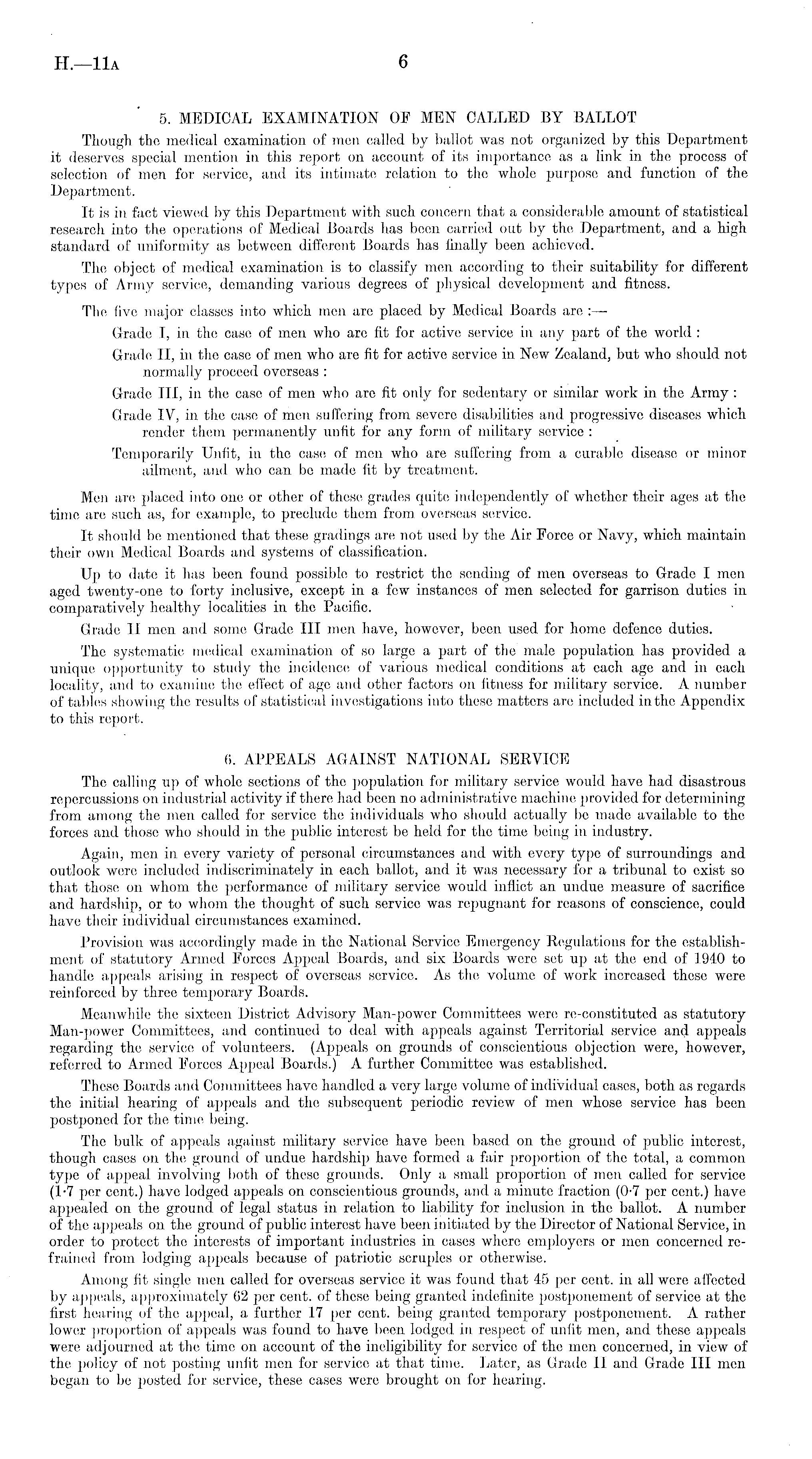 5. MEDICAL EXAMINATION OF MEN CALLED BY BALLOT Though the medical examination of men called by ballot was not organized by this Department it deserves special mention in this report on account of its importance as a link in the process of selection of men for service, and its intimate relation to the whole purpose and function of the Department. It is in fact viewed by this Department with such concern that a considerable amount of statistical research into the operations of Medical Boards has been carried out by the Department, and a high standard of uniformity as between different Boards has finally been achieved. The object of medical examination is to classify men according to their suitability for different types of Army service, demanding various degrees of physical development and fitness. The five major classes into which men are placed by Medical Boards are : — Grade I, in the case of men ,who arc fit for active service in any part of the world : Grade 11, in the case of men who are fit for active service in New Zealand, but who should not normally proceed overseas : Grade 111, in the case of men who are fit only for sedentary or similar work in the Army : Grade IV, in the case of men suffering from severe disabilities and progressive diseases which render them permanently unfit for any form of military service : Temporarily Unfit, in the case of men who are suffering from a curable disease or minor ailment, and who can be made fit by treatment. Men are placed into one or other of these grades quite independently of whether their ages at the time are such as, for example, to preclude them from overseas service. It should be mentioned that these gradings are not used by the Air Force or Navy, which maintain their own Medical Boards and systems of classification. Up to date it has been found possible to restrict the sending of men overseas to Grade I men aged twenty-one to forty inclusive, except in a few instances of men selected for garrison duties in comparatively healthy localities in the Pacific. Grade II men and some Grade 111 men have, however, been used for home defence duties. The systematic medical examination of so large a part of the male population has provided a unique opportunity to study the incidence of various medical conditions at each age and in each locality, and to examine the effect of age and other factors on fitness for military service. A number of tables showing the results of statistical investigations into these matters are included in the Appendix to this report. 6. APPEALS AGAINST NATIONAL SERVICE The calling up of whole sections of the population for military service would have had disastrous repercussions on industrial activity if there had been no administrative machine provided for determining from among the men callcd for service the individuals who should actually be made available to the forces and those who should in the public interest be held for the time being in industry. Again, men in every variety of personal circumstances and with every type of surroundings and outlook were included indiscriminately in each ballot, and it was necessary for a tribunal to exist so that those on whom the performance of military service would inflict an undue measure of sacrifice and hardship, or to whom the thought of such service was repugnant for reasons of conscience, could have their individual circumstances examined. Provision was accordingly made in the National Service Emergency Regulations for the establishment of statutory Armed Forces Appeal Boards, and six Boards were set up at the end of 1940 to handle appeals arising in respect of overseas service. As the volume of work increased these were reinforced by three temporary Boards. Meanwhile the sixteen District Advisory Man-power Committees were re-constituted as statutory Man-power Committees, and continued to deal with appeals against Territorial service and appeals regarding the service of volunteers. (Appeals on grounds of conscientious objection were, however, referred to Armed Forces Appeal Boards.) A further Committee was established. These Boards and Committees have handled a very large volume of individual cases, both as regards the initial hearing of appeals and the subsequent periodic review of men whose service has been postponed for the time being. The bulk of appeals against military service have been based on the ground of public interest, though cases on the ground of undue hardshij) have formed a fair proportion of the total, a common type of appeal involving both of these grounds. Only a small proportion of men called for service (1-7 per cent.) have lodged appeals on conscientious grounds, and a minute fraction (0-7 per cent.) have appealed on the ground of legal status in relation to liability for inclusion in the ballot. A number of the appeals on the ground of public interest have been initiated by the Director of National Service, in order to protect the interests of important industries in cases where employers or men concerned refrained from lodging appeals because of patriotic scruples or otherwise. Among fit single men called for overseas service it was found that 45 per cent, in all were affected by appeals, approximately 62 per cent, of these being granted indefinite postponement of service at the first hearing of the appeal, a further 17 per cent, being granted temporary postponement. A rather lower proportion of appeals was found to have been lodged in respect of unfit men, and these appeals were adjourned at the time on account of the ineligibility for scrvice of the men concerned, in view of the policy of not posting unfit men for service at that time. Later, as Grade II and Grade 111 men began to be posted for service, these cases were brought on for hearing.