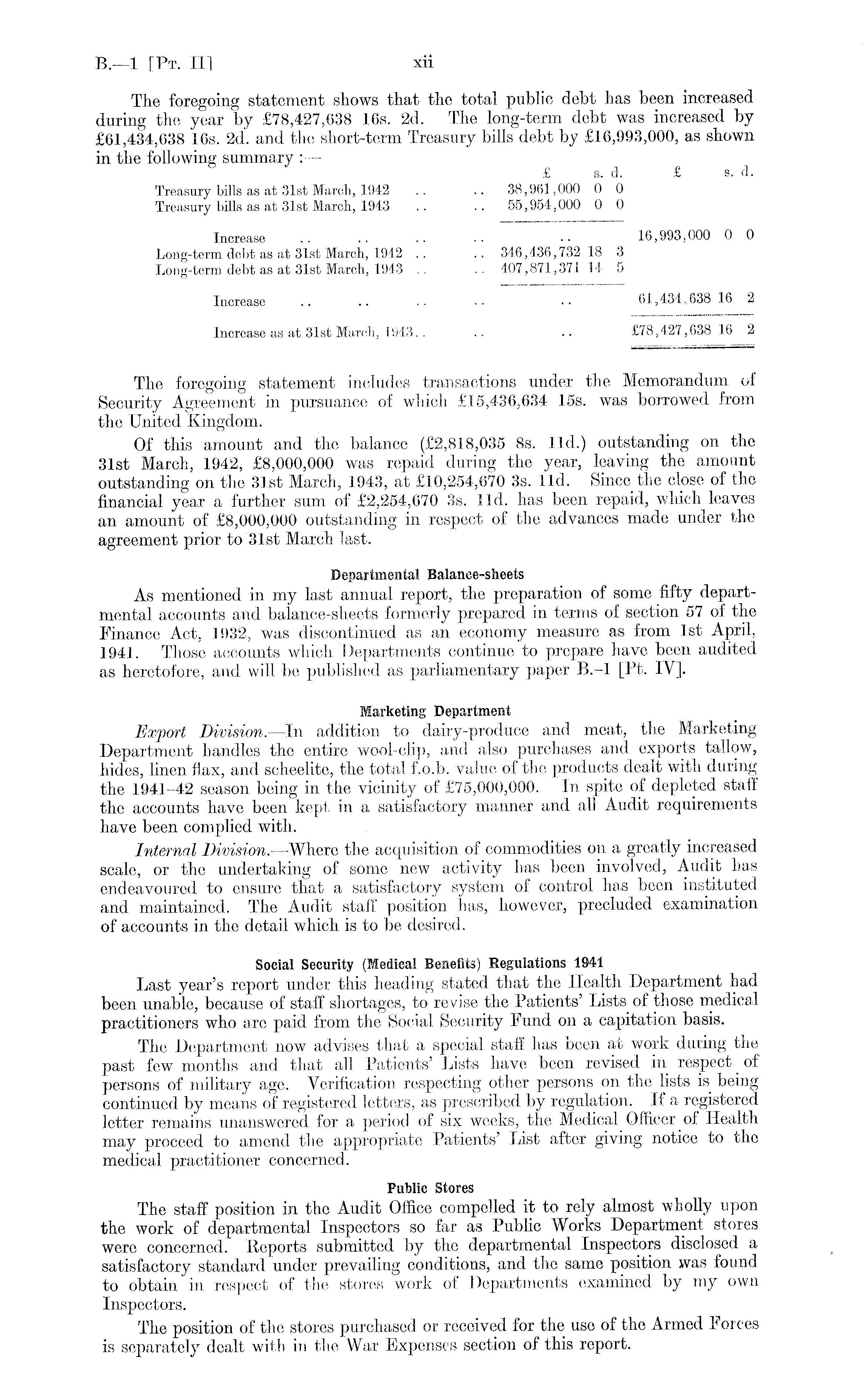 The foregoing statement shows that the total public debt has been increased during the year by £78,427,638 16s. 2d. The long-term debt was increased by £61,434,638 16s. 2d. and the short-term Treasury bills debt by £16,993,000, as shown in the following summary : — £ s. d. £ s. <3. Treasury bills as at 31st March, 1942 .. .. 38,961,000 0 0 Treasury bills as at 31st March, 1943 .. .. 55,954,000 0 0 Increase .. .. .. •• •■ 16,993,000 0 0 Long-term debt as at 31st March, 1942 . . .. 346,436,732 18 3 Long-term debt as at 31st March, 1943 .. .. 407,871,371 14 5 Increase .. .. .. •• 61,434.638 16 2 Increase as at 31st March, 1943.. .. .. £78,427,638 16 2 The foregoing statement includes transactions under the Memorandum of Security Agreement in pursuance of which £.15,436,634 15s. was borrowed from the United Kingdom. Of this amount and the balance (£2,818,035 Bs. lid.) outstanding on the 31st March, 1942, £8,000,000 was repaid during the year, leaving the amount outstanding on the 31st March, 1943, at £10,254,670 3s. lid. Since the close of the financial year a further sum of £2,254,670 3s. lid. has been repaid, which leaves an amount of £8,000,000 outstanding in respect of the advances made under the agreement prior to 31st March last. Departmental Balance-sheets As mentioned in my last annual report, the preparation of some fifty departmental accounts and balance-sheets formerly prepared in terms of section 57 of the Finance Act, 1932, was discontinued as an economy measure as from Ist April, 1941. Those accounts which Departments continue to prepare have been audited as heretofore, and will be published as parliamentary paper 8.-l [Pt. IV]. Marketing Department Export Division. —In addition to dairy-produce and meat, the Marketing Department handles the entire wool-clip, and also purchases and exports tallow, hides, linen flax, and scheelite, the total f.o.b. value of the products dealt with during the 1941-42 season being in the vicinity of £75,000,000. In spite of depleted staff the accounts have been kept in a satisfactory manner and all Audit requirements have been complied with. Internal Division. —Where the acquisition of commodities on a greatly increased scale, or the undertaking of some new activity has been involved, Audit has endeavoured to ensure that a satisfactory system of control has been instituted and maintained. The Audit staff position has, however, precluded examination of accounts in the detail which is to be desired. Social Security (Medical Benefits) Regulations 1941 Last year's report under this heading stated that the Health Department had been unable, because of staff shortages, to revise the Patients' of those medical practitioners who are paid from the Social Security Fund on a capitation basis. The Department now advises that a special staff has been at work during the past few months and that all Patients' Lists have been revised in respect of persons of military age. Verification respecting other persons on the lists is being continued by means of registered letters, as prescribed by regulation. If a registered letter remains unanswered for a period of six weeks, the Medical Officer of Health may proceed to amend the appropriate Patients' List after giving notice to the medical practitioner concerned. Public Stores The staff position in the Audit Office compelled it to rely almost wholly upon the work of departmental Inspectors so far as Public Works Department stores were concerned. Reports submitted by the departmental Inspectors disclosed a satisfactory standard under prevailing conditions, and the same position was found to obtain in respect of the stores work of Departments examined by my own Inspectors. The position of the stores purchased, or received for the use of the Armed h orces is separately dealt with in the War Expenses section of this report.