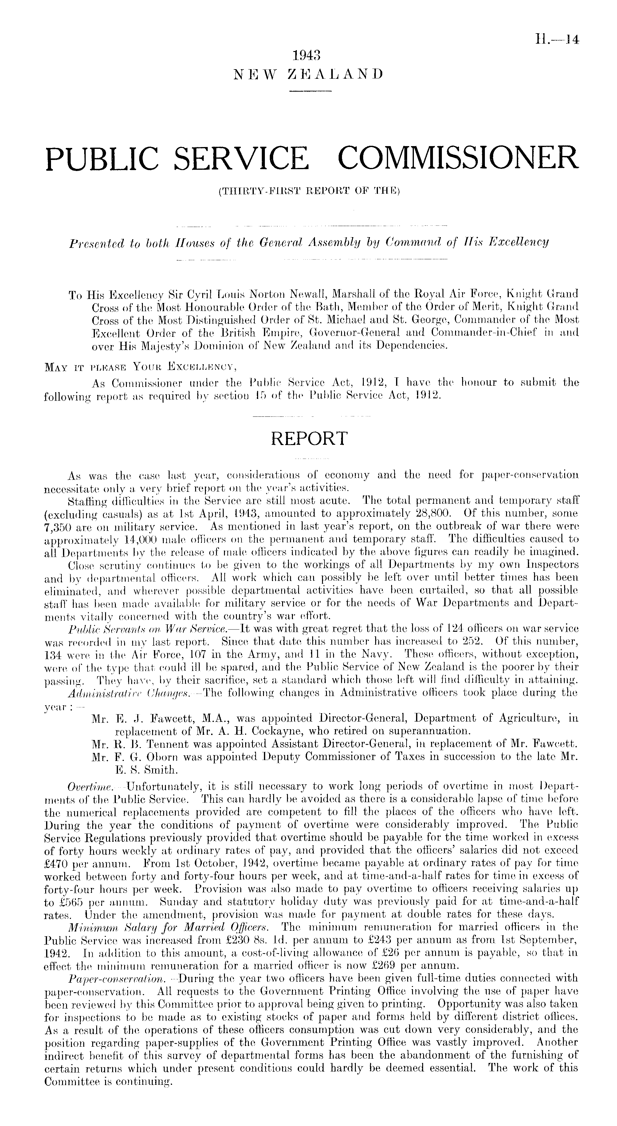 To His Excellency Sir Cyril Louis Norton Newall, Marshall of the Royal Air Force, Knight Grand Cross of the Most Honourable Order of the Bath, Member of the Order of Merit, Knight Grand Cross of the Most Distinguished Order of St. Michael and St. George, Commander of the Most Excellent Order of the British Empire, Governor-General and Commander-in-Chief in and over His Majesty's Dominion of New Zealand and its Dependencies. May it please Youb Excellency,---As Commissioner under the Public Service Act, .1912, I have the honour to submit the following report as required by section 15 of the Public Service Act, 1912.