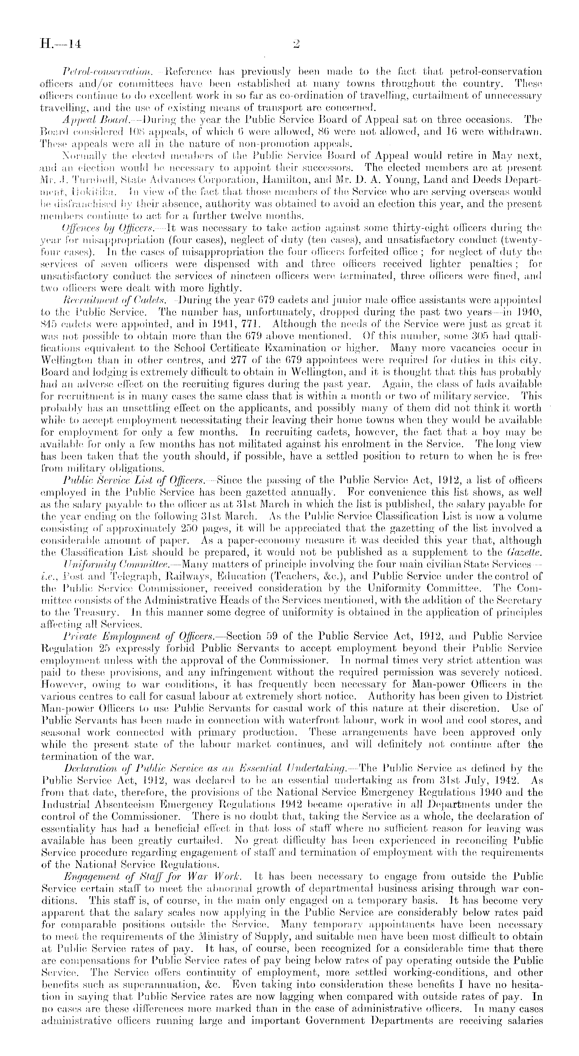 Petrol-conservation.— Reference lias previously been made to the fact that petrol-conservation officers and/or committees have been established at many towns throughout the country. These officers continue to do excellent work in so far as co-ordination of travelling, curtailment of unnecessary travelling, and the use of existing means of transport are concerned. Appeal Board. —During the year the Public Service Board of Appeal sat on three occasions. The Board considered 108 appeals, of which 6 were allowed, 86 were not allowed, and 16 were withdrawn. These appeals were all in the nature of non-promotion appeals. Normally the elected members of the Public Service Board of Appeal would retire in May next, and an election would be necessary to appoint their successors. The elected members are at present Mr. J. Turnbull, State Advances Corporation, Hamilton, and Mr. D. A. Young, Land and Deeds Department, Hokitika. In view of the fact that those members of the Service who are serving overseas would be disfranchised by their absence, authority was obtained to avoid an election this year, and the present members continue to act for a further twelve months. Offences by Officers. —It was necessary to take action against some thirty-eight officers during the year for misappropriation (four cases), neglect of duty (ten eases), and unsatisfactory conduct (twentyfour cases). In the cases of misappropriation the four officers forfeited office ; for neglect of duty the services of seven officers were dispensed with and three officers received lighter penalties ; for unsatisfactory conduct the services of nineteen officers were terminated, three officers were fined, and two officers were dealt with more lightly. Recruitment of Cadets. —During the year 679 cadets and junior male office assistants were appointed to the Public Service. The number has, unfortunately, dropped during the past two years —in 1940, ■845 cadets were appointed, and in 1941, 771. Although the needs of the Service were just as great it was not possible to obtain more than the 679 above mentioned. Of this number, some 305 had qualifications equivalent to the School Certificate Examination or higher. Many more vacancies occur in Wellington than in other centres, and 277 of the 679 appointees were required for duties in this city. Board and lodging is extremely difficult to obtain in Wellington, and it is thought that this has probably had an adverse effect on the recruiting figures during the past year. Again, the class of lads available for recruitment is in many cases the same class that is within a month or two of military service. This probably has an unsettling effect on the applicants, and possibly many of them did not think it worth while to accept employment necessitating their leaving their home towns when they would be available for employment for only a few months. In recruiting cadets, however, the fact that a boy may be available for only a few months has not militated against his enrolment in the Service. The long view has been taken that the youth should, if possible, have a settled position to return to when he is free from military obligations. Public Service List of Officers. —Since the passing of the Public Service Act, 1912, a list of officers ■employed in the Public Service has been gazetted annually. For convenience this list shows, as well as the salary payable to the officer as at 31st March in which the list is published, the salary payable for the year ending on the following 31st March. As the Public Service Classification List is now a volume consisting of approximately 250 pages, it will be appreciated that the gazetting of the list involved a considerable amount of paper. As a paper-economy measure it was decided this year that, although the Classification List should be prepared, it would not be published as a supplement to the Gazette. Uniformity Committee. —Many matters of principle involving the four main civilian State Services — i.e., Post and Telegraph, Railways, Education (Teachers, &c.), and Public Service under the control of the Public Service Commissioner, received consideration by the Uniformity Committee. The Committee consists of the Administrative Heads of the Services mentioned, with the addition of the Secretary to the Treasury. In this manner some degree of uniformity is obtained in the application of principles affecting all Services. Private Employment of Officers. —Section 59 of the Public Service Act, 1912, and Public Service Regulation 25 expressly forbid Public Servants to accept employment beyond their Public Service employment unless with the approval of the Commissioner. In normal times very strict attention was paid to these provisions, and any infringement without the required permission was severely noticed. However, owing to war conditions, it has frequently been necessary for Man-power Officers in the various centres to call for casual labour at extremely short notice. Authority has been given to District Man-pow'er Officers to use Public Servants for casual work of this nature at their discretion. Use of Public Servants has been made in connection with waterfront labour, work in wool and cool stores, and seasonal work connected with primary production. These arrangements have been approved only while the present state of the labour market continues, and will definitely not continue after the termination of the war. Declaration of Public Service as an Essential Undertaking. —The Public Service as defined by the Public Service Act, 1912, was declared to be an essential undertaking as from 31st July, 1942. As from that date, therefore, the provisions of the National Service Emergency Regulations 1940 and the Industrial Absenteeism Emergency Regulations 1942 became operative in all Departments under the control of the Commissioner. There is no doubt that, taking the Service as a whole, the declaration of essentiality has had a beneficial effect in t