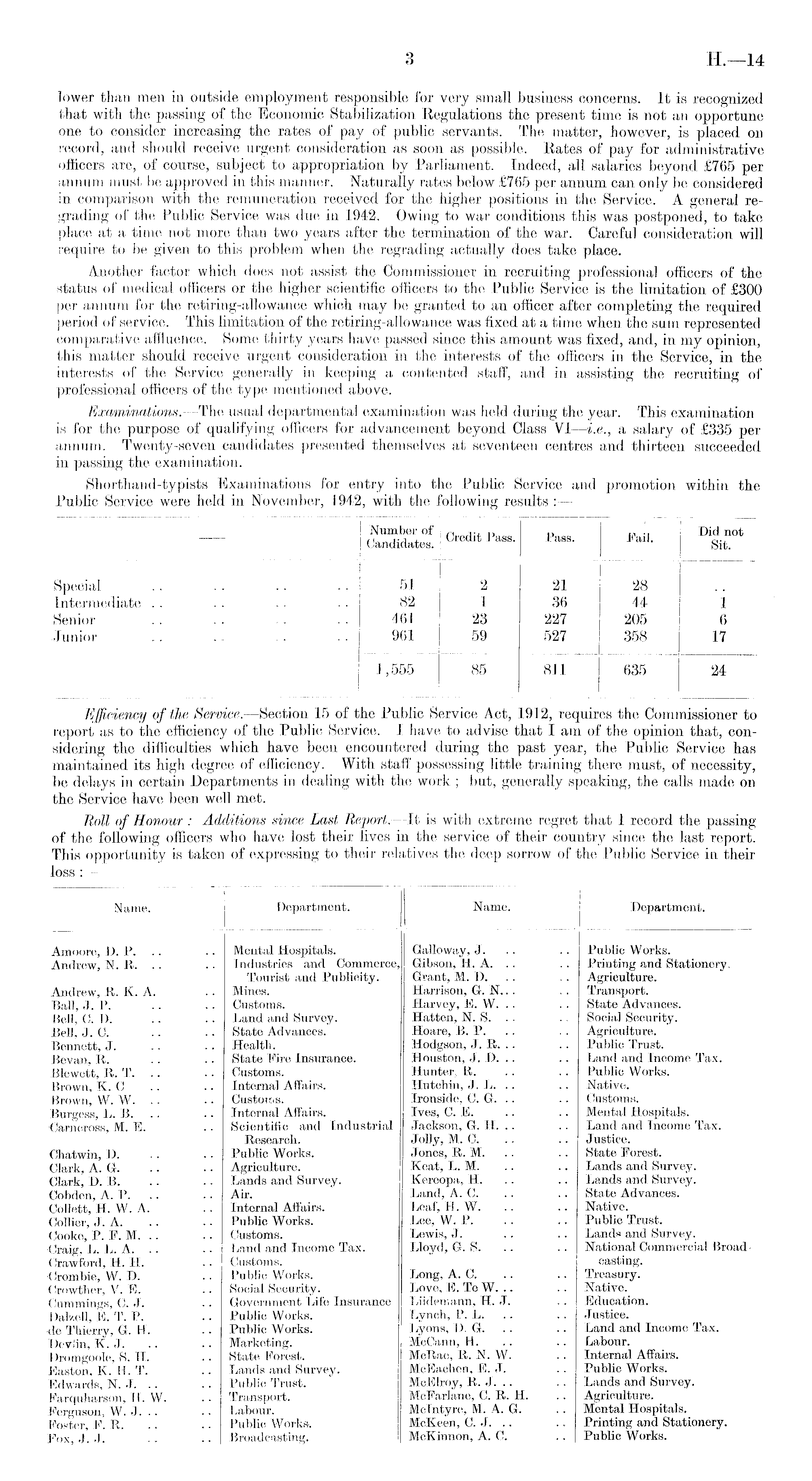 lower than men in outside employment responsible for very small business concerns. It is recognized that with the passing of the Economic Stabilization Regulations the present time is not an opportune one to consider increasing the rates of pay of public servants. The matter, however, is placed on record, and should receive urgent consideration as soon as possible. Rates of pay for administrative officers are, of course, subject to appropriation by Parliament. Indeed, all salaries beyond £765 per annum must be approved in this manner. Naturally rates below £765 per annum can only be considered in comparison with the remuneration received for the higher positions in the Service. A general regrading of the Public Service was due in 1942. Owing to war conditions this was postponed, to take place at a time not more than two years after the termination of the war. Careful consideration will require to be given to this problem when the regrading actually does take place. Another factor which does not assist the Commissioner in recruiting professional officers of the status of medical officers or the higher scientific officers to the Public Service is the limitation of £300 per annum for the retiring-allowance which may be granted to an officer after completing the required period of service. This limitation of the retiring-allowance was fixed at a time when the sum represented comparative affluence. Some thirty years have passed since this amount was fixed, and, in my opinion, this matter should receive urgent consideration in the interests of the officers in the Service, in the interests of the Service generally in keeping a contented staff, and in assisting the recruiting of professional officers of the type mentioned above. Examinations. —The usual departmental examination was held during the year. This examination is for the purpose of qualifying officers for advancement beyond Class VI —i.e., a salary of £335 per annum. Twenty-seven candidates presented themselves at seventeen centres and thirteen succeeded in passing the examination. Shorthand-typists Examinations for entry into the Public Service and promotion within the Public Service were held in November, 1942, with the following results : —