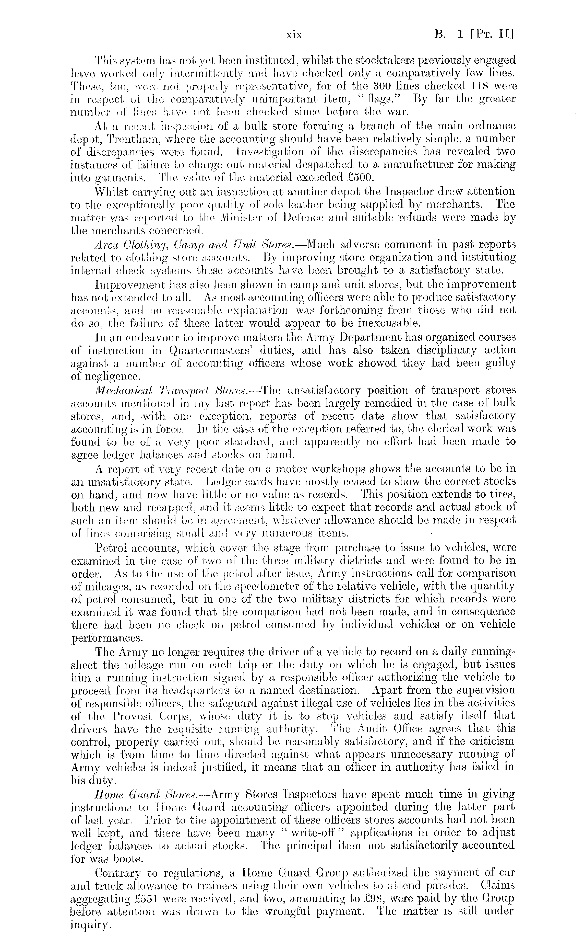 This system has not yet been instituted, whilst the stocktakers previously engaged have worked only intermittently and have cheeked only a comparatively few lines. These, too, were not properly representative, for of the 300 lines checked 118 were in respect of the comparatively unimportant item, " flags." By far the greater number of lines have not been checked since before the war. At a recent inspection of a bulk store forming a branch of the main ordnance depot, Trentham, where the accounting should have been relatively simple, a number of discrepancies were found. Investigation of the discrepancies has revealed two instances of failure to charge out material despatched to a manufacturer for making into garments. The value of the material exceeded £500. Whilst carrying out an inspection at another depot the Inspector drew attention to the exceptionally poor quality of sole leather being supplied by merchants. The matter was reported to the Minister of Defence and suitable refunds were made by the merchants concerned. Area Clothing, Camp and Unit Stores.—-Much adverse comment in past reports related to clothing store accounts. By improving store organization and instituting internal check systems these accounts have been brought to a satisfactory state. Improvement has also been shown in camp and unit stores, but the improvement has not extended to all. As most accounting officers were able to produce satisfactory accounts, and no reasonable explanation was forthcoming from those who did not do so, the failure of these latter would appear to be inexcusable. In an endeavour to improve matters the Army Department has organized courses of instruction in Quartermasters' duties, and has also taken disciplinary action against a number of accounting officers whose work showed they had been guilty of negligence. Mechanical Transport Stores.—-The unsatisfactory position of transport stores accounts mentioned in my last report has been largely remedied in the case of bulk stores, and, with one exception, reports of recent date show that satisfactory accounting is in force. In the case of the exception referred to, the clerical work was found to be of a very poor standard, and apparently no effort had been made to agree ledger balances and stocks on hand. A report of very recent date on a motor workshops shows the accounts to be in an unsatisfactory state. Ledger cards have mostly ceased to show the correct stocks on hand, and now have little or no value as records. This position extends to tires, both new and recapped, and it seems little to expect that records and actual stock of such an item should be in agreement, whatever allowance should be made in respect of lines comprising small, and very numerous items. Petrol accounts, which cover the stage from purchase to issue to vehicles, were examined in the case of two of the three military districts and were found to be in order. As to the use of the petrol after issue, Army instructions call for comparison of mileages, as recorded on the speedometer of the relative vehicle, with the quantity of petrol consumed, but in one of the two military districts for which records were examined it was found that the comparison had not been made, and in consequence there had been no check on petrol consumed by individual vehicles or on vehicle performances. The Army no longer requires the driver of a vehicle to record on a daily runningsheet the mileage run on each trip or the duty on which he is engaged, but issues him a running instruction signed by a responsible officer authorizing the vehicle to proceed from its headquarters to a named destination. Apart from the supervision of responsible officers, the safeguard against illegal use of vehicles lies in the activities of the Provost Corps, whose duty it is to stop vehicles and satisfy itself that drivers have the requisite running authority. The Audit Office agrees that this control, properly carried out, should be reasonably satisfactory, and if the criticism which is from time to time directed against what appears unnecessary running of Army vehicles is indeed justified, it means that an officer in authority has failed in his duty. Home Guard Stores.—Army Stores Inspectors have spent much time in giving instructions to Home Guard accounting officers appointed during the latter part of last year. Prior to the appointment of these officers stores accounts had not been well kept, and there have been many "write-off" applications in order to adjust ledger balances to actual stocks. The principal item not satisfactorily accounted for was boots. Contrary to regulations, a Home Guard Group authorized the payment of car and truck allowance to trainees using their own vehicles to attend parades. Claims aggregating £551 were received, and two, amounting to £98, were paid by the Group before attention was drawn to the wrongful payment. The matter is still under inquiry.
