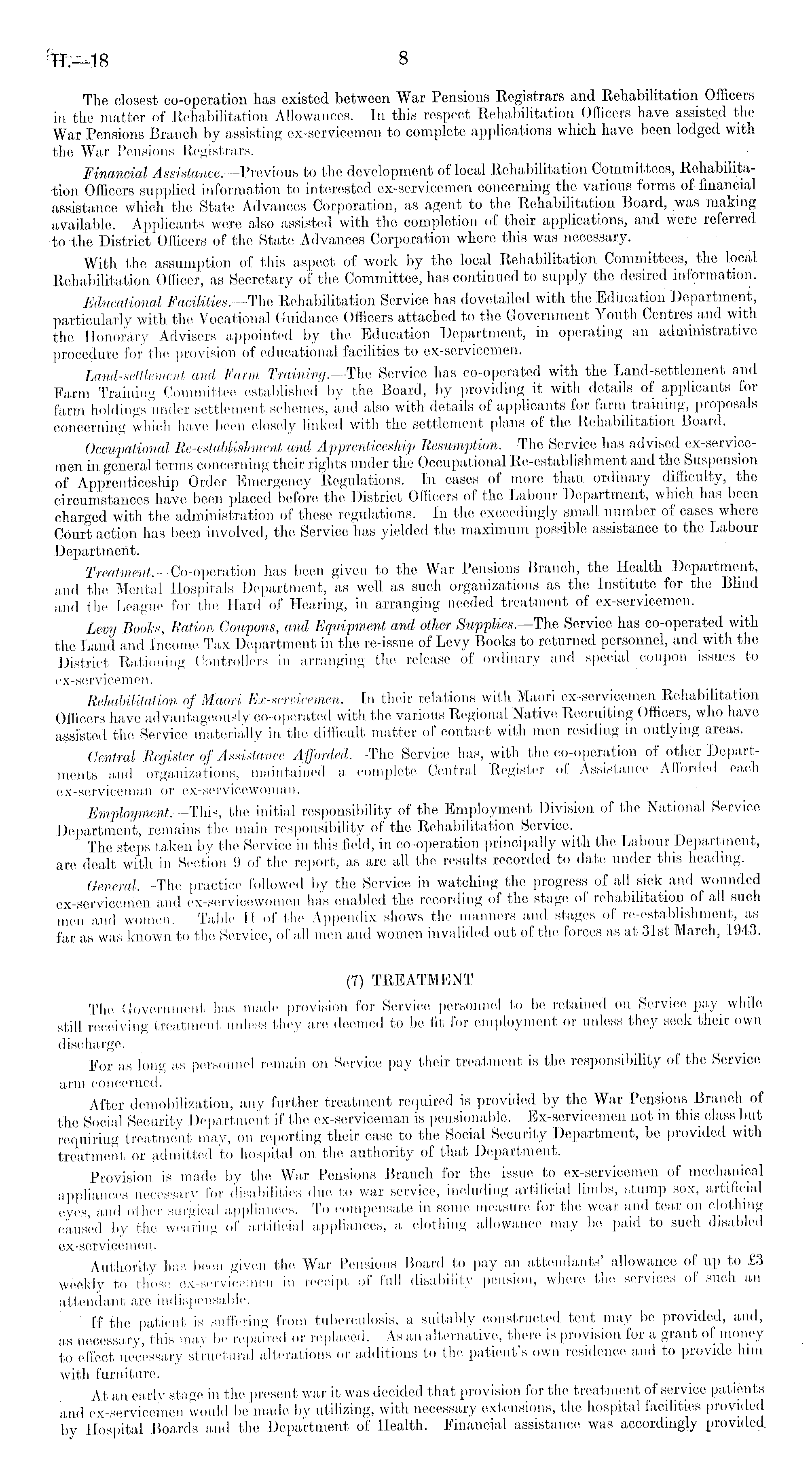 The closest co-operation has existed between War Pensions Registrars and Rehabilitation Officers in the matter of Rehabilitation Allowances. In this respect Rehabilitation Officers have assisted the War Pensions Branch by assisting ex-servicemen to complete applications which have been lodged with the War Pensions Registrars. Financial Assistance. —Previous to the development of local Rehabilitation Committees, Rehabilitation Officers supplied information to interested ex-servicemen concerning the various forms of financial assistance which the State Advances Corporation, as agent to the Rehabilitation Board, was making available. Applicants were also assisted with the completion of their applications, and were referred to the District Officers of the State Advances Corporation where this was necessary. With the assumption of this aspect of work by the local Rehabilitation Committees, the local Rehabilitation Officer, as Secretary of the Committee, has continued to supply the desired information. Educational Facilities. —The Rehabilitation Service has dovetailed with the Education Department, particularly with the Vocational Guidance Officers attached to the Government Youth Centres and with the Honorary Advisers appointed by the Education Dejjartment, in operating an administrative procedure for the provision of educational facilities to ex-servicemen. Land-settlement and Farm Training.—The Service has co-operated with the Land-settlement and Farm Training Committee established'by the Board, by providing it with details of applicants for farm holdings under settlement schemes, and also with details of applicants for farm training, proposals concerning which have been closely linked with the settlement plans of the Rehabilitation Board. Occupational Re-establiahment and Apprenticeship Resumption, -The Service has advised ex-service-men in general terms concerning their rights under the Occupational Re-establishment and the Suspension of Apprenticeship Order Emergency Regulations. In cases of more than ordinary difficulty, the circumstances have been placed before the District Officers of the Labour Department, which has been charged with the administration of these regulations. In the exceedingly small number of cases where Court action has been involved, the Service has yielded the maximum possible assistance to the Labour Department. Treatment. —Co-operation has been given to the War Pensions Branch, the Health Department, and the Mental Hospitals Department, as well as such organizations as the Institute for the Blind and the League for the Hard of Hearing, in arranging needed treatment of ex-servicemen. Levy Books, Ration Coupons, and Equipment and other Supplies. —The Service has co-operated with the Land and Income Tax Department in the re-issue of Levy Books to returned personnel, and with the District Rationing Controllers in arranging the release of ordinary and special coupon issues to ex-servicemen. Rehabilitation of Maori Ex-servicemen.—ln their with Maori ex-servicemen Rehabilitation Officers have advantageously co-operated with the various Regional Native Recruiting Officers, who have assisted the Service materially in the difficult matter of contact with men residing in outlying areas. Central Register of Assistance Afforded.— The Service has, with the co-operation of other Departments and organizations, maintained a complete Central Register of Assistance Afforded each ex-serviceman or ex-servicewoman. Employment.—This, the initial responsibility of the Employment Division of the National Service Department, remains the main responsibility of the Rehabilitation Service. The steps taken by the Service in this field, in co-operation principally with the Labour Department, are dealt with in Section 9 of the report, as are all the results recorded to date under this heading. General.—The practice followed by the Service in watching the progress of all sick and wounded ex-servicemen and ex-servicewomen has enabled the recording of the stage of rehabilitation of all such men and women. Table 11 of the Appendix shows the manners and stages of re-establishment, as far as was known to the Service, of all men and women invalided out of the forces as at 31st March, 1943. (7) TREATMENT The Government has made provision for Service personnel to be retained on Service pay while still receiving treatment unless they arc deemed to be fit for employment or unless they seek their own discharge. For as long as personnel remain on Service pay their treatment is the responsibility of the Service arm concerned. After demobilization, any further treatment required is provided by the War Pensions Branch of the Social Security Department if the ex-serviceman is pensionable. Ex-servicemen not in this class but requiring treatment may, on reporting their case to the Social Security Department, be provided with treatment or admitted to hospital on the authority of that Department. Provision is made by the War Pensions Branch for the issue to ex-servicemen of mechanical appliances necessary for disabilities due to war service, including artificial limbs, stump sox, artificial eyes, and other surgioal appliances. To compensate in some measure for the wear and. tear on clothing caused by the wearing of artificial appliances, a clothing allowance may be paid to such disabled ex-servicemen. Authority has been given the War Pensions Board to pay an attendants allowance of up to .£3 weekly to those ex-servicemen in receipt of full disability pension, where the services of such an attendant are indispensable. If the patient is suffering from tuberculosis, a suitably constructed tent may be provided, and, as necessary, this may be repaired or replaced. As an alternative, there is provision for a grant of money to effect necessary structural alterations or additions to the patient's own residence and to provide him with furniture. At an early stage in the present war it was decided that pro