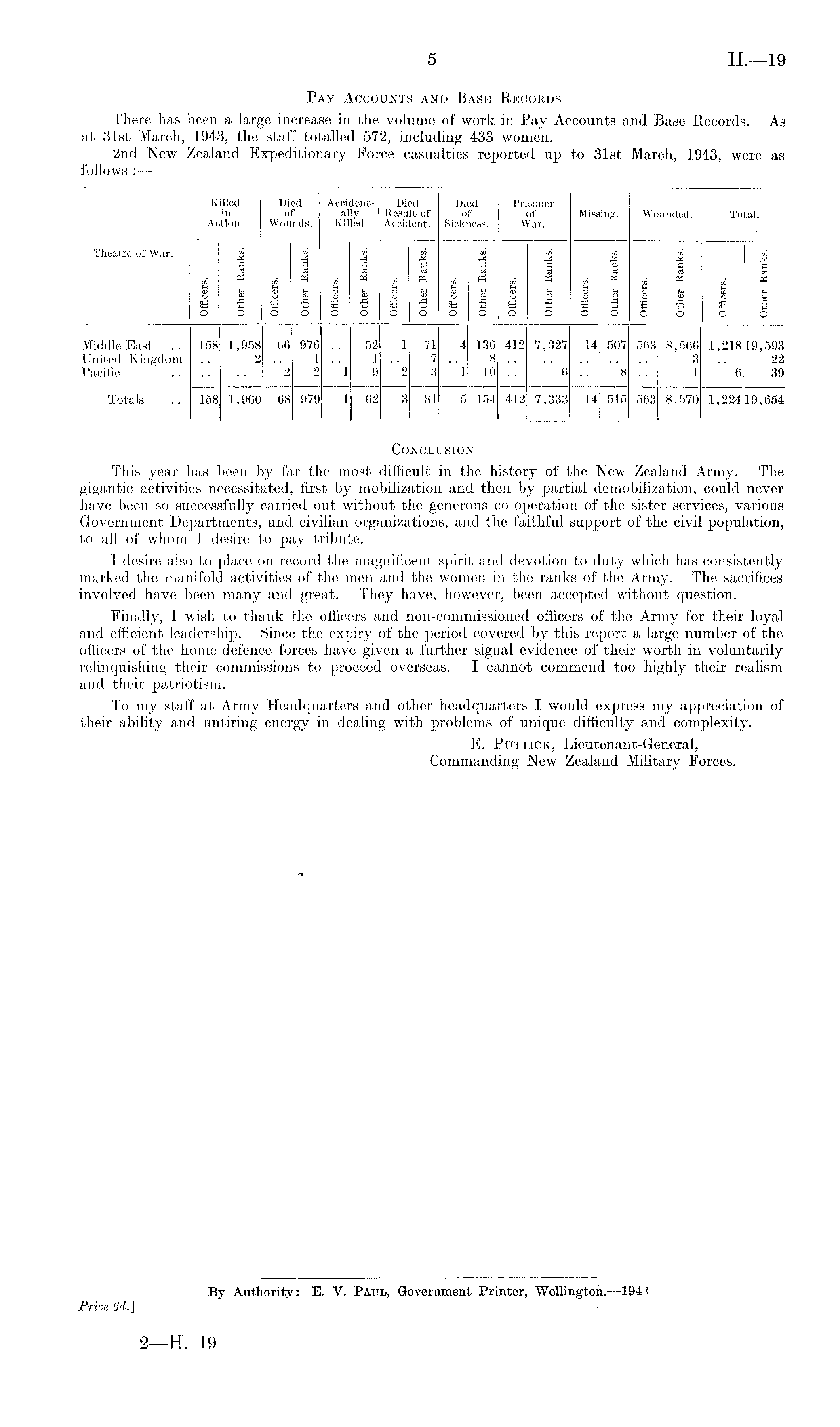 Conclusion This year has been by far the most difficult in the history of the New Zealand Army. The gigantic activities necessitated, first by mobilization and then by partial demobilization, could never have been so successfully carried out without the generous co-operation of the sister services, various Government Departments, and civilian organizations, and the faithful support of the civil population, to all of whom I desire to pay tribute. I desire also to place on record the magnificent spirit and devotion to duty which has consistently marked the manifold activities of the men and the women in the ranks of the Army. The sacrifices involved have been many and great. They have, however, been accepted without question. Finally, 1 wish to thank the officers and non-commissioned officers of the Army for their loyal and efficient leadership. Since the expiry of the period covered by this report a large number of the officers of the home-defence forces have given a further signal evidence of their worth in voluntarily relinquishing their commissions to proceed overseas. I cannot commend too highly their realism and their patriotism. To my staff at Army Headquarters and other headquarters I would express my appreciation of their ability and untiring energy in dealing with problems of unique difficulty and complexity. E. Puttick, Lieutenant-General, Commanding New Zealand Military Forces.