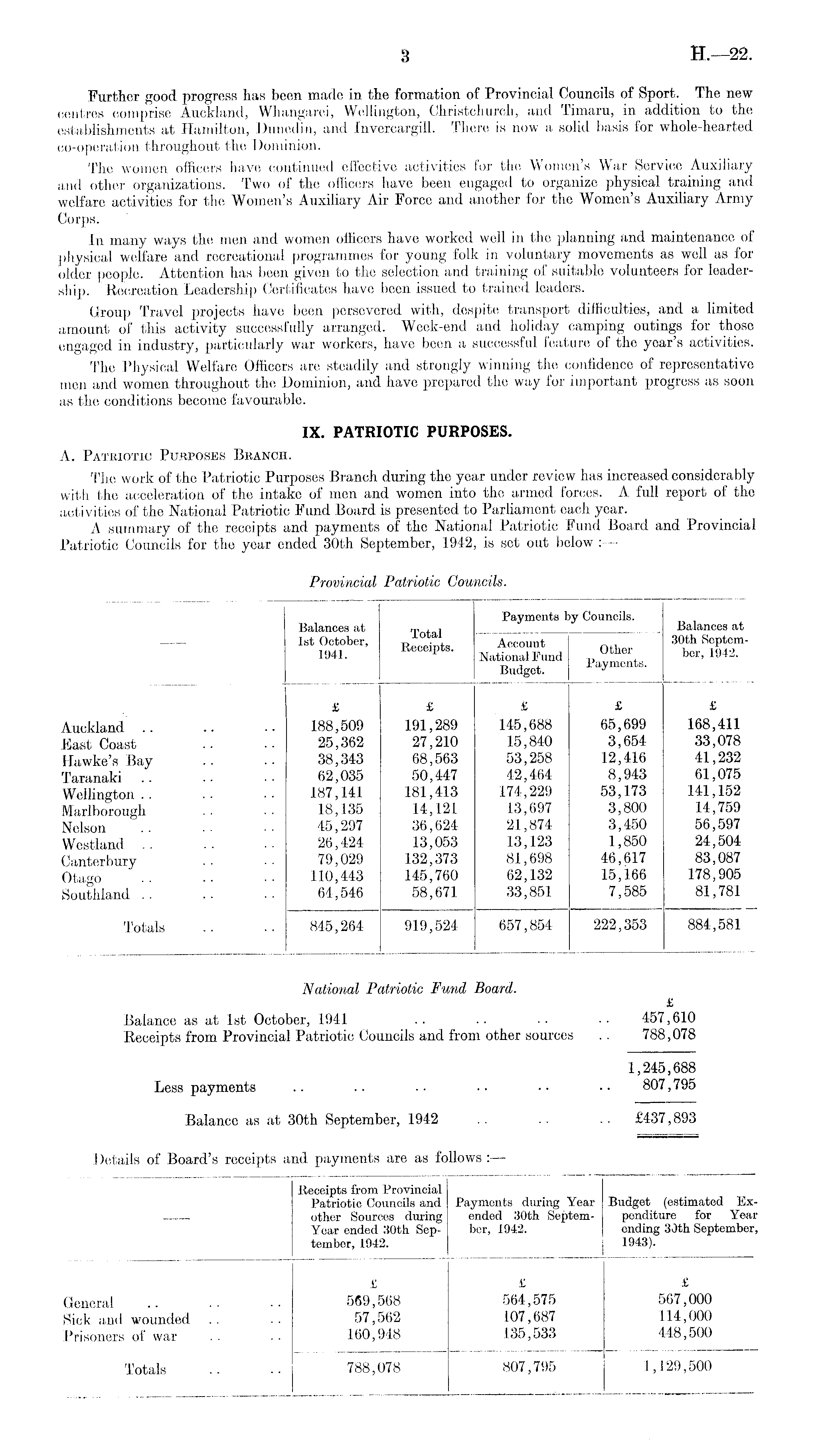 Further good progress has been made in the formation of Provincial Councils of Sport. The new centres comprise Auckland, Whangarei, Wellington, Christchurch, and Timaru, in addition to the establishments at Hamilton, Dunedin, and Invercargill. There is now a solid basis for whole-hearted co-operation throughout the Dominion. The women officers have continued effective activities for the Women's War Service Auxiliary and other organizations. Two of the officers have been engaged to organize physical training and welfare activities for the Women's Auxiliary Air Force and another for the Women's Auxiliary Army Corps. In many ways the men and women officers have worked well in the planning and maintenance of physical welfare and recreational programmes for young folk in voluntary movements as well as for older people. Attention has been given to the selection and training of suitable volunteers for leadership. Recreation Leadership Certificates have been issued to trained leaders. Group Travel projects have been persevered with, despite transport difficulties, and a limited amount of this activity successfully arranged. Week-end and holiday camping outings for those engaged in industry, particularly war workers, have been a successful feature of the year's activities. The Physical Welfare Officers are steadily and strongly winning the confidence of representative men and women throughout the Dominion, and have prepared the way for important progress as soon as the conditions become favourable. IX. PATRIOTIC PURPOSES. A. Patriotic Purposes Branch. The work of the Patriotic Purposes Branch during the year under review has increased considerably with the acceleration of the intake of men and women into the armed forces. A full report of the activities of the National Patriotic Fund Board is presented to Parliament each year. A summary of the receipts and payments of the National Patriotic Fund Board and Provincial Patriotic Councils for the year ended 30th September, 1942, is set out below : —