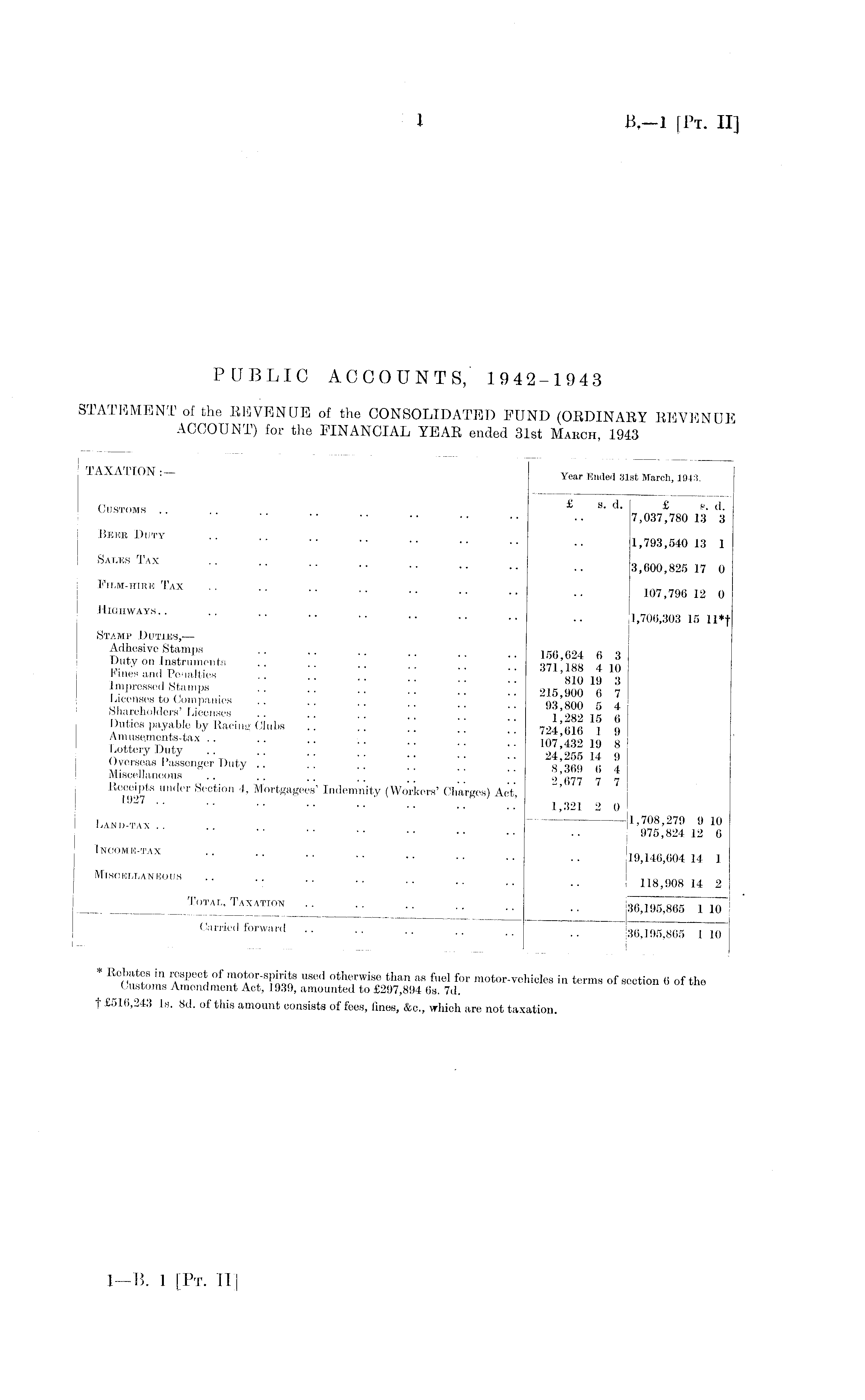 TAXATION Year Ended Slst March( lfl43 Customs .... £ s. d. £ s>. d. 7,037,780 13 3 BEERDCTY .. 1,793,540 13 1 SAMSTAX •• 3,600,825 17 0 Film-hire Tax 107u 0 Highways .. .. 1,706,303 15 U*t Stamp Dutibs, — Adhesive Stamps .. .. 1KR „ „ Duty on Instruments .. .. ' Q7i'i«s a in Fines and Penalties " ;; ;; *g?o 19 -j Impressed Stamps .. .. ,, t _ [ " g,- „ _ Licenses to Companies .. .. _ . Shareholders'Licenses .. .. .' n„o it Duties payable by Racing Clubs .. .. _ " 724'fiifi 1 a Amusepients-tax .. .. .. .. " " " 1(1 a Lottery Duty 19 8 Overseas Passenger Duty .. 0 ' 0cr , (t . Miscellaneous .. .. .. " ;; " b * Receipts under Section 4, Mortgagees' Indemnity (Workers' Charges) Act, ' 1927 .' 1,321 2 0 Land-tax.. .. . 9 10 975,824 12 6 T ™- TAX 19,146,004 14 1 Miscellaneous .. .. 118,908 14 2 Total ' Ta xation „ - .. .. .. .. 36,195,865 1 10 Carried forward 7 7 36,195,805 1 10 * R Tr\ 0f TA° r ; S ?non S USed othe , rwise tha " as f™l for motor-vehicles in terms of section 6 of the Customs Amendment Act, 1939, amounted to £297,894 6s. 7d. t £516,243 Is. 8d, of this amount consists of fees, fines, &o., which are not taxation.