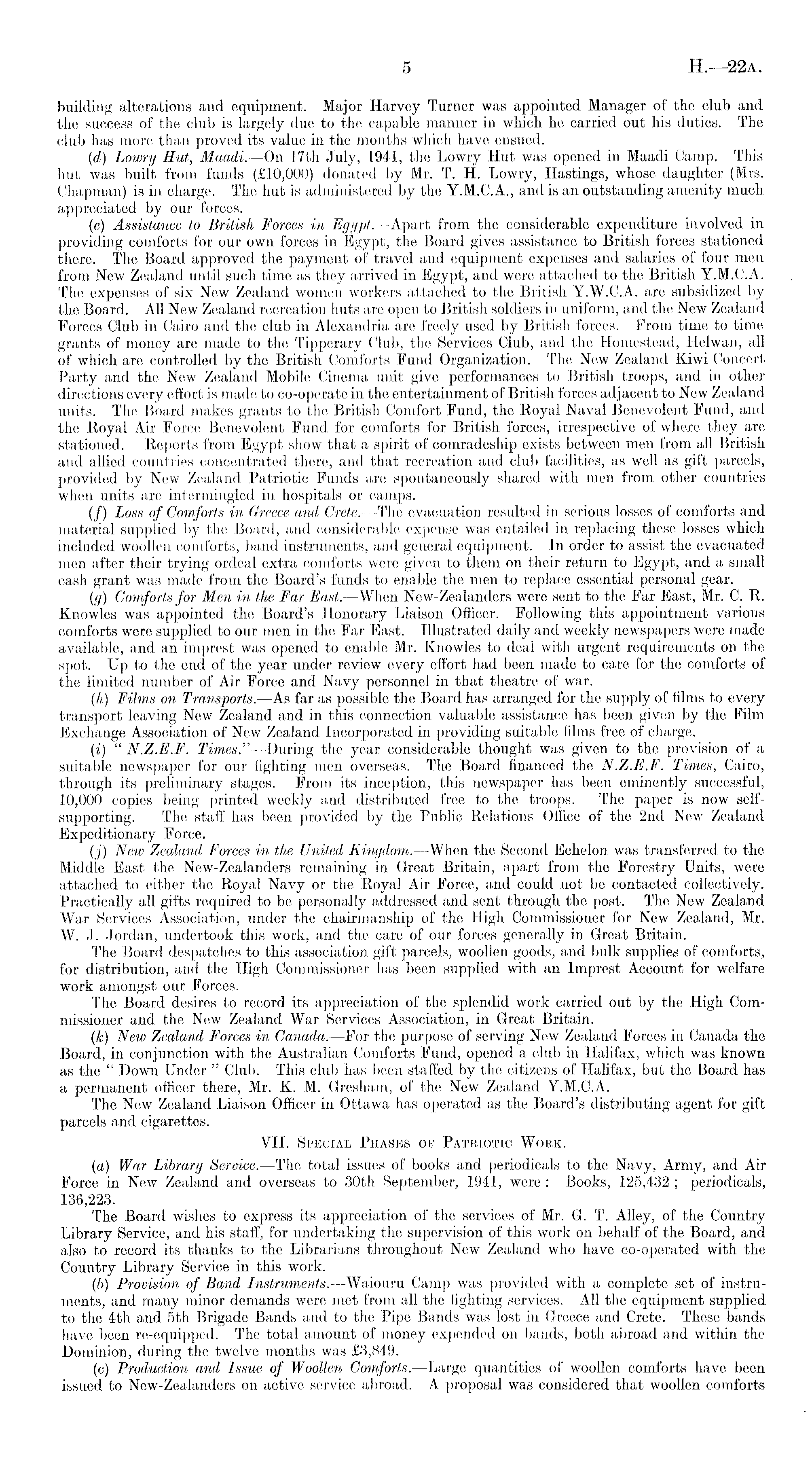 building alterations and equipment. Major Harvey Turner was appointed Manager of the club and the success of the club is largely due to the capable manner in which he carried out his duties. The club has more than proved its value in the months which have ensued. (d) Lowry Hut, Maadi.—On I.7th July, 1941, the Lowry Hut was opened in Maadi Camp. This hut was built from funds (£10,000) donated by Mr. T. H. Lowry, Hastings, whose daughter (Mrs. Chapman) is in charge. The hut is administered by the Y.M.C.A., and is an outstanding amenity much appreciated by our forces. (e) Assistance to British Forces in Egypt. —Apart from the considerable expenditure involved in providing comforts for our own forces in Egypt, the Board gives assistance to British forces stationed there. The Board approved the payment of travel and equipment expenses and salaries of four men from New Zealand until such time as they arrived in Egypt, and were attached to the British Y.M.C.A. The expenses of six New Zealand women workers attached to the British Y.W.C.A. are subsidized by the Board. All New Zealand recreation huts are open to British soldiers in uniform, and the New Zealand Forces Club in Cairo and the club in Alexandria arc freely used by British forces. From time to time grants of money are made to the Tippcrary Club, the Services Club, and the Homestead, lielwan, all of which are controlled by the British Comforts Fund Organization. The New Zealand Kiwi Concert Party and the New Zealand Mobile Cinema unit give performances to British troops, and in other directions every effort is made to co-operate in the entertainment of British forces adjacent to New Zealand units. The Board makes grants to the British Comfort Fund, the Royal Naval Benevolent Fund, and the Boyal Air Force Benevolent Fund for comforts for British forces, irrespective of where they are stationed. Reports from Egypt show that a spirit of comradeship exists between men from all British and allied countries concentrated there, and that recreation and club facilities, as well as gift parcels, provided by New Zealand Patriotic Funds are spontaneously shared with men from other countries when units are intermingled in hospitals or camps. (/) Loss of Comforts in Greece and Crete.—The evacuation resulted in serious losses of comforts and material supplied by the Board, and considerable expense was entailed in replacing these losses which included woollen comforts, band instruments, and general equipment. In order to assist the evacuated men after their trying ordeal extra comforts were given to them on their return to Egypt, and a small cash grant was made from the Board's funds to enable the men to replace essential personal gear. (g) Comforts for Men in the Far East. —When New-Zealanders were sent to the Far East, Mr. C. R. Knowles was appointed the Board's Honorary Liaison Officer. Following this appointment various comforts were supplied to our men in the Far East. Illustrated daily and weekly newspapers were made available, and an imprest was opened to enable Mr. Knowles to deal with urgent requirements on the spot. Up to the end of the year under review every effort had been made to care for the comforts of the limited number of Air Force and Navy personnel in that theatre of war. (h) Films on Transports.—As far as possible the Board has arranged for the supply of films to every transport leaving New Zealand and in this connection valuable assistance has been given by the Film Exchange Association of New Zealand Incorporated in providing suitable films free of charge. (i) " N.Z.E.F. Times."—During the year considerable thought was given to the provision of a suitable newspaper for our fighting men overseas. The Board financed the N.Z.E.F. Times, Cairo, through its preliminary stages. From its inception, this newspaper has been eminently successful, 10,000 copies being printed weekly and distributed free to the troops. The paper is now selfsupporting. The staff has been provided by the Public Relations Office of the 2nd New Zealand Expeditionary Force. (j) New Zealand Forces in the United Kingdom. —When the Second Echelon was transferred to the Middle East the New-Zealanders remaining in Great Britain, apart from the Forestry Units, were attached to either the Royal Navy or the Royal Air Force, and could not be contacted collectively. Practically all gifts required to be personally addressed and sent through the post. The New Zealand War Services Association, under the chairmanship of the High Commissioner for New Zealand, Mr. W. J. Jordan, undertook this work, and the care of our forces generally in Great Britain. The Board despatches to this association gift parcels, woollen goods, and bulk supplies of comforts, for distribution, and the High Commissioner has been supplied with an Imprest Account for welfare work amongst our Forces. The Board desires to record its appreciation of the splendid work carried out by the High Commissioner and the New Zealand War Services Association, in Great Britain. (k) New Zealand Forces in Canada.—For the purpose of serving New Zealand Forces in Canada the Board, in conjunction with the Australian Comforts Fund, opened a club in Halifax, which was known as the " Down Under " Club. This club has been staffed by the citizens of Halifax, but the Board has a permanent officer there, Mr. K. M. Gresham, of the New Zealand Y.M.C.A. The New Zealand Liaison Officer in Ottawa has operated as the Board's distributing agent for gift parcels and cigarettes. VII. Special Phases of Patriotic Wobk. (a) War Library Service.—The total issues of books and periodicals to the Navy, Army, and Air Force in New Zealand and overseas to 30th September, 1941, were : Books, 125,432 ; periodicals, 136,223. The Board wishes to express its appreciation of the services of Mr. G. T. Alley, of the Country Library Service, and his staff, for undertaking the supervision of this work on behalf of the Board, and also to record 
