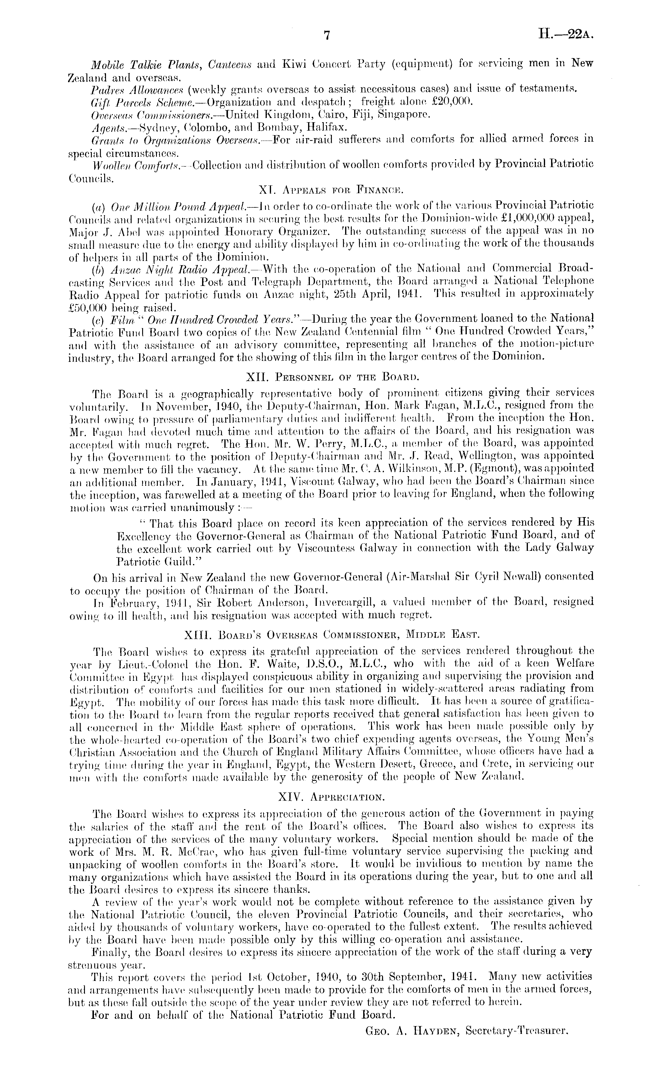 Mobile Talkie Plants, Canteens and Kiwi Concert Party (equipment) for servicing men in New Zealand and overseas. Padres Allowances (weekly grants overseas to assist necessitous cases) and issue of testaments. Gift Parcels Scheme. —Organization and despatch; freight alone £20,000. Overseas Commissioners. —United Kingdom, Cairo, Fiji, Singapore. Agents. —Sydney, Colombo, and Bombay, Halifax. Grants to Organizations Overseas. —For air-raid sufferers and comforts for allied armed forces in special circumstances. Woollen Comforts. —Collection and distribution of woollen comforts provided by Provincial Patriotic Councils. XI. Appeals fob Finance. (a) One Million Pound Appeal. —In order to co-ordinate the work of the various Provincial Patriotic Councils and related organizations in securing the best results for the Dominion-wide £1,000,000 appeal, Major J. Abel was appointed Honorary Organizer. The outstanding success of the appeal was in no small measure due to the energy and ability displayed by him in co-ordinating the work of the thousands of helpers in all parts of the Dominion. (b) Anzac Night Radio Appeal. —With the co-operation of the National and Commercial Broadcasting Services and the Post and Telegraph Department, the Board arranged a National Telephone Radio Appeal for patriotic funds on Anzac night, 25th April, 1941. This resulted in approximately £50,000 being raised. (c) Film " One Hundred Crowded Years." —During the year the Government loaned to the National Patriotic Fund Board two copies of the New Zealand Centennial film " One Hundred Crowded Years," and with the assistance of an advisory committee, representing all branches of the motion-picture industry, the Board arranged for the showing of this film in the larger centres of the Dominion. XII. Personnel op the Board. The Board is a geographically representative body of prominent citizens giving their services voluntarily. In November, 1940, the Deputy-Chairman, Hon. Mark Fagan, M.L.C., resigned from the Board owing to pressure of parliamentary duties and indifferent health. From the inception the Hon. Mr. Fagan had devoted much time and attention to the affairs of the Board, and his resignation was accepted with much regret. The Hon. Mr. W. Perry, M.L.C., a member of the Board, was appointed by the Government to the position of Deputy-Chairman and Mr. J. Bead, Wellington, was appointed a new member to fill the vacancy. At the same time Mr. C. A. Wilkinson, M.P. (Egmont), was appointed an additional member. In January, 1941, Viscount Galway, who had been the Board's Chairman since the inception, was farewelled at a meeting of the Board prior to leaving for England, when the following motion was carried unanimously : — " That this Board place on record its keen appreciation of the services rendered by His Excellency the Governor-General as Chairman of the National Patriotic Fund Board, and of the excellent work carried out by Viscountess Galway in connection with the Lady Galway Patriotic Guild." On his arrival in New Zealand the new Governor-General (Air-Marshal Sir Cyril Newall) consented to occupy the position of Chairman of the Board. In February, 1941, Sir Robert Anderson, Invercargill, a valued member of the Board, resigned owing to ill health, and his resignation was accepted with much regret. XIIL Board's Overseas Commissioner, Middle East. The Board wishes to express its grateful appreciation of the services rendered throughout the year by Lieut.-Colonel the Hon. F. Waite, D.5.0., M.L.C., who with the aid of a keen Welfare Committee in Egypt has displayed conspicuous ability in organizing and supervising the provision and distribution of comforts and facilities for our men stationed in widely-scattered areas radiating from Egypt. The mobility of our forces has made this task more difficult. It has been a source of gratification to the Board to learn from the regular reports received that general satisfaction has been given to all concerned in the Middle East sphere of operations. This work has been made possible only by the whole-hearted co-operation of the Board's two chief expending agents overseas, the Young Men's Christian Association and the Church of England Military Affairs Committee, whose officers have had a trying time during the year in England, Egypt, the Western Desert, Greece, and Crete, in servicing our men with the comforts made available by the generosity of the people of New Zealand. XIV. Appreciation. The Board wishes to express its appreciation of the generous action of the Government in paying the salaries of the staff and the rent of the Board's offices. The Board also wishes to express its appreciation of the services of the many voluntary workers. Special mention should be made of the work of Mrs. M. R. McCrae, who has given full-time voluntary service supervising the packing and unpacking of woollen comforts in the Board's store. It would be invidious to mention by name the many organizations which have assisted the Board in its operations during the year, but to one and all the Board desires to express its sincere thanks. A review of the year's work would not be complete without reference to the assistance given by the National Patriotic Council, the eleven Provincial Patriotic Councils, and their secretaries, who aided by thousands of voluntary workers, have co-operated to the fullest extent. The results achieved by the Board have been made possible only by this willing co-operation and assistance. Finally, the Board desires to express its sincere appreciation of the work of the staff during a very strenuous year. This report covers the period Ist October, 1940, to 30th September, 1941. Many new activities and arrangements have subsequently been made to provide for the comforts of men in the armed forces, but as these fall outside the scope of the year under review they are not referred to herein. For and on behalf of the National Patriotic Fund Board. Geo. A. Hayden