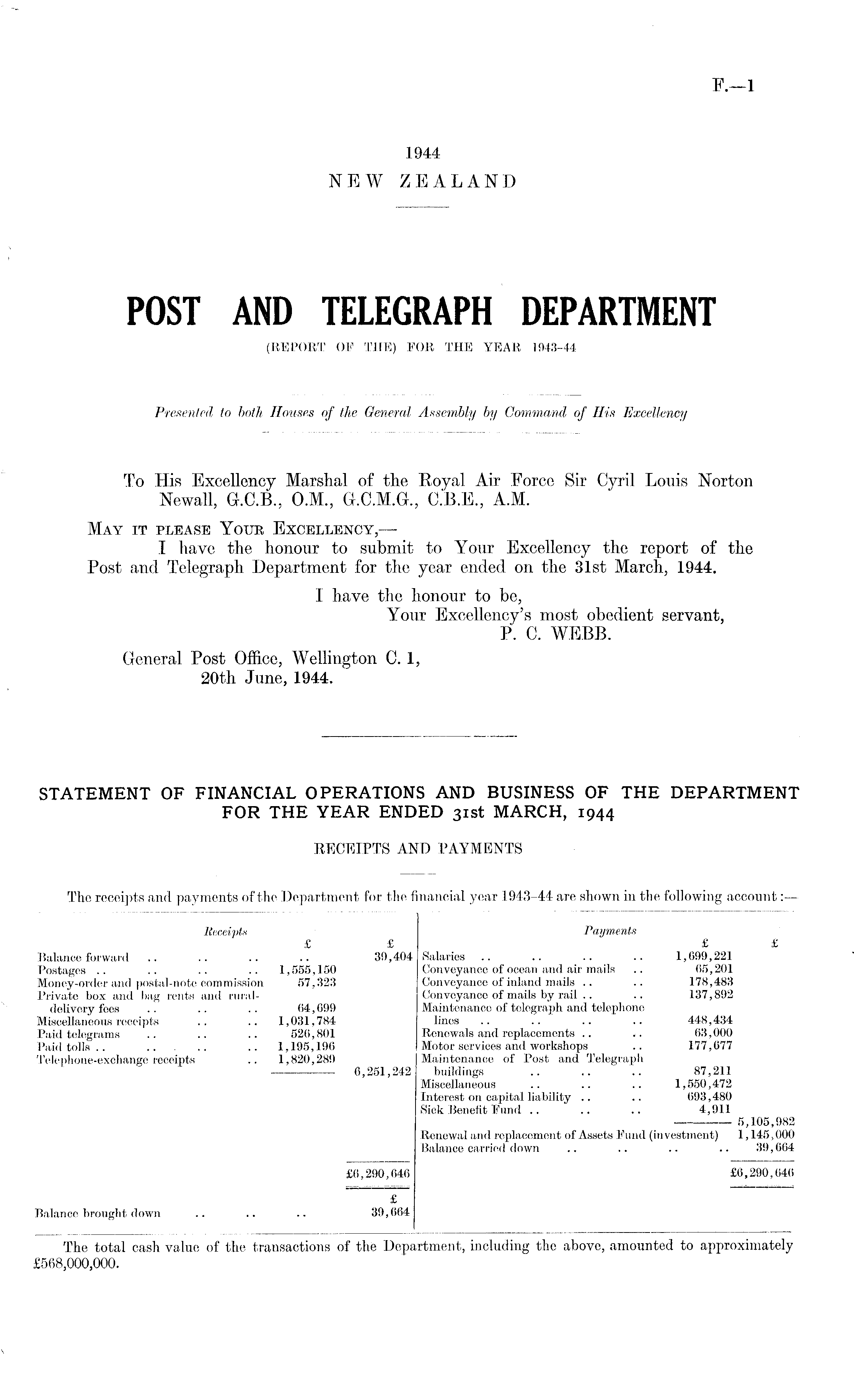 To His Excellency Marshal of the Royal Air Force Sir Cyril Louis Norton Newall, G.C.8., 0.M., G.C.M.G., C.8.E., A.M. May it please Your Excellency,— I have the honour to submit to Your Excellency the report of the Post and Telegraph Department for the year ended on the 31st March, 1944. I have the honour to be, Your Excellency's most obedient servant, P. C. WEBB. General Post Office, Wellington C. 1, 20th June, 1944.