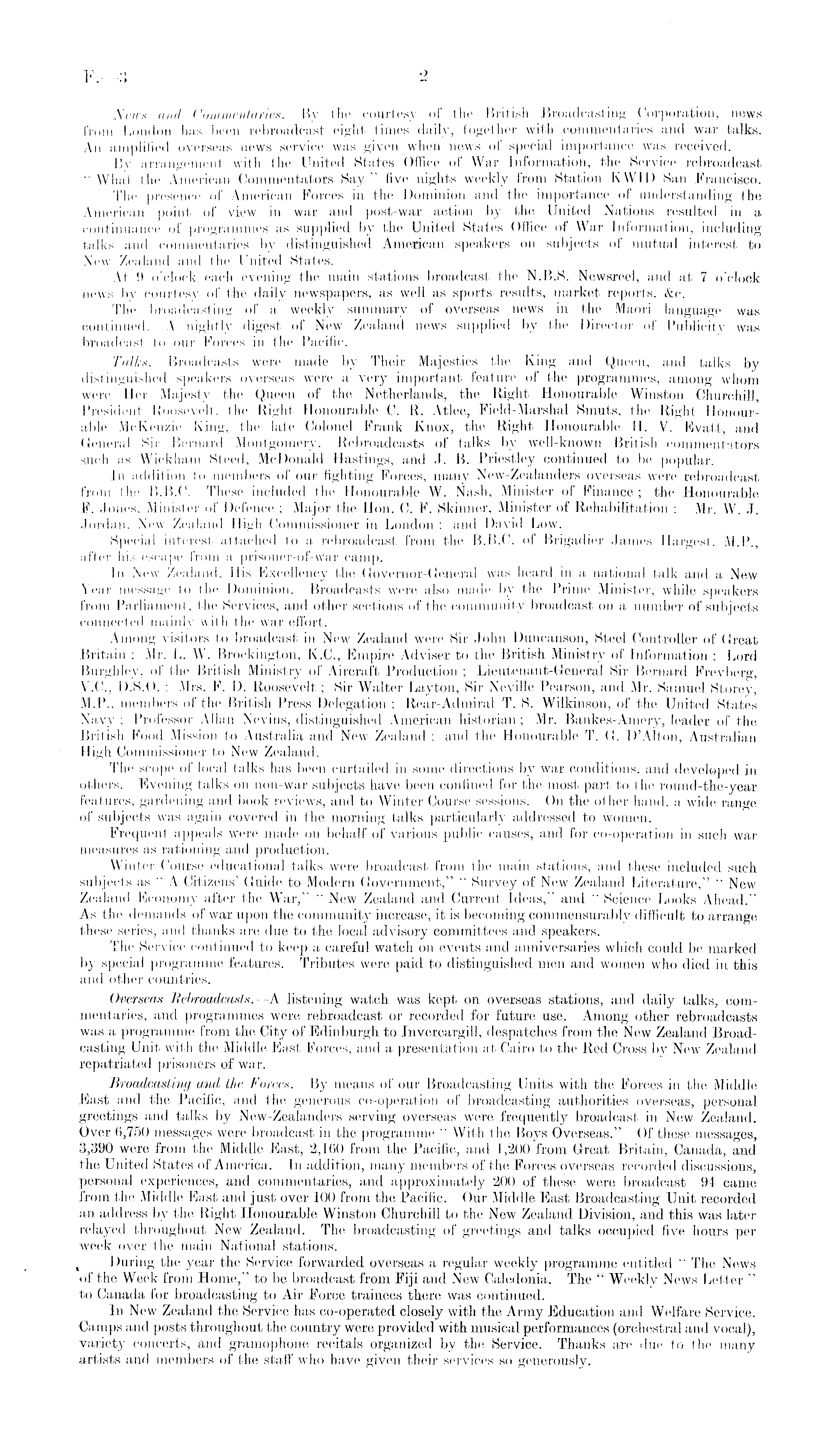 News and Commentaries. —By the courtesy of the British Broadcasting Corporation, news from Londpn has been rebroadcast eight times daily, together with commentaries and war talks. An amplified overseas news service was given when news of special importance was received. By arrangement with the United States Office of War Information, the Service rebroadcast " What the American Commentators Say " five nights weekly from Station KWII) San Francisco. The presence of American Forces in the Dominion and the importance of understanding the American point of view in war and post-war action by the United Nations resulted in a •continuance of programmes as supplied by the United States Office of War Information, including talks and commentaries by distinguished American speakers on subjects of mutual interest to New Zealand and the United States. At 9 o'clock each evening the main stations broadcast the N.B.S. Newsreel, and at 7 o'clock news by courtesy of the daily newspapers, as well as sports results, market reports, &c. The broadcasting of a weekly summary of overseas news in the Maori language was continued. A nightly digest of New Zealand news supplied by the Director of Publicity was broadcast to our Forces in the Pacific. Talks. —Broadcasts were made by Their Majesties the King and Queen, and talks by distinguished speakers overseas were a very important feature of the programmes, among whom were Her Majesty the Queen of the, Netherlands, the Right Honourable Winston Churchill, President Roosevelt, the Right Honourable C. R. Atlee, Field-Marshal Smuts, the Right Honourable McKenzie King, the late Colonel Frank Knox, the Right Honourable H. V. Evatt, and General Sir Bernard Montgomery. Rebroadcasts of talks by well-known British commentators such as Wickham Steed, McDonald Hastings, and J. B. Priestley continued to be popular. In addition to members of our fighting Forces, many New-Zealanders, overseas were rebroadcast from the 8.8.C. These included the Honourable W. Nash, Minister of Finance; the Honourable F. Jones, Minister of Defence ; Major the Hon. C. F. Skinner, Minister of Rehabilitation ; Mr. W. J. Jordan, New Zealand High Commissioner in London ; and David Low. Special interest attached to a rebroadcast from the 8.8.C. of Brigadier James Hargest, MP., after his escape from a prisoner-of-war camp. In New Zealand, His Excellency the Governor-General was heard in a national talk and a New Year message to the Dominion. Broadcasts were also made by the Prime Minister, while speakers from Parliament, the Services, and other sections of the community broadcast on a number of subjects ■connected mainly with the war effort. Among visitors to broadcast in New Zealand were Sir John Duncanson, Steel Controller of Great Britain ; Mr. L. W. Brockington, K.C., Empire Adviser to the British Ministry of Information ; Lord Burghley, of the British Ministry of Aircraft Production ; Lieutenant-General Sir Bernard Freyberg, Y.C., D.S.O. ; Mrs. F. D. Roosevelt; Sir Walter Layton, Sir Neville Pearson, and Mr. Samuel Storey, M.P., members of the British Press Delegation ; Rear-Admiral T. S. Wilkinson, of the United States Navy ; Professor Allan Nevins, distinguished American historian; Mr. Bankes-Amery, leader of the British Food Mission to Australia and New Zealand ; and the Honourable T. G. D'Alton, Australian High Commissioner to New Zealand. The scope of local talks has been curtailed in some directions by war conditions, and developed in others. Evening talks on non-war subjects have been confined for the most part to the round-the-year features, gardening and book reviews, and to Winter Course sessions. On the other hand, a wide range of subjects was again covered in the morning talks particularly addressed to women. Frequent appeals were made on behalf of various public causes, and for co-operation in such war measures as rationing and production. Winter Course educational talks were broadcast from the main stations, and these included such subjects as " A Citizens' Guide to Modern Government," " Survey of New Zealand Literature," " New Zealand Economy after the War," " New Zealand and Current Ideas," and " Science Looks Ahead." As the demands of war upon the community increase, it is becoming commensurably difficult to arrange these series, and thanks are due to the local advisory committees and speakers. The Service continued to keep a careful watch on events and anniversaries which could be marked by special programme features. Tributes were paid to distinguished men and women who died in this and other countries. Overseas Rebroadcasts.—A listening watch was kept on overseas stations, and daily talks, commentaries, and programmes were rebroadcast or recorded for future use. Among other rebroadcasts was a programme from the City of Edinburgh to Invercargill, despatches from the New Zealand Broadcasting Unit with the Middle East Forces, and a presentation at Cairo to the Red Cross by New Zealand repatriated prisoners of war. Broadcasting and the Forces.- By means of our Broadcasting Units with the Forces in the Middle East and the Pacific, and the generous co-operation of broadcasting authorities overseas, personal greetings and talks by New-Zealanders serving overseas were frequently broadcast in New Zealand. Over 6,750 messages were broadcast in the programme " With the Boys Overseas." Of these messages, 3,390 were from the Middle East, 2,160 from the Pacific, and 1,200 from Great Britain, Canada, and the United States of America. In addition, many members of the Forces overseas recorded discussions, personal experiences, and commentaries, and approximately 200 of these were broadcast—94 came from the Middle East and just over 100 from the Pacific. Our Middle East Broadcasting Unit recorded an address by the Right Honourable Winston Churchill to the New Zealand Division, and this was later relayed throughout New Zealand. The broadcasting of greetings and talks occupied five hours p