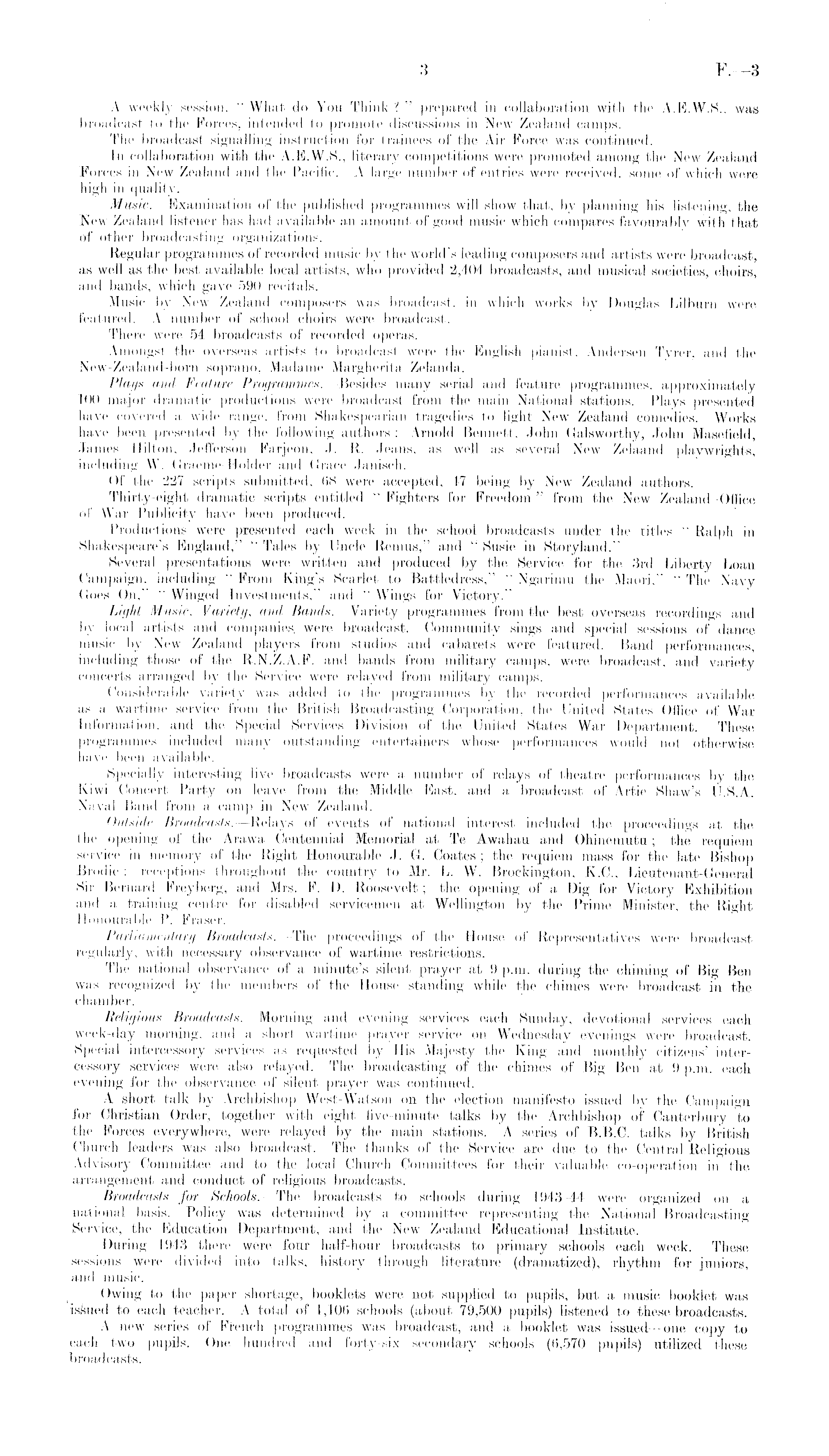A weekly session, " What do You Think ? " prepared in collaboration with the A.E.W.S., was broadcast to the Forces, intended to promote discussions in New Zealand camps. The broadcast signalling instruction for trainees of the Air Force was continued. In collaboration with the A.E.W.S., literary competitions were promoted among the New Zealand Forces in New Zealand and the Pacific. A large number of entries were received, some of which were high in quality. Music. -Examination of the published programmes will show that, by planning his listening, the New Zealand listener has had available an amount of good music which compares favourably with that -of other broadcasting organizations. Regular programmes of recorded music by the world's leading composers and artists were broadcast, as well as the best available local artists, who provided 2,404 broadcasts, and musical societies, choirs, and bands, which gave 590 recitals. Music by New Zealand composers was broadcast, in which works by Douglas Lilburn were featured. A number of school choirs were broadcast. There were 54 broadcasts of recorded operas. Amongst the overseas artists to broadcast were the English pianist, Andersen Tyrer, and the New-Zealand-born soprano, Madame Margherita Zelanda. Plays and Feature Programmes.—Besides many serial and feature programmes, approximately 100 major dramatic productions were broadcast from the main National stations. Plays presented have covered a wide range, from Shakespearian tragedies to light New Zealand comedies. Works have been presented by the following authors : Arnold Bennett, John Galsworthy, John Masefield, James Hilton, Jefferson Farjeon, J. R. Jeans, as well as several New Zelaand playwrights, including W. Graeme-Holder and Grace Janisch. Of the 227 scripts submitted, 68 were accepted, 47 being by New Zealand authors. Thirty-eight dramatic scripts entitled " Fighters for Freedom " from the New Zealand Office of War Publicity have been produced. Productions were presented each week in the school broadcasts under the titles " Ralph in Shakespeare's England," " Tales by Uncle Remus," and " Susie in Storyland." Several presentations were written and produced by the Service for the 3rd Liberty Loan Campaign, including " From King's Scarlet to Battledress," " Ngarimu the Maori," " The Navy Goes On," " Winged Investments," and " Wings for Victory." Light Music, Variety, and Bands.—Variety programmes from the best 1 overseas recordings and by local artists and companies, were broadcast. Community sings atid special sessions of dance music by New Zealand players from studios and cabarets were featured. Band performances, including those of the R.N.Z.A.F. and bands .from military camps, were broadcast, and variety ■concerts arranged by the Service were relayed from military camps. Considerable variety was added to the programmes by the recorded performances available as a wartime service from the British Broadcasting Corporation, the United States Office of War Information, and the Special Services Division of the United States War Department. These programmes included many outstanding entertainers whose performances would not otherwise have been available. Specially interesting live broadcasts were a number of relays of theatre performances by the Kiwi Concert Party on leave from the Middle East, and a broadcast of Artie Shaw's U.S.A. Naval Band from a camp in New Zealand. Outside Broadcasts.—Relays of events of national interest included the proceedings at the the opening of the Arawa Centennial Memorial at Te Awahau and Ohinemutu; the requiem service in memory of the Right Honourable J. G. Coates ; the requiem mass for the late Bishop Brodie ; receptions throughout the country to Mr. L. W. Brockington, K.C., Lieutenant-General Sir Bernard Freyberg, and Mrs. F. D. Roosevelt; the opening of a Dig for Victory Exhibition and a training centre for disabled servicemen at Wellington by the Prime Minister, the Right Honourable P. Fraser. - Parliamentary Broadcasts. —The proceedings of the House of Representatives were broadcast regularly, with necessary observance of wartime restrictions. The national observance of a minute's silent prayer at 9 p.m. during the chiming of Big Ben was recognized by the members of the House standing while the chimes were broadcast in the chamber. Religious Broadcasts. —Morning and evening services each Sunday, devotional services each week-day morning, and a short wartime prayer service on Wednesday evenings were broadcast. Special intercessory services as requested by His Majesty the King and monthly citizens' intercessory services were also relayed. The broadcasting of the chimes of Big Ben at 9 p.m. each •evening for the observance of silent prayer was continued. A short talk by Archbishop West-Watson on the election manifesto issued by the Campaign for Christian Order, together with eight five-minute talks by the Archbishop of Canterbury to the Forces everywhere, were relayed by the main stations. A series of 8.8.C. talks by British Church leaders was also broadcast. The thanks of the Service are due to the Central Religious Advisory Committee and to the local Church Committees for their valuable co-operation in the arrangement and conduct of religious broadcasts. Broadcasts for Schools.—The broadcasts to schools, during 1943-44 were organized on a national basis. Policy was determined by a committee representing the National Broadcasting Service, the Education Department, and the New Zealand Educational Institute. During 1943 there were four half-hour broadcasts to primary schools each week. These sessions were divided into talks, history through literature (dramatized), rhythm for juniors, and music. Owing to the paper shortage, booklets were not supplied to pupils, but a music booklet was issued to each teacher. A total of 1,106 schools (about 79,500 pupils) listened to these broadcasts. A new series of French programmes was broadcast, and a bookle