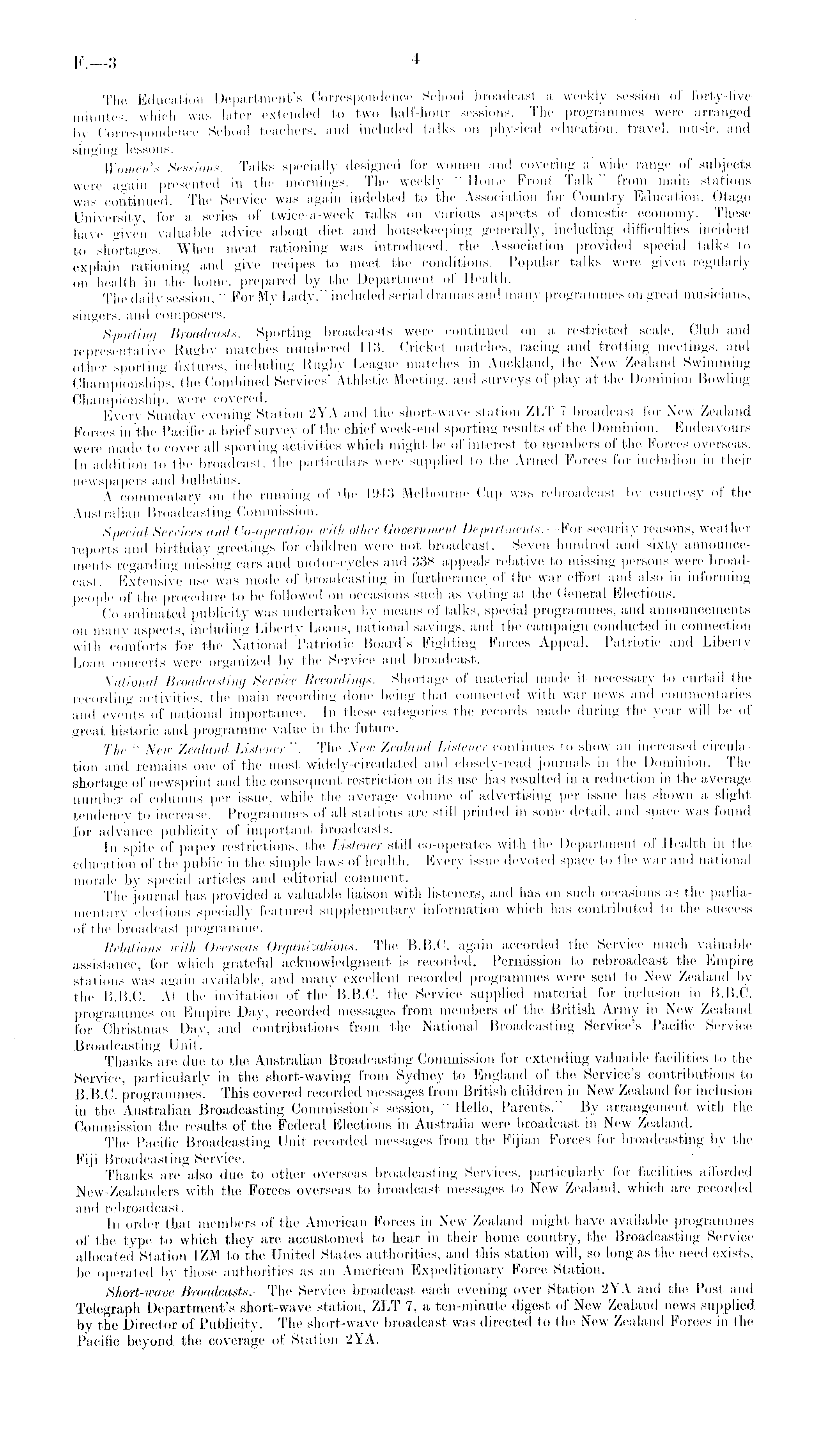 The Education Department's Correspondence School broadcast a weekly session of forty-five minutes, which was later extended to two half-hour sessions. The programmes were arranged by Correspondence School teachers, and included talks on physical education, travel, music, and singing lessons. Women's Sessiom. —Talks specially designed for women and covering a' wide range of subjects were again presented in the mornings. The weekly " Home Front Talk" from main stations was continued. The Service was again indebted to the Association for Country Education, Otago University, for a series of twice-a-week talks on various aspects of domestic economy. These have given valuable advice about diet and housekeeping generally, including difficulties incident to shortages. When meat rationing was introduced, the Association provided special talks to explain rationing and give recipes to meet the conditions. Popular talks were given regularly on health in the home, prepared by the Department of Health. The daily session, " For My Lady," included serial dramas and many programmes on great musicians, singers, and composers. Sporting Broadcasts.—Sporting broadcasts were continued on a restricted scale. Club and representative Rugby matches numbered 113. Cricket matches, racing and trotting meetings, and other sporting fixtures, including Rugby League matches in Auckland, the New Zealand Swimming Championships, the Combined Services' Athletic Meeting, and surveys of play at the Dominion Bowling Championship, were covered. Every Sunday evening Station 2YA and the short-wave station ZLT 7 broadcast for New Zealand Forces in the Pacific a brief survey of the chief week-end sporting results of the Dominion. Endeavours were made to cover all sporting activities which might be of interest to members of the Forces overseas. In addition to the broadcast, the particulars were supplied to the Armed Forces for inoludion in their newspapers and bulletins. A commentary on the running of the 1943 Melbourne Cup was rebroadcast by courtesy of the Australian Broadcasting Commission. Special Services and Co-operation with other Government Departments.—For security reasons, weather reports and birthday greetings for children were not broadcast. Seven hundred and sixty announcements regarding missing cars and motor-cycles and 338 appeals relative to missing persons were broadcast. Extensive use was mode of broadcasting in furtherance of the war effort and also in informing people of the procedure to be followed on occasions such as voting at the General Elections. Co-ordinated publicity was undertaken by means of talks, special programmes, and announcements on many aspects, including Liberty Loans, national savings, and the campaign conducted in connection with comforts for the National Patriotic Board's Fighting Forces Appeal. Patriotic and Liberty Loan concerts were organized by the Service and broadcast. National Broadcasting Service Recordings.—Shortage of material made it necessary to curtail the recording activities,, the main recording done being that connected with war news and commentaries and events of national importance. In these categories the records made during the year will be of great historic and programme value in the future. The " New Zealand Listener ".—The New Zealand Listener continues to show an increased circulation and remains one of the most widely-circulated and closely-read journals in the Dominion. The shortage of newsprint and, the consequent restriction on its use has resulted in a reduction in the average number of columns per issue, while the average volume of advertising per issue has shown a slight tendency to increase. Programmes of all stations are still printed in some detail, and space was found for advance publicity of important broadcasts. In spite of paper restrictions, the Listener still co-operates with the Department of Health in the education of the public in the simple laws of health. Every issue devoted space to the war and national morale by special articles and editorial comment. The journal has provided a valuable liaison with listeners, and has on such occasions as the parliamentary elections specially featured supplementary information which has contributed to the success of the broadcast programme. Relations with Overseas Organizations. The 8.8.C. again accorded the Service much valuable assistance, for which grateful acknowledgment is recorded. Permission to rebroadcast the Empire stations was again available, and many excellent recorded programmes were sent to New Zealand by the 8.8.C. At the invitation of the 8.8.C. the Service supplied material for inclusion in 8.8.C. programmes on Empire Day, recorded messages from members of the British Army in New Zealand for Christmas Day, and contributions from the National Broadcasting Service's Pacific Service Broadcasting Unit. Thanks are due to the Australian Broadcasting Commission for extending valuable facilities to the Service, particularly in the short-waving from Sydney to England of the Service's contributions to 8.8.C. programmes. This covered recorded messages from British children in New Zealand for inclusion in the Australian Broadcasting Commission's session, " Hello, Parents." By arrangement with the Commission the results of the Federal Elections in Australia were broadcast in New Zealand. The Pacific Broadcasting Unit, recorded messages from the Fijian Forces for broadcasting by the Fiji Broadcasting Service. Thanks are also due to other overseas broadcasting Services, particularly for facilities afforded New-Zealanders with the Forces overseas to broadcast messages to New Zealand, which are recorded and rebroadcast. In order that members of the American Forces in New Zealand might have available programmes of the type to which they are accustomed to hear in their home country, the Broadcasting Service allocated Station IZM to the United States authorities, and this station will, so long as the need 