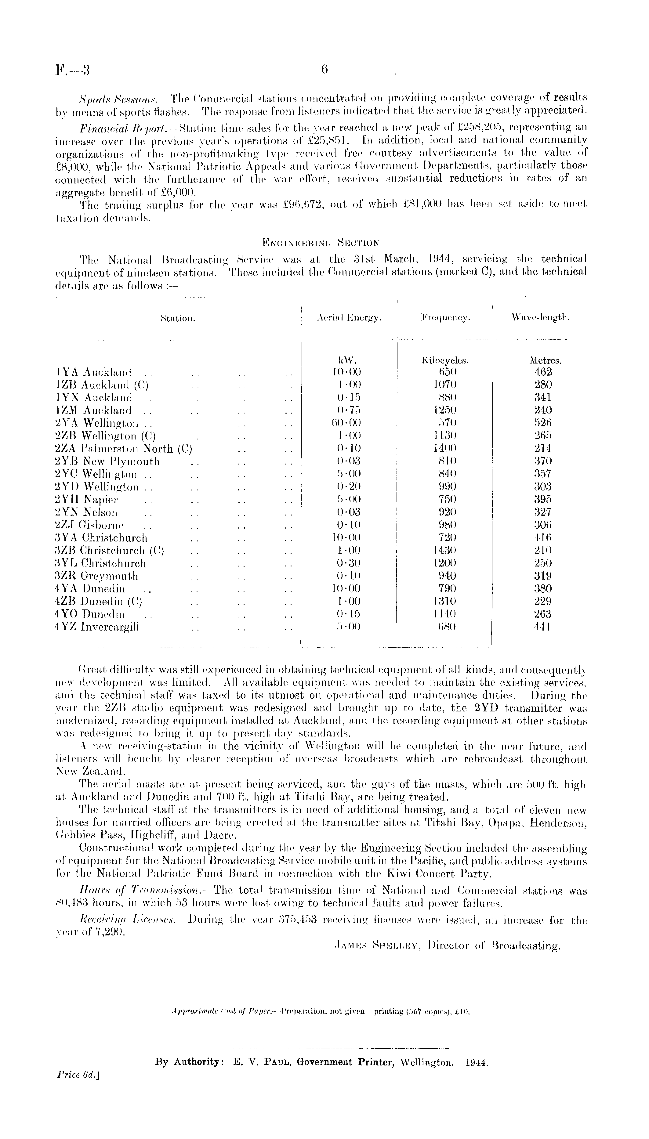 Sports Sessions.—The Commercial stations concentrated on providing complete coverage of results by means of sports flashes. The response from listeners indicated that the service is greatly appreciated. Financial Report. —Station time sales for the year reached a new peak of £258,205, representing an increase over the previous year's operations of £25,851. In addition, local and national community organizations of the non-profitmaking type received free courtesy advertisements to the value of £8,000, while the National Patriotic Appeals and various Government Departments, particularly those connected with the furtherance of the war effort, received substantial reductions in rates of an aggregate benefit of £6,000. The trading surplus for the year was £96,672, out of which £81,000 has been set aside to meet taxation demands. Engineering Section The National Broadcasting Service was at the 31st March, 1944, servicing the technical equipment of nineteen stations. These included the Commercial stations (marked C), and the technical details are as follows : —