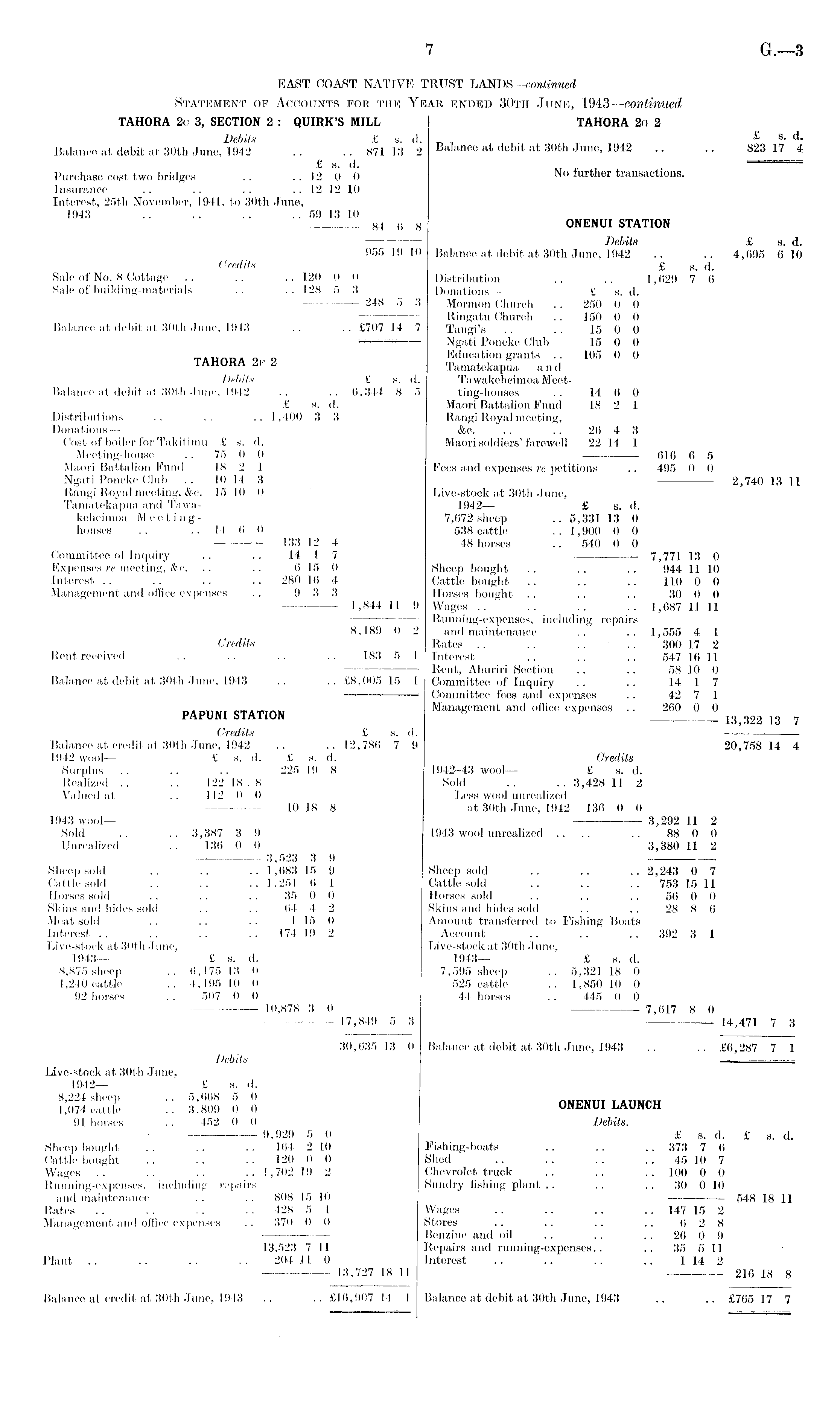 EAST COAST NATIVE TRUST LANDS— Statement op Accounts for the Year ended 30th June, 1943 — continued TAHORA 2o 3, SECTION 2 : QUIRK'S MILL TAHORA 2o 2 Debits £ s d £ s. d. Balance at debit at 30th June, 1942 .. . . 871 13 2 Balance at debit at 30th June, 1942 .. .. 823 17 4 £ b. d. T . — Purchase cost two bridges .. .. 12 0 0 No ™rther transactions. Insurance .. .. .. .. 12 12 10 Interest, 25th November, 1941, to 30th June, 1943 .. .. .. .. 59 13 10 84 6 8 ONENUI STATION Debits £ s. d. 955 19 10 Balance at debit at 30th June, 1942 .. .. 4,095 610 Credits £ s . d. Sale of No. 8 Cottage .. .. .. 1.20 0 0 Distribution .. .. 1,629 7 6 Sale of building-materials .. .. 128 5 3 Donations — £ s. d. 248 5 3 Mormon Church . . 250 0 0 Ringatu Church . . 150 0 0 Balance at debit at 30th June, 1943 .. .. £707 14 7 Tangi's .. .. 15 0 0 i Ngati Poneke Club 15 0 0 TAHORA 9r 9 Education grants .. 105 0 0 IAHUKA £B & Tamatekapua and Debits £ s, d. Tawakeheimoa MeetBalance at debit at 30th June, 1942 .. .. 6,344 8 5 ting-houses .. 14 6 0 £ s. d. Maori Battalion Fund 18 2 1 Distributions .. .. .. 1,400 3 3 Rangi Royal meeting, Donations— &c. .. .. 26 4 3 Cost of boiler for Takitimii £ s. d. Maori soldiers'farewell 22 14 1 Meeting-house . . 75 0 0 • 616 6 5 Maori Battalion Fund 18 2 1 Fees and expenses re petitions .. 495 0 0 Ngati Poneke Club .. 10 14 3 2,740 13 11 Rangi Royal meeting, &c. 15 10 0 Live-stock at 30th June, Tamatekapua and Tawa- 1942— £ s. d. koheimoa Meeting- 7,672 sheep .. 5,331 13 0 houses .. .. 14 0 0 538 cattle ..1,900 0 0 133 12 4 48 horses .. 540 0 0 Committee of Inquiry ... .. 14 1 7 7,771 13 0 Expenses re meeting, &c. .. .. 615 0 Sheep bought .. .. .. 944 11 10 Interest .. .. .. 280 16 4 Cattle bought .. .. .. 110 0 0 Management and office expenses .. 9 3 3 Horses bought .. .. .. 30 0 0 — 1,844 11 9 Wages .. .. .. .. 1,687 11 11 ■ — Running-expenses, including repairs 8,189 0 2 and maintenance .. .. 1,555 4 1 Credits Rates .. .. .. .. 300 17 2 Rent received .. .. .. .. 183 5 1 Interest .. .. .. 547 16 11 Rent, Ahuriri Section .. .. 58 10 0 Balance at debit at 30th June, 1943 .. .. £8,005 15 1 Committee of Inquiry .. .. 14 1 7 ™==»=sB«», Committee fees and expenses .. 42 7 1 PAPUNI STATION Management and office expenses .. 260 ° ° ls 7 Credits £ s. d. Balance at credit at 30th June, 1942 .. .. 12,786 7 9 20,758 14 4 1942 wool— £ s. d. £ s. d. Credits Surplus .. .. .. 225 19 8 1942-43 wool— £ s. d. Realized .. .. 122 18,8 Sold .. ..3,428 11 2 Valued at .. 112 0 0 Less wool unrealized 10 18 8 at 30th June, 1942 136 0 0 1943 wool— 3,292 11 2 Sold .. .. 3,387 3 9 1943 wool unrealized .... .. 88 0 0 Unrealized .. 136 0 0 3,380 11 2 3,523 3 9 Sheep sold .. .. .. 1,683 15 9 Sheep sold .. .. .. 2,243 0 7 Cattle sold .. .. .. 1,251 6 1 Cattle sold .. .. .. 753 15 11 Horses sold .. .. .. 35 0 0 Horses sold .. .. .. 56 0 0 Skins and hides sold . . .. 64 4 2 Skins and hides sold .. .. 28 8 6 Meat sold ... .. .. I 15 0 Amount transferred to Fishing Boats Interest .. .. .. .. 174 19 2 Account .. .. .. 392 3 1 Live-stock at 30th June, Live-stock at 30th June, 1943— £ s. d. 1943— £ s. d. 8,875 sheep .. 6,175 13 0 7,595 sheep .. 5,32118 0 1,240 cattle .. 4,195 10 0 525 cattle .. 1,850 10 0 92 horses .. 507 0 0 44 horses .. 445 0 0 10,878 3 0 7,617 8 0 17,849 5 3 14,471 7 3 30,635 13 0 Balance at debit at 30th June, 1943 .. ... £6,287 7 1 Debits - - Live-stock at 30th June, 1942— £ s. d. 8,224 sheep .. 5,608 5 0 ...mn,.™™ 1,074 cattle .. 3>09 0 0 ONENUI LAUNCH 91 horses .. 452 0 0 Debits. 9,929 5 0 £ s. d. £ s, d. Sheep bought .. .. .. 164 210 Fishing-boats .. .. .. 373 7 6 Cattle bought .. .. .. 120 0 0 Shed .. .. .. .. 45 10 7 Wages .. .. .. .. 1,702 19 2 Chevrolet truck .. .. .. 100 0 0 Running-expenses, including repairs Sundry fishing plant .. .. .. 30 0 10 and maintenance .. .. 808 15 10 548 18 11 Rates .. .. .. .. 428 5 1 Wages .. .. .. .. 147 15 2 Management and office expenses .. 370 0 0 Stores .. .. .. .. 6 2 8 Benzine and oil .. .. 26 0 9 13,523 711 Repairs and running-expenses.. .. 35 511 Plant .. .. .. .. 204 11 0 Interest .. .. .. .. 1 14 2 13,727 18 11 216 18 8 Balance at credit at 30th June, 1943 .. ..£16,907 14 I Balance at debit at 30th June, 1943 .. .. £765 17 7