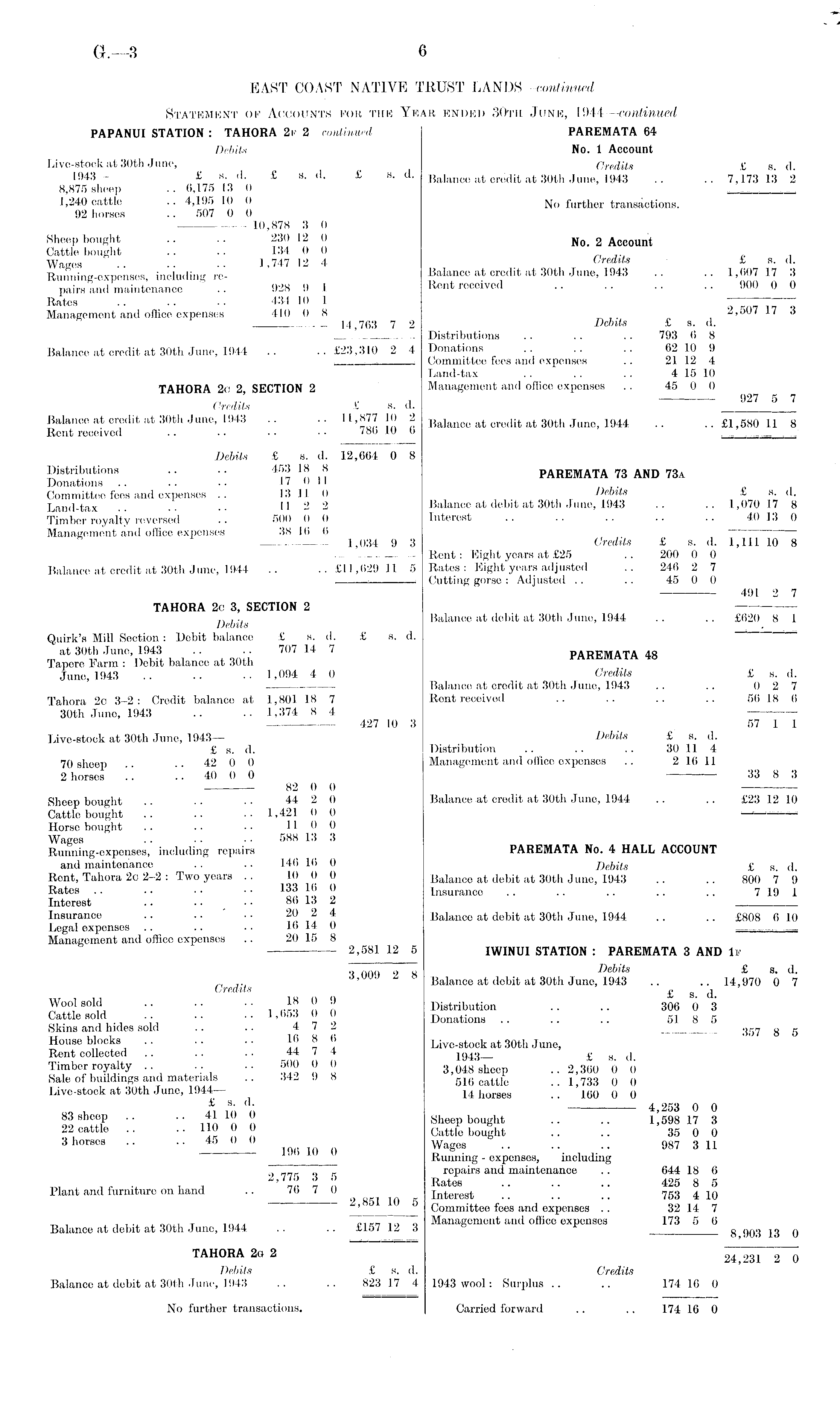 EAST COAST NATIVE TRUST LANDS— continued Statement of Accounts for the Year ended 30th June, 1944— continued PAPANUI STATION : TAHORA 2i' 2 continued PAREMATA 64 Debits No. 1 Account Live-stock at 30th June, Credits £ s. d. 1943— £ a. (1. £ s. d. £ B. d. Balance at crodit at 30th June, 1943 .. .. 7,173 13 2 8,875 sheep .. 6,175 13 0 _.'. 1,240 cattle .. 4,195)0 0 No further transactions. 92 horses .. 507 0 0 10,878 3 0 Sheep bought .. .. 230 12 0 No 2 Account Cattle bought .. .. 134 0 0 Wages .. .. •• 1,747 12 4 Credits £ s. d. Running-expenses, including re- Balance at credit at 30th June, 1943 .. .. 1,607 17 3 pairs and maintenance .. 928 9 1 Rent received 900 0 0 Rates .. .. .. 434 10 1 _ Management and office expenses 410 0 8 2,507 17 3 14. 763 7 2 Debits £ s. d. Distributions .. .. .. 793 6 8 Balance at credit at 30th June, 1944 .. ..£23,310 2 4 Donations .. .. .. 62 10 9 -- Committee fees and expenses .. 21 12 4 Land-tax . . .. .. 4 15 10 TAHORA 2c 2 SECTION 2 Management and office expenses .. 45 0 0 , 927 5 7 Credits i s. d. Balance at credit at 30th June, 1943 .. .. 11,877 10 2B j t credit at 30th j 1944 _ _ £1 580 ~ 8 Rent received .. .. •• •• 786 10 6 __L - Debits £ s. d. 12,664 0 8 Distributions .. .. 453 18 8 PAREMATA 73 AND 73a Donations ...... 17 011 Committee foes and expenses .. 13 11 0 Debits £ s. d. Land-tax .. .. •• II 22 Balance at debit at 30th Juno, 1943 .. .. 1,070 17 8 Timber royalty reversed .. 500 0 0 Interest .. .. .. .. .. 40 13 0 Management and office expenses 38 16 6 1,034 9 3 Credits £ s. d. 1,111 10 8 Rent: Eight years at £25 .. 200 . 0 0 Balance at credit at 30th June, 1944 .. ..£11,029 11 5 Rates : Eight years adjusted .. 246 2 7 ;=== Cutting gorse : Adjusted .. .. 45 0 0 491 2 7 TAHORA 2c 3, SECTION 2 „ ~, Balance at debit at 30th June, 1944 .. .. £620 8 1 Debus Quirk's Mill Section : Debit balance £ s. d. £ s. d. at 30th June 1943 707 14 7 PAREMATA 48 Tapere Farm : Debit balance at 30th June 1943 .. •• •• 1,094 4 0 Credits £ s. d. Balance at credit at 30th June, 1943 .. .. 0 2 7 Tahora 2c 3-2: Credit balanoo at 1,801 18 7 Rent received .. .. .. .. 56 18 6 30th June, 1943 .. .. 1,374 8 4 — 427 10 3 57 1 I Live-stock at 30th June, 1943— Debits £ s. d. £ s. d. Distribution .. .. .. 30 11 4 70 sheep .. .. 42 0 0 Management and office oxpenses .. 216 11 2 horses '.'. .. 40 0 0 33 8 3 82 0 0 Sheep bought .. .. . ■ 44 2 0 Balance at credit at 30th June, 1944 .. .. £23 12 10 Cattle bought .. .. .. 1,421 0 0 —■ Horse bought .. .. . • 110 0 Wages 588 13 3 Running-expenses, including repairs PAREMATA No. 4 HALL ACCOUNT and maintenance .. .. 146 10 0 Debits £ g, d. Rent, Tahora 2o 2-2 : Two years .. 10 0 0 Balance at debit at 30th June, 1943 .. .. 800 7 9 Rates .. .. .. • • 133 16 0 Insuranco .. .. .. .. .. 719 1 Interest .. .... 86 13 2 Insurance .. .. •• 20 2 4 Balance at debit at 30th June, 1944 .. .. £808 610 Legal expenses .. .. .. 16 14 0 ____^__^ Management and offico expenses .. 20 15 8 2,581 12 5 IWINUI STATION : PAREMATA 3 AND U o nn Q 9 « Debits £ s. d. „ ... ■ s ' ulM A ° Balance at debit at 30th June, 1943 .. .. 14,970 0 7 Credits £ s d Wool sold , J! 2 n Distribution .. .. 306 6 3 Cattle sold .. .. 1,653 0 0 Donations 51 8 5 Skins and hides sold .. .. 4 / A g g House blocks .. .. .. 16 8.6 Live-stock at 30th June, Rent collected .. .. .. 44 7 4 £ s d Timber royalty . .. .. 500 0 0 3,048 sheep ..2,360 6 6 Sale of buildings and materials .. 342 9 8 516 cattle ..1,733 0 0 Live-stock at 30th June, 1944 — 14 horses 160 0 0 £ s. d. 4 253 q o 83 sheep .. . 41 10 0 Sheep bought .. .. 17 3 22 cattle .. .. 110 O 0 Cattle bought .., .. 35 0 0 3 horses • • • ■ 45 ° ° , % .„ Wages 987 311 Running - expenses, including __„ „ I repairs and maintenance .. 644 18 6 ,y. i, t. 'la t a Rates .. .. .. 425 8 5 Plant and furniture on hand .. 76 7 0 r Interest 753 410 ' ° Committee fees and expenses .. 32 14 7 . ~-,, .„ 0 Management and office expenses 173 5 6 Balance at debit at 30th Juno, 1944 .. .. £157 12 3 c g ( j A g jg Q TAHORA 2G 2 24,231 2 0 Debits £ s. d. Credits Balance at debit at 30th June, 1943 .. .. 823 17 4 1943 wool: Surplus.. .. 174 16 0 No further transactions. Carried forward .. .. 174 16 0