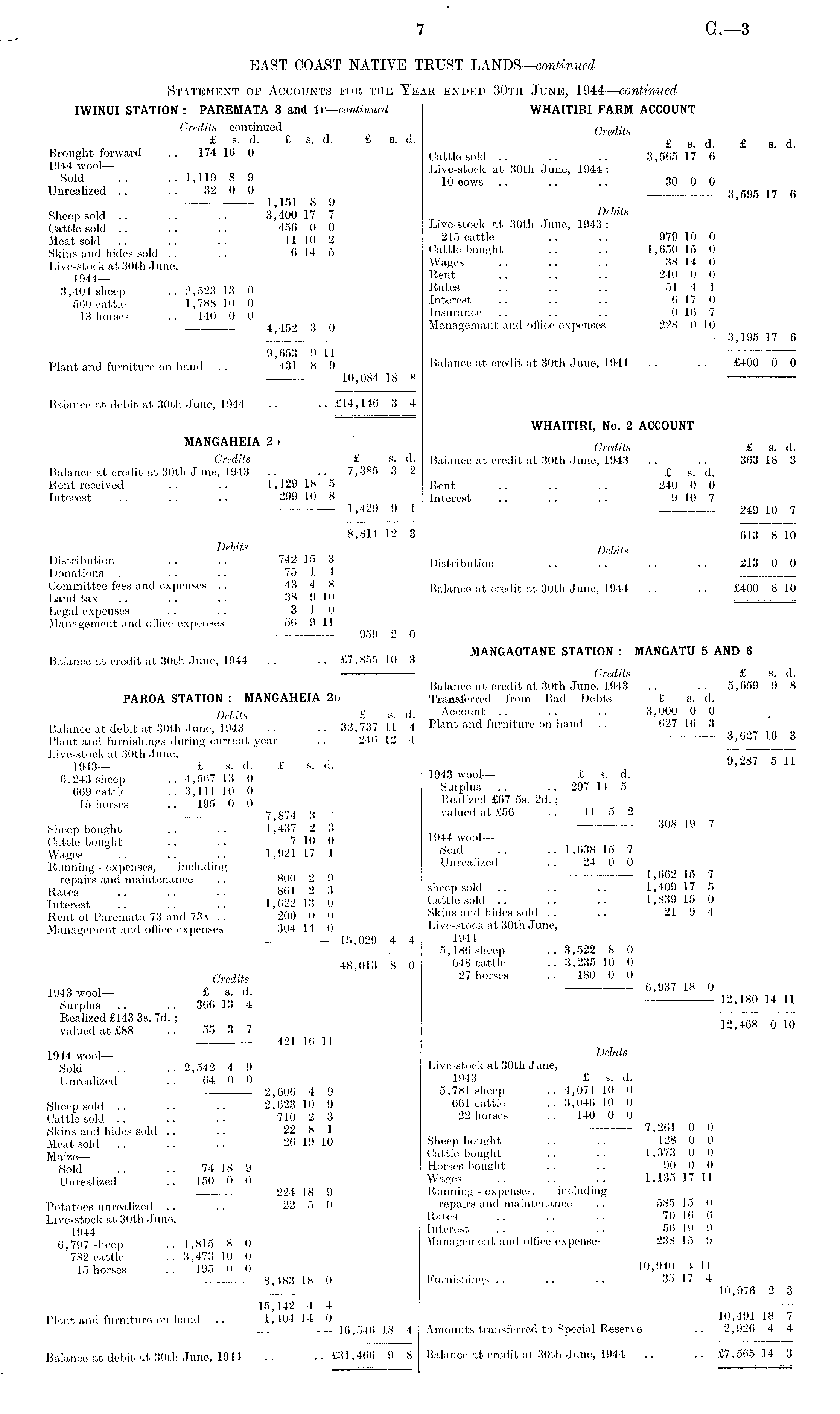 EAST COAST NATIVE TRUST LANDS—continued Statement of Accounts for the Year ended 30th June, 1944 — continued IWINUI STATION : PAREMATA 3 and If— continued WHAITIRI FARM ACCOUNT Credits —continued Credits £ s. d. £ s. d. £ s. d. £ s. d. £ s d. Brought forward .. 174 16 0 Cattle sold .. .. .. 3,565 17 6 1944 wool— Live-stock at 30th Juno, 1944 : TT Sol( * , •• •• I'lH1 ' 1 H * » lOcows 30 0 0 Unrealized .. .. SZ 0 0 o kok i 7 a 1,151 8 9 ' Sheep sold .. .. .. 3,400 17 7 Deblts Cattle sold .. .. .. 456 0 0 Live-stock at 30th June, 1943 : Meat sold 11 10 2 215 cattle .. .. 979 10 0 Skins and hides sold .. .. 6 14 5 Cattle bought .. .. 1,650 15 0 Live-stock at 30th June, W a S es •• •• ■• ,?° l * X 1944 _ Rent .. .. .. 240 0 0 3,404 sheep .. 2,523 13 0 Rates •• •• •■ 51 4 1 560 cattle 1,788 10 0 Interest .. .. .. 6 17 0 13 horses .. 140 0 0 Insurance .. .. .. 016 7 4 459 3 0 Managomant and ollice expenses 228 0 10 J . 3,195 17 6 9,653 9 11 Plant and furniture on hand .. 431 8 9 Balance at credit at 30th June, 1944 .. .. £400 0 0 10,084 18 8 Balance at debit at 30th June, 1944 .. .. £14,146 3 4 WHAITIRI, No. 2 ACCOUNT MANGAHEIA2i> OfMU £ fc .^ Credits £ s. d. Balance at credit at 30th June, 1943 .. .. 363 18 3 Balance at credit at 30th June, 1943 .. 7,385 3 2 £ s. d. Rent received .. .. 1,129 18 5 Rent .. .. .. 240 0 0 Interest .. .. .. 299 10 8 Interest .. .. .. 9 10 7 1,429 9 1 249 10 7 8,814 12 3 613 8 10 Debits ■ DtUU Distribution .. .. 742 15 3 Distribution .. .. .. .. 213 0 0 Donations .. .. .. 75 1 4 Committee fees and expenses .. 43 4 8 Balance at credit at 30th June, 1944 .. .. £400 810 Land-tax .. .. .. 38 9 10 - Legal expenses .. .. 3 10 Management and office expenses 56 9 11 959 2 0 „„ „„ ,„ „ MANGAOTANE STATION : MANGATU 5 AND 6 Balance at credit at 30th June, 1944 .. .. £7,855 10 3 — Credits £ s. d. Balance at credit at 30th June, 1943 .. .. 5,659 9 8 PAROA STATION : MANGAHEIA 2d Transferred from Bad Debts £ s. d. Debits £ S. d. Account .. .. .. 3,000 0 0 Balance at debit at 30th June, 1943 .. .. 32,737 11 4 Plant and furniture on hand .. 627 16 3 Plant and furnishings during current year .. 246 12 4 d > bzl lfa A Live-stock at 30th June, n 0 „_ _ ~ 1943- £ s. d. £ s. d. 9 .287 511 6,243 sheep ..4,567 13 0 1943 wool- £ s d. 669 cattle ..3,11110 0 | nr $ nB J ™ r „/• 297 U 5 15 horses .. 195 0 0 Realized £67 ss. 2d.; , 7 §74 3 > valued at £56 .. II 0 2 Sheep bought .. .. M 37 2 3 ,„,, , ' 3 ° B 19 7 Cattle bought .. .. 7 10 0 1944 wool— , aoo ,« - Wages 1,92117 1 Sold .. ..1,638 15 7 Running - expenses, including Unrealized .. 24 0 0 repairs and maintenance .. 800 2 9 \<™® ]° I Rates 861 2 3 sheep sold 1,409 17 5 Interest .. 1,622 13 0 Cattle sold .. .. .. 1,839 15 0 Rent of Paromata 73 and 73a .. 200 0 0 Skins and hides sold .. .. 21 9 4 Management and office expenses 304 14 0 Live-stock at 30th June, 15,029 4 4 1944— 5,186 sheep .. 3,522 8 0 48,013 8 0 648 cattle .. 3,235 10 0 Credits 27 horses .. 180 0 0 1943 wool— £ s. d. 6 '937 18 <> Surplus .. .. 366 13 4 12 - 180 U U Realized£l43 3s. 7d.; ~ ... „ .„ valued at £88 .. 55 3 7 lZ ' ibH °1U — 421 16 11 1944 wool— I)eUla gold #- _, 2,542 4 9 Live-stock at 30th June, Unrealized" '.'. ' 64 0 0 1943— £ s. d. 2,606 4 9 5,781 sheep .. 4,074 10 0 Sheep sold .. .. .. 2,623 10 9 661 cattle .. 3,046 10 0 Cattle sold .. .. .. 710 2 3 22 horses .. 140 0 0 Skins and hides sold .. .. 22 8 1 7,261 0 0 Meat sold 26 19 10 Sheep bought .. .. 128 0 0 ]y a j ze Cattle bought .. .. 1,373 0 0 Sold .. .. 74 18 9 Horses bought .. .. 90 0 0 Unrealized" '.'. 150 0 0 Wages .. .. .. 1,135 17 11 224 18 9 Running - expenses, including Potatoes unrealized .. .. 22 5 0 repairs and maintenance .. 585 15 0 Live-stock at 30th June, Rates .. 70 16 6 1944 Interest .. .. .. 56 19 9 6 797 sheep .. 4,815 8 0 Management and office expenses 238 15 9 '782 cattle .. 3', 473 10 0 . 15 horses .. 195 0 0 10,940 411 8,483 18 0 Furnishings .. .. .. 35 17 4 . . 10,976 2 3 15,142 4 4 Plant and furniture on hand .. 1,404 14 0 10,49118 7 16,546 18 4 Amounts transferred to Special Reserve .. 2,926 4 4 Balance at debit at 30th June, 1944 .. .. £31,466 9 8 Balance at credit at 30th June, 1944 .. .. £7,565 14 3