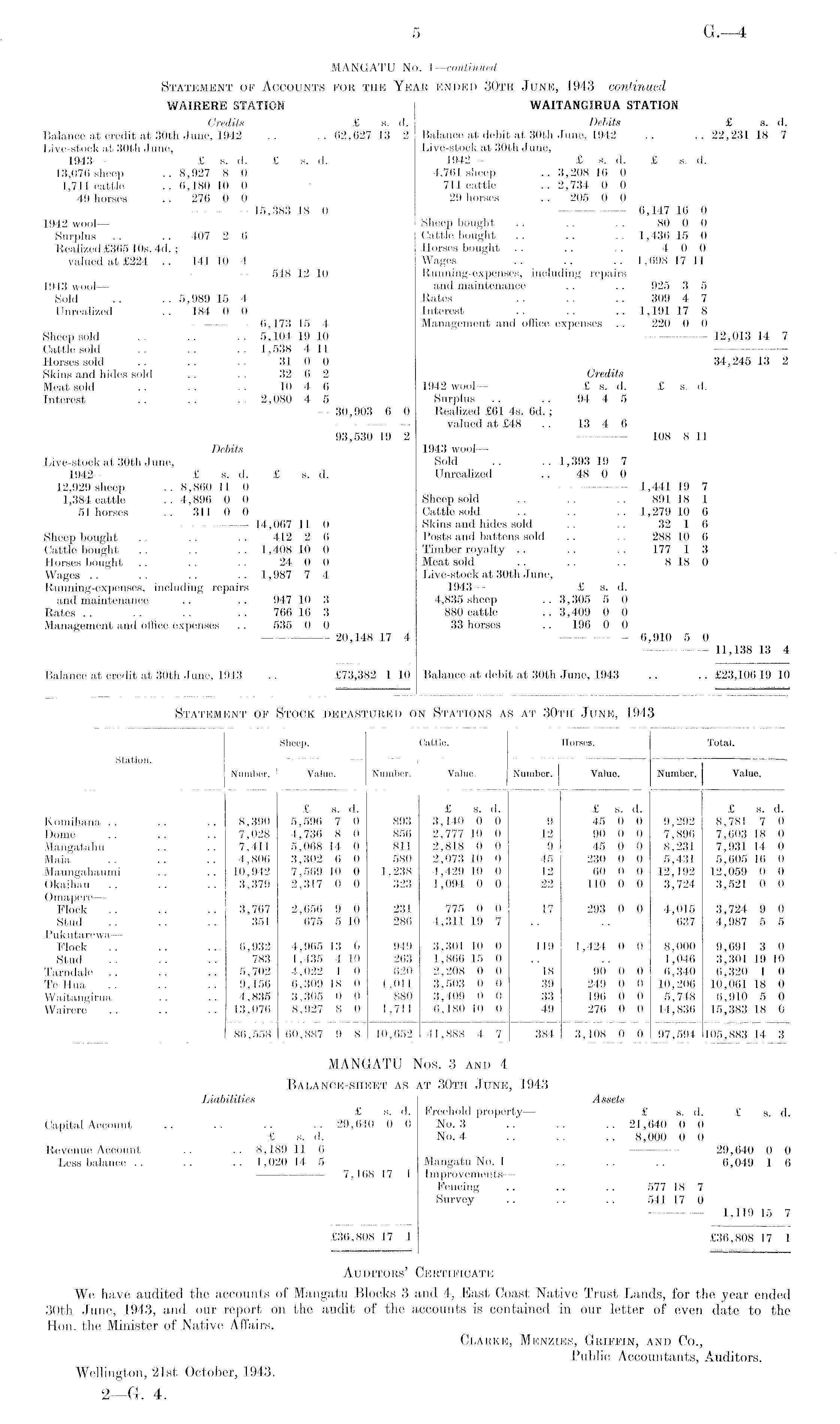 MANGATU No. I—continued Statement op Accounts for the Year ended 30th June, \943--continued WAIRERE STATION WAITANGIRUA STATION Credits £ s. d. Debits £ s. d. Balance at credit at 30th June, 1942 .. .. 62,627 13 2 Balance at debit at 30fch June, 1942 .. .. 22,231 18 7 Live-stock at 30th June, Live-stock at 30th June, 1943 — £ s. d. £ s. d. 1942 — £ s. d. £ s. d. 13,076 sheep .. 8,927 8 0 4,761 sheep .. 3,208 16 0 1,711 cattle .. 6,180 10 0 " 711 cattle .. 2,734 0 0 49 horses .. 276 0 0 29 horses .. 205 0 0 15,383 18 0 6,147 16 0 1942 wool— Sheep bought .. .. . . 80 0 0 Surplus .. .. 407 2 6 Cattle bought .. .. .. 1,436 15 0 Realized £365 10s. 4d. ; Horses bought .. .. . . 4 0 0 valued at £224 .. 141 10 4 Wages .. .. .. 1,698 17 11 548 12 10 Running-expenses, including repairs 1943 wool— and maintenance .. .. 925 3 5 Sold .. .. 5,989 15 4 Rates .. .. .. 309 4 7 Unrealized .. 184 0 0 Interest . . .. ..1,191178 6,173 15 4 Management and office expenses .. 220 0 0 Sheep sold .. .. .. 5,104 19 10 12,013 14 7 Cattle sold .. .. .. 1,538 411 Horses sold .. .. .. 31 0 0 34,245 13 2 Skins and hides sold .. . . 32 6 2 Credits Meat sold . . . . . . 10 4 6 1942 wool— £ s. d. £ s. d. Interest . . .. . . 2,080 4 5 Surplus .. .. 94 4 5 - — 30,903 6 0 Realized £61 4s. 6d.; valued at £48 .. 13 4 6 93,530 19 2 108 8 11 Debits 1943 wool— Live-stock at 30th June, Sold .. .. 1,393 19 7 1942 — £ s. d. £ s. d. Unrealized .. 48 0 0 12,929 sheep .. 8,860 11 0 1,441 19 7 1,384 cattle .. 4,896 0 0 Sheep sold .. .. .. 891 18 1 51 horses .. 311 0 0 Cattle sold .. .. .. 1,279 10 6 — 14,067 11 0 Skins and hides sold .. .. 32 1 6 Sheep bought .. . . .. 412 2 6 Posts and battens sold .. .. 288 10 6 Cattle bought .. .. .. 1,408 10 0 Timber royalty .. .. .. 177 1 3 Horses bought .. . . . . 24 0 0 Meat sold .. .. .. 8 18 0 Wages .. .. .. .. 1,987 7 4 Live-stock at 30th June, Running-expenses, including repairs 1943 — £ s. d. and maintenance .. .. 947 10 3 4,835 sheep .. 3 ,305 5 0 Rates .. .. .. .. 766 16 3 880 cattle .. 3,409 0 0 Management and office expenses .. 535 0 0 33 horses .. 196 0 0 20,148 17 4 6,910 5 0 11,138 13 4 Balance at credit at 30th June, 1943 . . £73,382 1 10 Balance at debit at 30th June, 1943 .. .. £23,106 19 10 Statement of Stock depastured on Stations as at 30th June, 1943 Sheep. Cattle. Horses. Total. Station. — Number. Value. Number. Value. Number. Value. Number. Value. £ s. d. £ s. d. £ s. d. £ s. d. Komihana .. .. .. 8,390 5,596 7 0 893 3,140 0 0 9 45 0 0 9,292 8,781 7 0 Dome .. .. .. 7,028 4,736 8 0 856 2,777 10 0 12 90 0 0 7,896 7,603 18 0 Mangatahu .. .. 7,411 5,068 14 0 811 2,818 0 0 9 45 0 0 8,231 7,931 14 0 Maia .. .. .. 4,806 3,302 6 0 580 2,073 10 0 45 230 0 0 5,431 5,605 16 0 Maungahaumi .. .. 10,942 7,569 10 0 1,238 4,429 10 0 12 60 0 0 12,192 12,059 0 0 Okaihau .. .. .. 3,379 2,317 0 0 323 1,094 0 0 22 110 0 0 3,724 3,521 0 0 Omapere— Flock .. .. .. 3,767 2,656 9 0 231 775 0 0 17 293 0 0 4,015 3,724 9 0 Stud .. .. .. 381 675 510 286 4,31119 7 ..• .. 637 4,987 5 5 Pukutarewa — Flock .. .. ... 6,932 4,965 13 0 949 3,801 10 0 119 1,424 0 0 8,000 9,691 3 0 Stud .. .. .. 783 1,435 410 263 1,866 15 0 .. .. 1,046 3,30119 10 Tarndale .. .. .. 5,702 4,022 1 0 620 2,208 0 0 18 90 0 0 6,340 6,320 I 0 TeHua .. .. .. 9,156 6,309 18 0 1,011 3,503 0 0 39 249 0 0 10,206 10,061 18 0 Waitangirua .. .. 4,835 3,305 0 0 880 3,409 0 0 33 196 0 0 5,748 6,910 5 0 Wairere .. .. .. 13,076 8,927 8 0 1,711 6,180 10 0 49 276 0 0 14,836 15,383 18 0 86,558 60.887 9 8 10,652 41,888 4 7 384 3,108 0 97,594 105,883 14 3 MANGATU Nos. 3 and 4 Balance-sheet as at 30th June, 1943 Liabilities Assets £ s. d. Freehold property — £ s. d. £ s. d. Capital Account .. .. .. .. 29,640 0 0 No. 3 .. .. .. 21,640 0 0 £ s. d. No. 4 .. . . .. 8,000 0 0 Revenue Account .. .. 8,189 11 6 29,640 0 0 Less balance .. .. .. 1,020 14 5 Mangatu No. 1 .. .. .. 6,049 1 6 7,168 17 1 Improvements— Fencing .. .. .. 577 18 7 Survey .. .. .. 541 17 0 1,119 15 7 £36,808 17 1 £36,808 17 1 Auditors' Certificate We have audited the accounts of Mangatu Blocks 3 and 4, East Coast Native Trust Lands, for the year ended 30th June, 1943, and our report on the audit of the accounts is contained in our letter of even date to the Hon. the Minister of Native Affairs. Clarke, Menzies, Griffin, and Co., Public Accountants, Auditors. Wellington, 21st October, 1943.