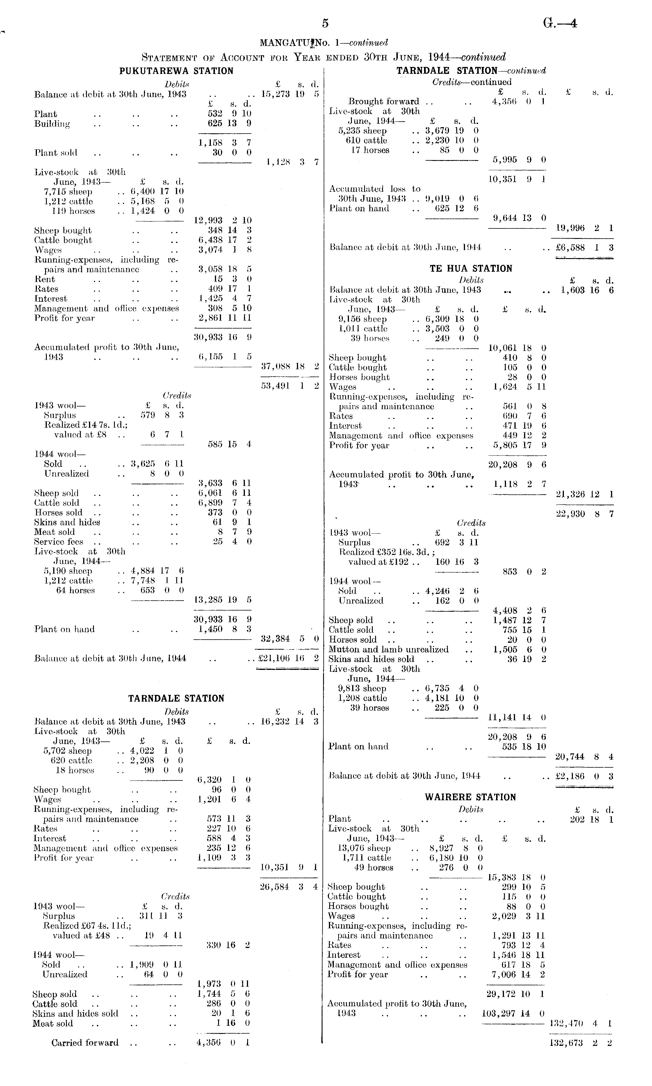 MAN GATIT JN o. I—continued Statement of Account for Yeab ended 30th June, 1944—continued PUKUTAREWA STATION TARNDALE STATlON—continued Debits £ s. d. Credits—continued Balance at debit at 30th June, 1943 .. .. 15,273 19 5 £ s. d. £ s. d. £ s. d. Brought forward . . .. 4,356 0 1 Plant .. .. .. 532 9 10 Live-stock at 30th Building .. .. .. 625 13 9 June, 1944— £ s. d. b 5,235 sheep .. 3,679 19 0 1,158 3 7 610 cattle .. 2,230 10 0 Plant sold .. .. .. '30 0 0 17 horses .. 85 0 0 1,128 3 7 5 >"5 9 0 Live-stock at 30th June, 1943— £ s. d. A 10,351 9 I 7,715 sheep .. 6,400 17 10 Accumulated loss to 1,212 cattle ..5,168 5 0 30th June, 1943 .. 9,019 0 6 119 horses .. 1,424 0 0 Plant on hand .. 625 12 6 12,993 2 10 9 > 644 13 0 Sheep bought .. .. 348 14 3 19,996 2 1 Cattle bought .. .. 6,438 17 2 — Wages _ __ 3,074 1 8 Balance at debit at 30th June, 1944 .. .. £6,588 I 3 Running-expenses, including re- —' —' pairs and maintenance .. 3,058 18 5 TE HUA STATION Rent .. .. .. 15 3 0 Debits £ s. d. Rates .. .. .. 409 17 1 Balance at debit at 30th June, 1943 ... .. 1,603 16 6 Interest .. .. .. 1,425 4 7 Live-stock at 30th Management and office expenses 308 510 June, 1943 — £ s. d. £ s. d. Profit for year .. .. 2,861 11 II 9,156 sheep .. 6,309 18 0 1,011 cattle ..3,503 0 0 30,933 16 9 39 horses .. 249 0 0 Accumulated profit to 30th June, 10,061 18 0 1943 .. .. .. 6,155 1 5 Sheep bought .. .. 410 8 0 37,088 18 2 Cattle bought .. .. 105 0 0 Horses bought .. .. 28 0 0 53,491 1 2 Wages .. .. .. 1,624 5 11 Credits Running-expenses, including re--1943 wool — £ s. d. pairs and maintenance .. 561 0 8 Surplus .. 579 8 3 Rates .. .. .. 690 7 6 Realized£l47s. Id.; Interest .. .. .. 471 19 6 valued at £8 6 7 1 Management and office expenses 449 12 2 585 15 4 Profit for year .. .. 5,805 17 9 1944 wool— Sold .. .. 3,625 611 20,208 9 6 Unrealized .. 8 0 0 Accumulated profit to 30th June, 3,633 6 11 1943' .. .. .. 1,118 2 7 Sheep sold .. .. .. 6,061 611 21,326 12 I Cattle sold .. .. .. 6,899 7 4 Horses sold .. .. .. 373 0 0 22,930 8 7 Skins and hides .. .. 61 9 1 " Credits Meat sold .. .. .. 8 7 9 1943 wool— £ s. d. Service fees .. .. .. 25 4 0 Surplus .. 692 3 11 Live-stock at 30th Realized £352 16s. 3d.; June, 1944— valued at £192 .. 160 16 3 5,190 sheep .. 4,884 17 6 853 0 2 1,212 cattle .. 7,748 1 11 1944 wool— 64 horses .. 653 0 0 Sold .. .. 4,246 2 6 13,285 19 5 Unrealized .. 162 0 0 — 4,408 2 6 30,933 16 9 Sheep sold .. .. .. 1,487 12 7 Plant on hand .. .. 1,450 8 3 Cattle sold .. .. .. 755 15 1 32,384 5 0 Horses sold .. .. .. 20 0 0 Mutton and lamb unrealized .. 1,505 6 0 Balance at debit at 30th June, 1944 .. ..£21,106 16 2 Skins and hides sold .. .. 36 19 2 =— Live-stock at 30tli June, 1944 — 9,813 sheep ..6,735 4 0 TARNDALE STATION 1,208 cattle ..4,18110 0 Debits £ s. d. 39 horses • • 225 0 0 Balance at debit at 30th June, 1943 .. .. 16,232 14 3 11,141 14 0 Live-stook at 30th OA „ Q „ June, 1943— £ s. d. £ s. d. , , , 'fi? 5,702 sheep ..4,022 I 0 Plant on hand .. .. 535 18 10 620 cattle ..2,208 0 0 20,744 8 4 18 horses .. ,)0 0 j q Balance at debit at 30th June, 1944 .. .. £2,186 0 3 Sheep bought .. .. 96 0 0 Wages 1,201 6 4 WAIRERE STATION Running-expenses, including re- Debits £ s. d. pairs and maintenance .. 573 11 3 Plant .. .. .. .. .. 202 18 1 Rates .. .. .. 227 10 6 Live-stock at 30th Interest . . .. .. 588 4 3 June, 1943 — £ s. d. £ s. d. Management and office expenses 235 12 6 13,076 sheep .. 8,927 8 0 Profit for year .. .. 1,109 3 3 1,711 cattle .. 6,180 10 0 10,351 9 1 49 horses .. 276 0 0 15,383 18 0 26,584 3 4 Shoep bought .. .. 299 10 5 Credits Cattle bought .. .. 115 0 0 1943 wool — £ s. d. Horses bought .. .. 88 0 0 Surplus .. 311 11 3 Wages .. .. .. 2,029 311 Realized£67 4s. lid.; Running-expenses, including revalued at £48 .. 19 4 II pairs and maintenance .. 1,291 13 11 330 16 2 Rates .. .. .. 793 12 4 1944 wool— Interest .. .. .. 1,546 18 11 Sold .. .. 1,909 011 Management and office expenses 617 18 5 Unrealized .. 64 0 0 Profit for year .. .. 7,006 14 2 1,973 0 11 — Sheep sold .. .. .. 1,744 5 6 29,172 10 1 Cattle sold .. .. .. 286 0 0 Accumulated profit to 30th June, Skins and hidos sold .. .. 20 1 6 1943 .. .. .. 103,297 14 0 Meat sold .. .. .. 1 16 0 132,470 4 I Carried forward .. .. 4,356 0 1 132,673 22