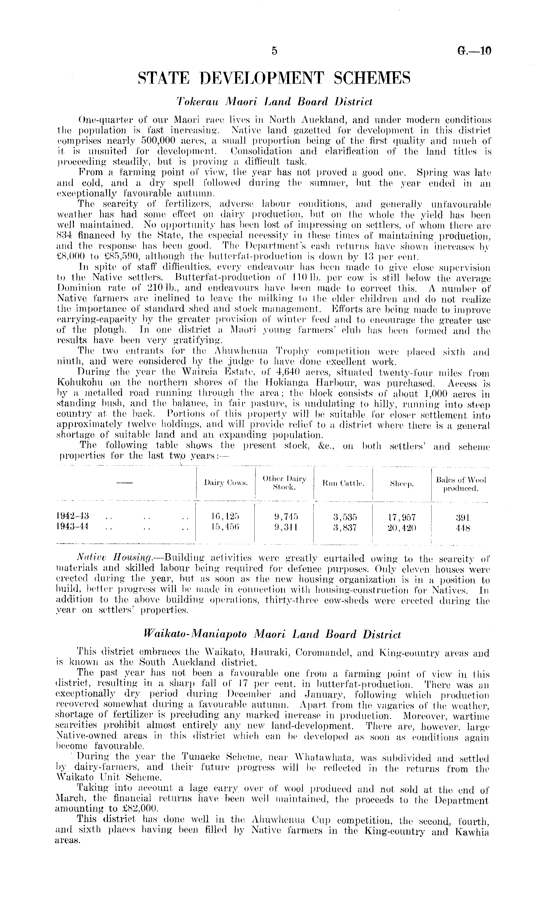 STATE DEVELOPMENT SCHEMES Tokerau Maori Land Board District One-quarter of our Maori race lives in North Auckland, and under modern conditions the population is fast increasing. Native land gazetted for development in this district comprises nearly 500,000 acres, a small proportion being of the first quality and much of it. is unsuited for development. Consolidation and clarification of the land titles is proceeding steadily, but is proving a difficult task. From a farming point of view, the year has not proved a good one. Spring was late and cold, and a dry spell followed during the summer, but the year ended in an exceptionally favourable autumn. The scarcity of fertilizers, adverse labour conditions, and generally unfavourable weather has had some effect on dairy production, but on the whole the yield has been well maintained. No opportunity has been lost of impressing on settlers, of whom there are 834 financed by the State, the especial necessity in these times of maintaining production, and the response has been good. The Department's cash returns have shown increases by £8,000 to £85,590, although the butterfat-production is down by 13 per cent. In spite of staff difficulties, every endeavour has been made to give close supervision to the Native settlers. Butterfat-production of 1101b. per cow is still below the average Dominion rate of 2101b., and endeavours have been made to correct this. A number of Native farmers are inclined to leave the milking to the elder children and do not realize the importance of standard shed and stock management. Efforts are being made to improve carrying-capacity by the greater provision of winter feed and to encourage the greater use of the plough. In one district a Maori young farmers' club has been formed and the results have been very gratifying. The two entrants for the Ahuwhenua Trophy competition were placed sixth and ninth, and were considered by the judge to have done excellent work. During the year the Waireia Estate, of 4,640 acres, situated twenty-four miles from Kohukohu on the northern shores of the Hokianga Harbour, was purchased. Access is by a metalled road running through the area; the block consists of about 1,000 acres in standing bush, and the balance, in. fair pasture, is undulating to hilly, running into steep country at the back. Portions of this property will be suitable for closer settlement into approximately twelve holdings, and will provide relief to a district where there is a general shortage of suitable land and an expanding population. The following table shows the present stock, &c., on both settlers' and scheme properties for the last twp years:—